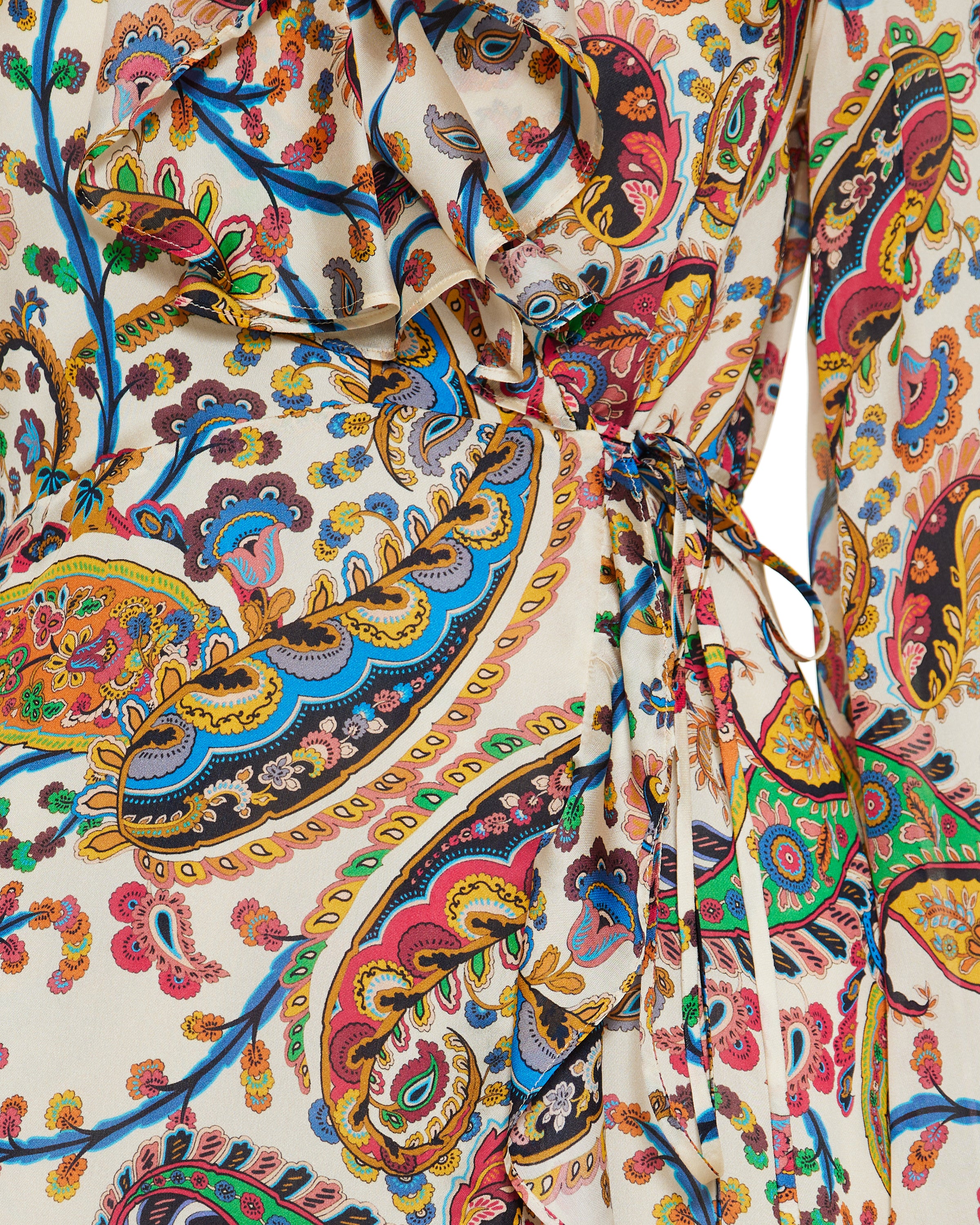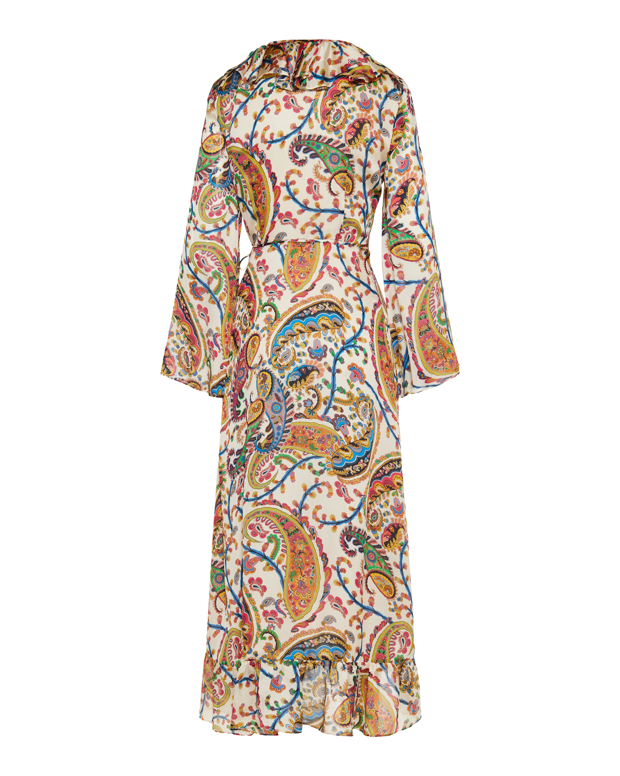 A fluid midi wrap dress in luxurious silk with a vibrant paisley print and delicate ruffled trim for soft, elegant movement. Designed for elevated daytime and refined evening wear, it features a wrap‑around silhouette with a tie waist that ensures a flattering, adjustable fit. Its artisanal pattern and lightweight drape embody timeless bohemian sophistication.