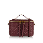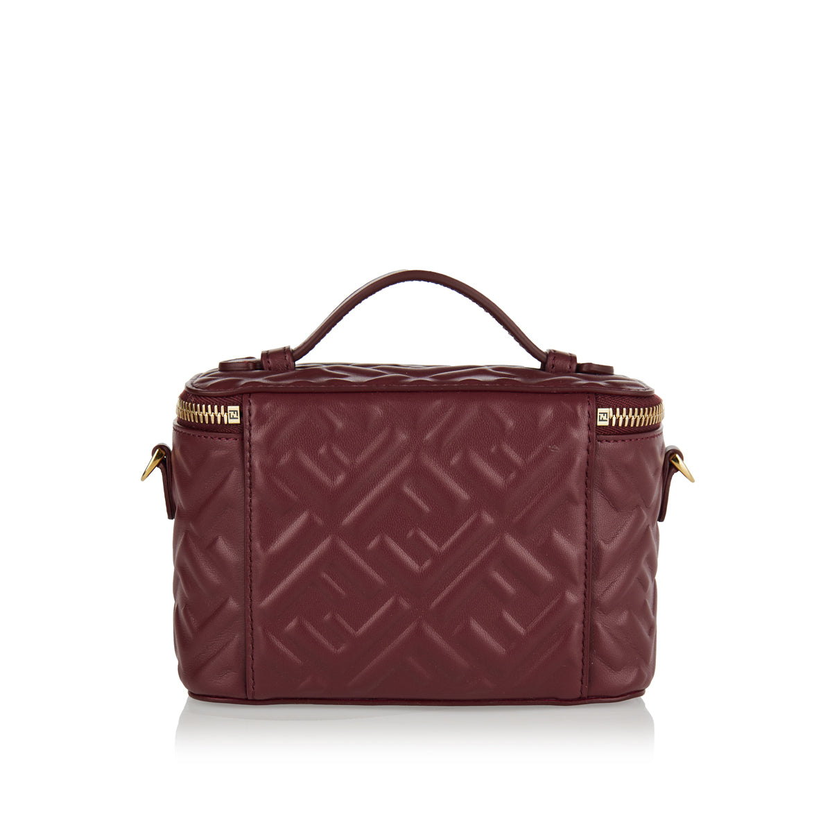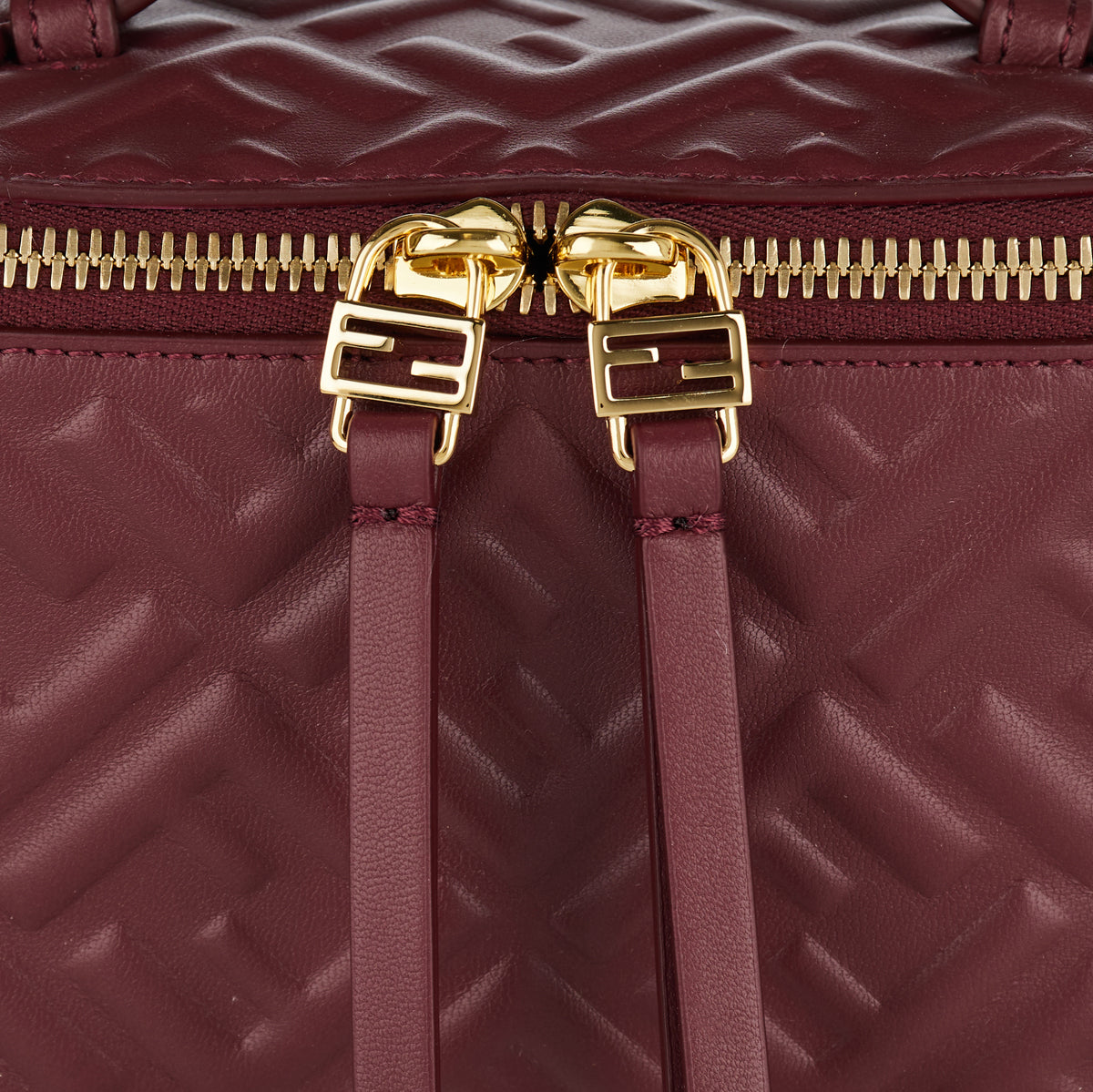 Fendi Vanity mini bag in burgundy nappa leather with embossed FF motif, featuring a top handle, zip closure, and detachable shoulder strap.