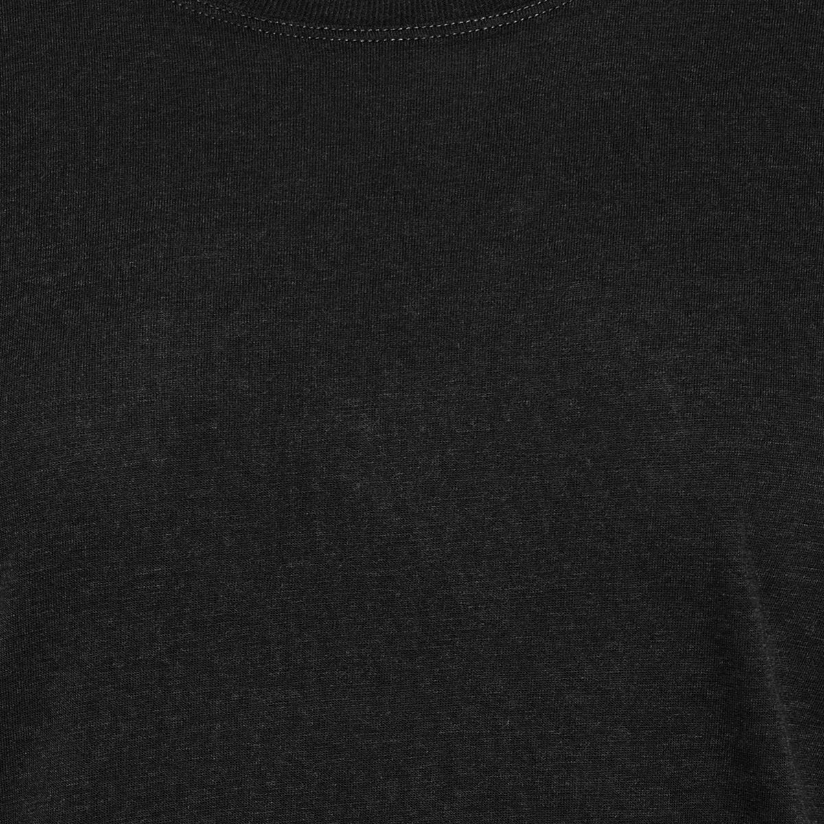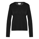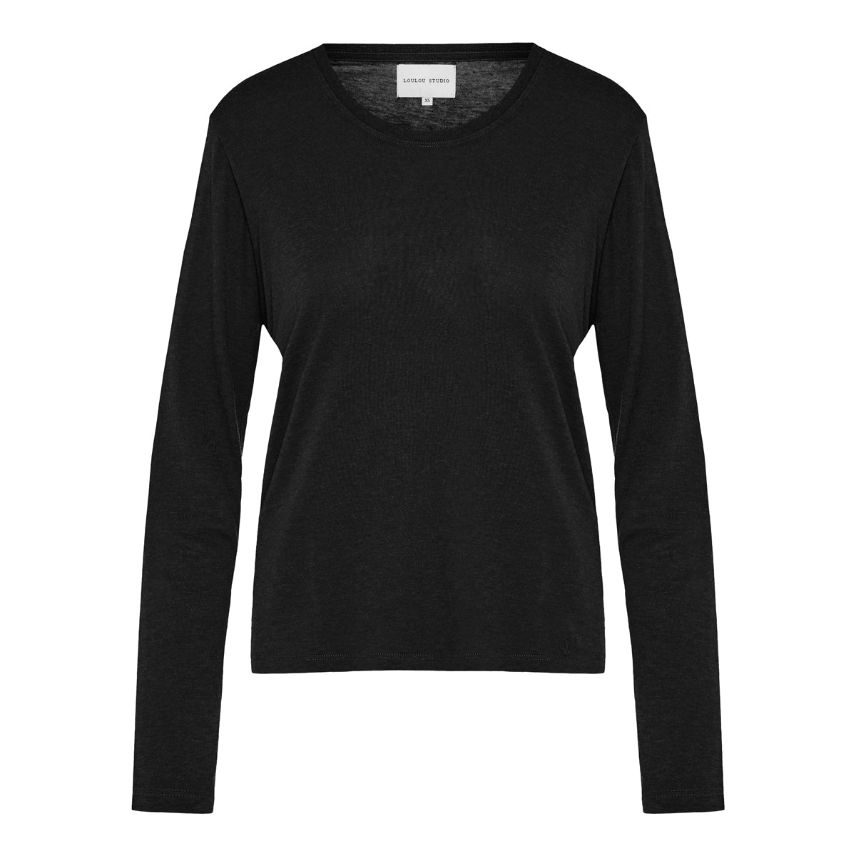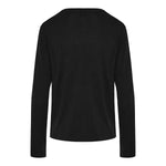 A refined long-sleeve top in a black viscose-wool blend, combining comfort and elegance for everyday use or relaxed layering. Designed with a rib-knit crew neck, dropped shoulders, and signature logo embroidery at the front hem, it offers a luxe finish in a versatile neutral tone.