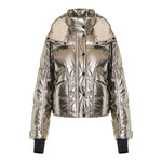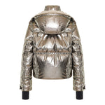 The Calaque metallic hooded down ski jacket offers refined alpine-ready elegance, ideal for cold-weather citywear or ski-resort escape. Its water-repellent metallic-finish fabric, detachable hood, and down-filled insulation ensure warmth and style, while functional details like a ski-pass sleeve pocket and protective powder skirt make it equally suited for slopes or winter city walks.