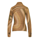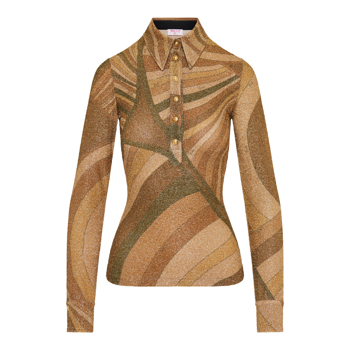This Pucci Iride-print top is crafted from shimmering lamé jersey, radiating effortless sophistication with every movement. Its lightweight and stretchy silhouette is enhanced by the maison’s iconic swirling multicolor motif, adding a touch of bold vibrancy. A versatile statement piece, it transitions seamlessly from evening styling to elevated resort looks.