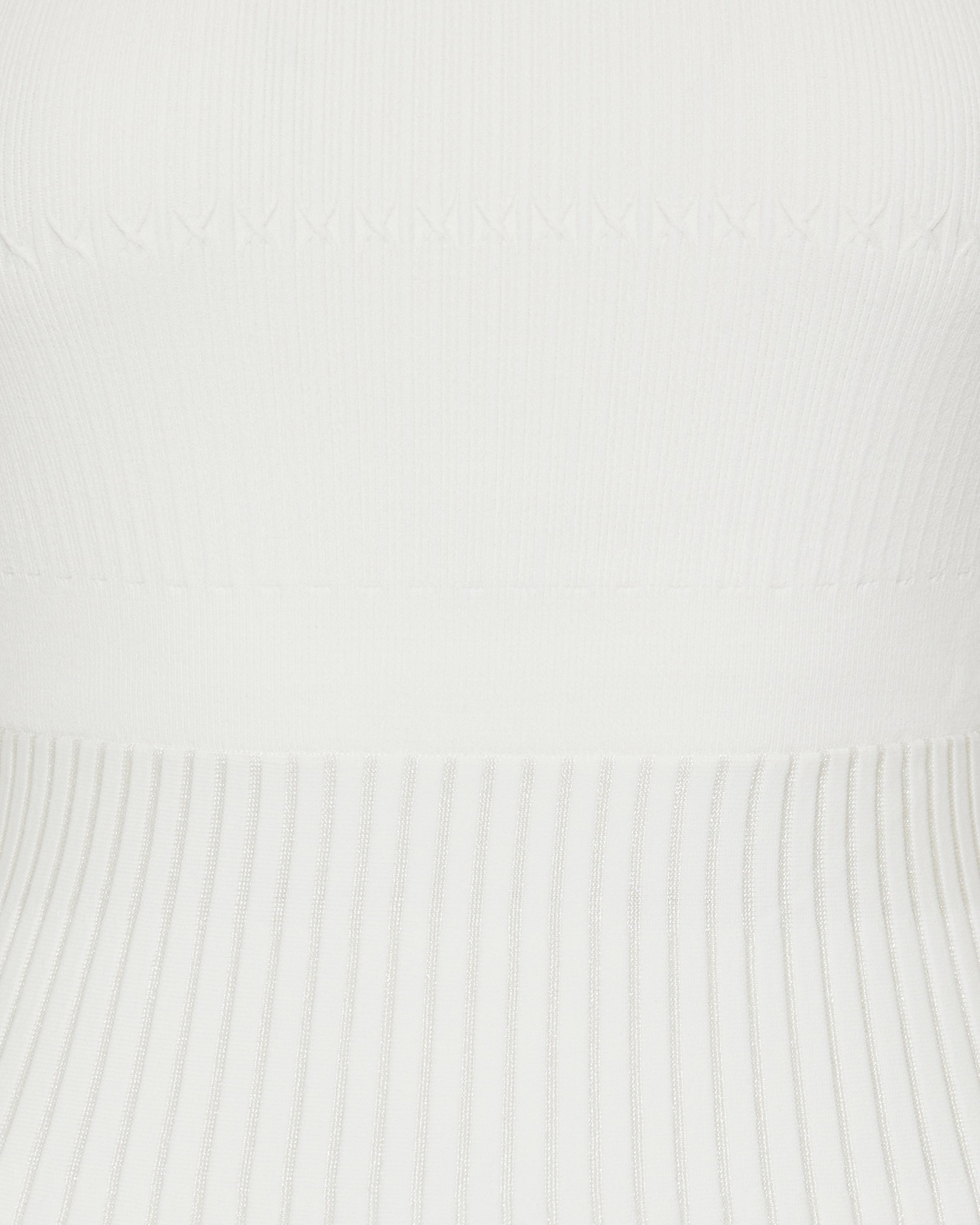 An elegant alabaster midi dress with sheer illusion panels and refined stitch detailing on a fitted bodice. Crafted from a midweight knit, this piece features a crew neckline and invisible center‑back zip for a sleek silhouette that suits elevated daytime and refined evening wear. A versatile, modern classic that combines comfort with timeless sophistication.
