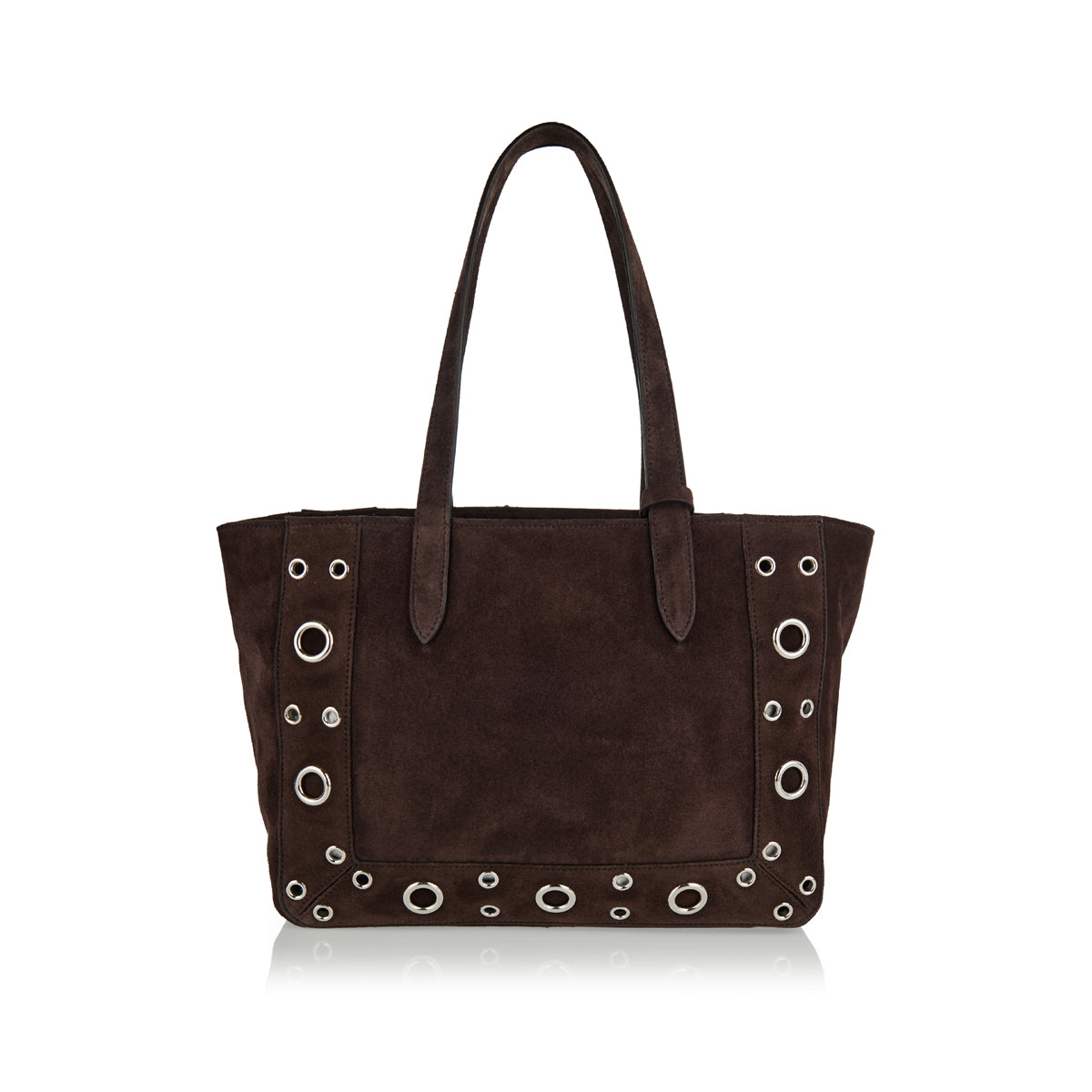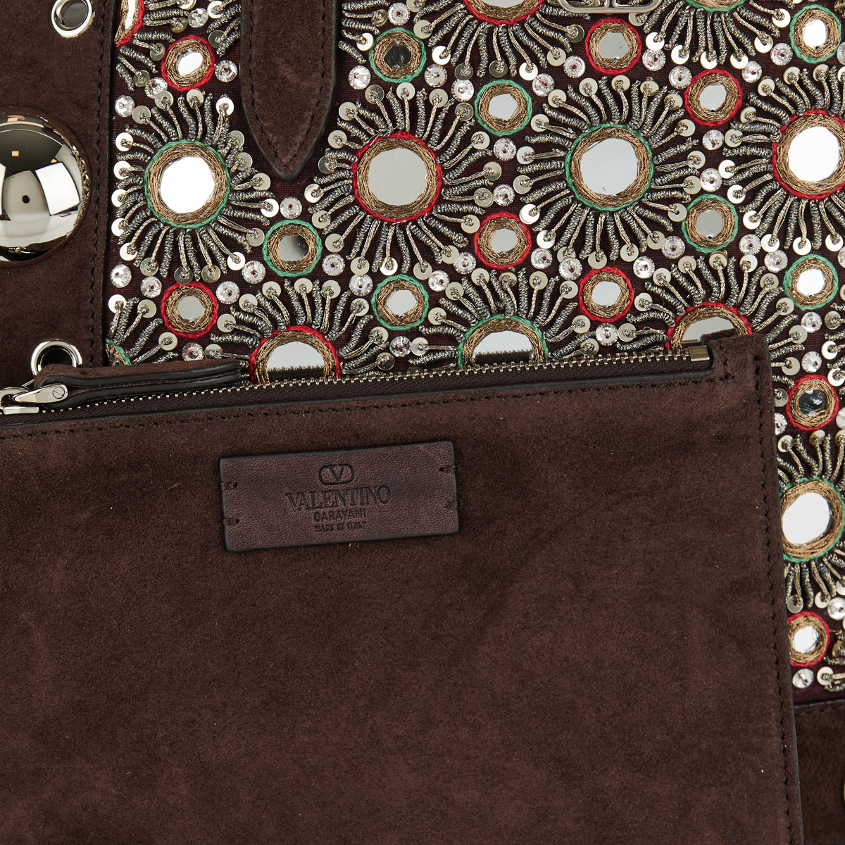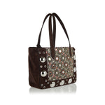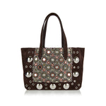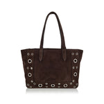 Valentino Garavani Nellcôte tote in brown suede, adorned with crystal embellishments for a striking finish. The spacious silhouette combines refined detailing with practical function, featuring dual top handles, a suede-lined interior, and leather trims. A luxurious statement bag designed to elevate both day and evening ensembles.