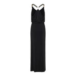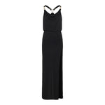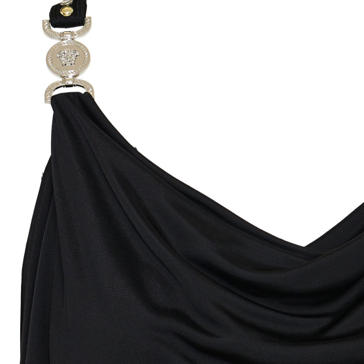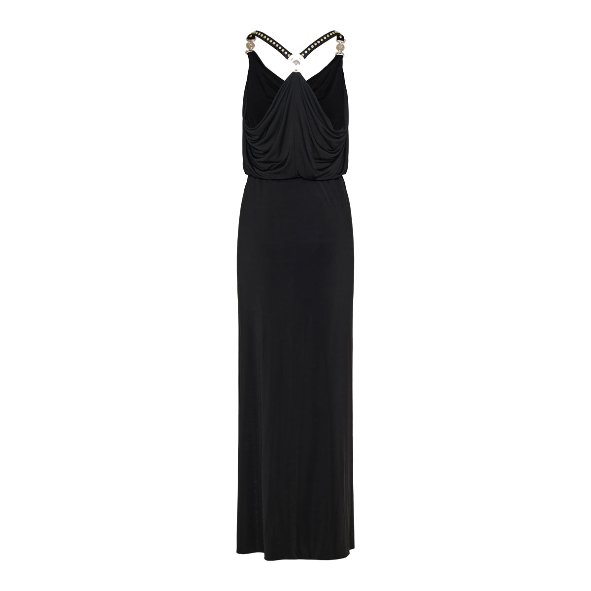 A sleek evening gown in fluid viscose-jersey featuring a draped cowl neckline, a softly gathered silhouette and signature Medusa ’95 hardware. Crystal and stud embellishments add subtle shine while a side slit and elastic waistband create a flattering, graceful drape — ideal for formal events or red-carpet-worthy nights out.