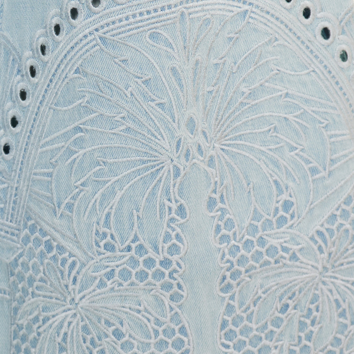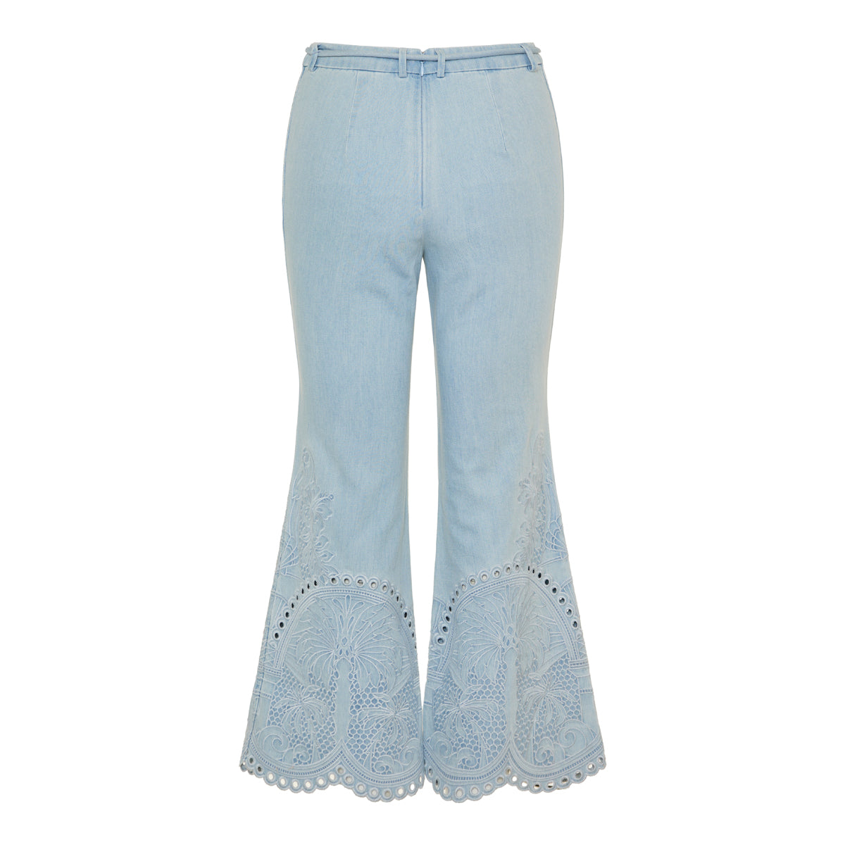 The cropped wide‑leg embroidered denim jeans are a refined yet relaxed choice, ideal for casual‑chic outfits. The all‑over embroidery and scalloped hem lend a distinctive artisan elegance to denim, creating a statement look that pairs equally well with daywear or elevated weekend ensembles.