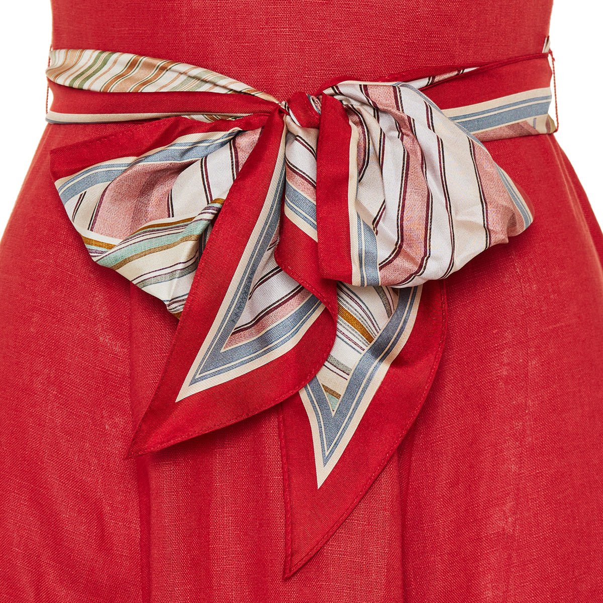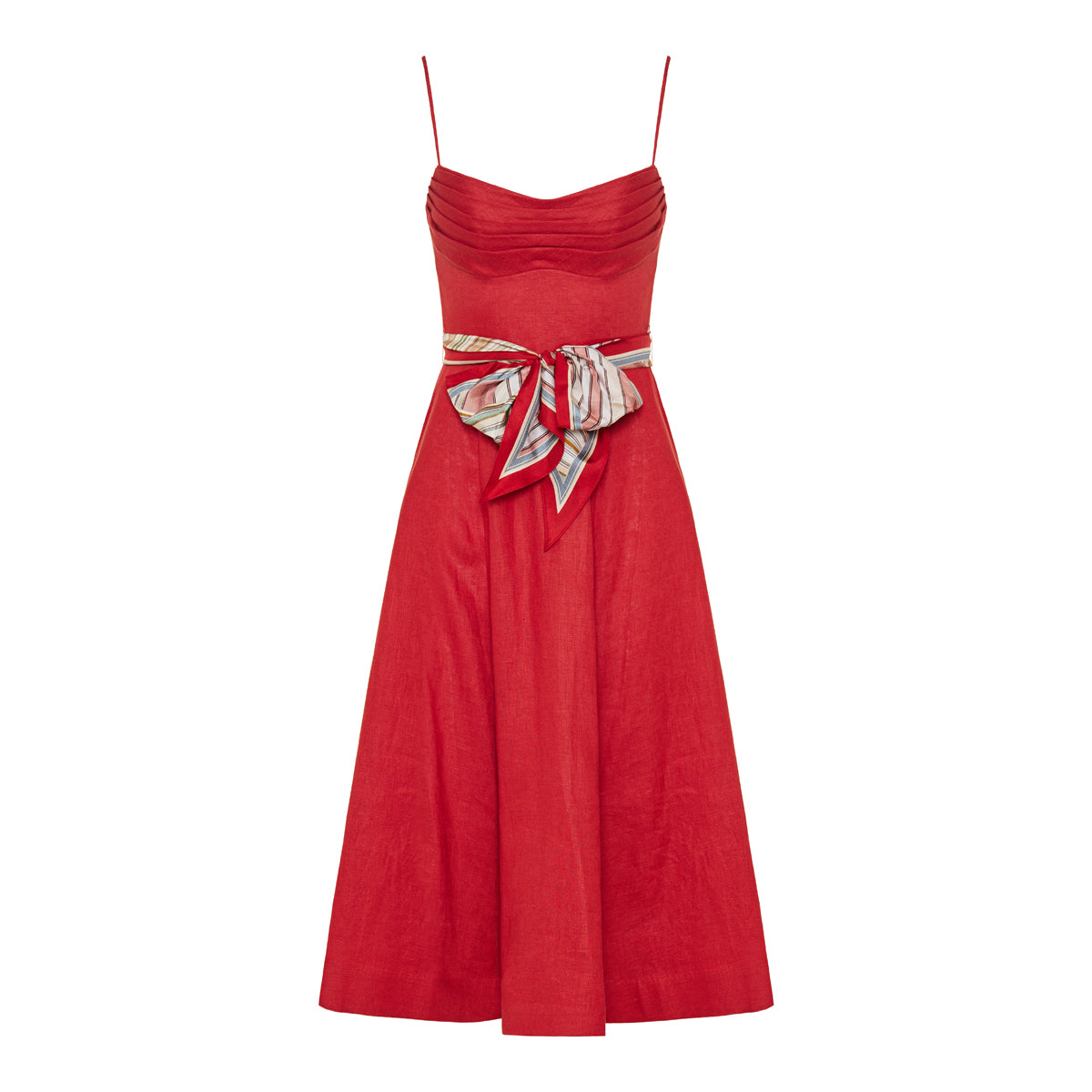 A flowing linen midi dress with gentle tuck detailing across the bust and adjustable shoulder straps for a tailored yet relaxed fit. The full-flare skirt and soft drape make it perfect for elegant daytime wear or refined resort settings, while the vibrant red hue adds a bold touch of understated sophistication.