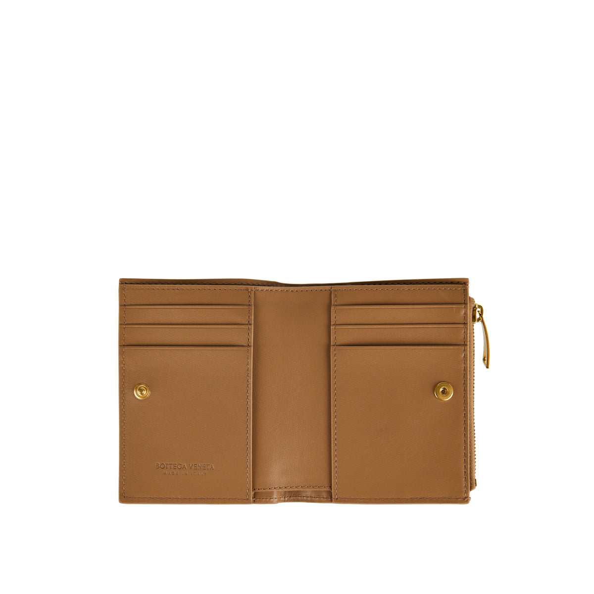 Woven in the House's Intrecciato pattern, this small wallet in brown is shaped to a bi-fold design equipped with one note compartment, one zip coin purse and six card slots.