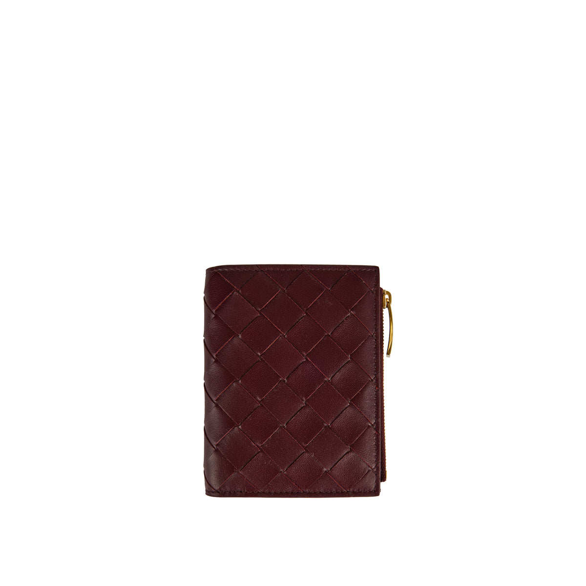 Woven in the House's Intrecciato pattern, this small wallet in brown is shaped to a bi-fold design equipped with one note compartment, one zip coin purse and six card slots.