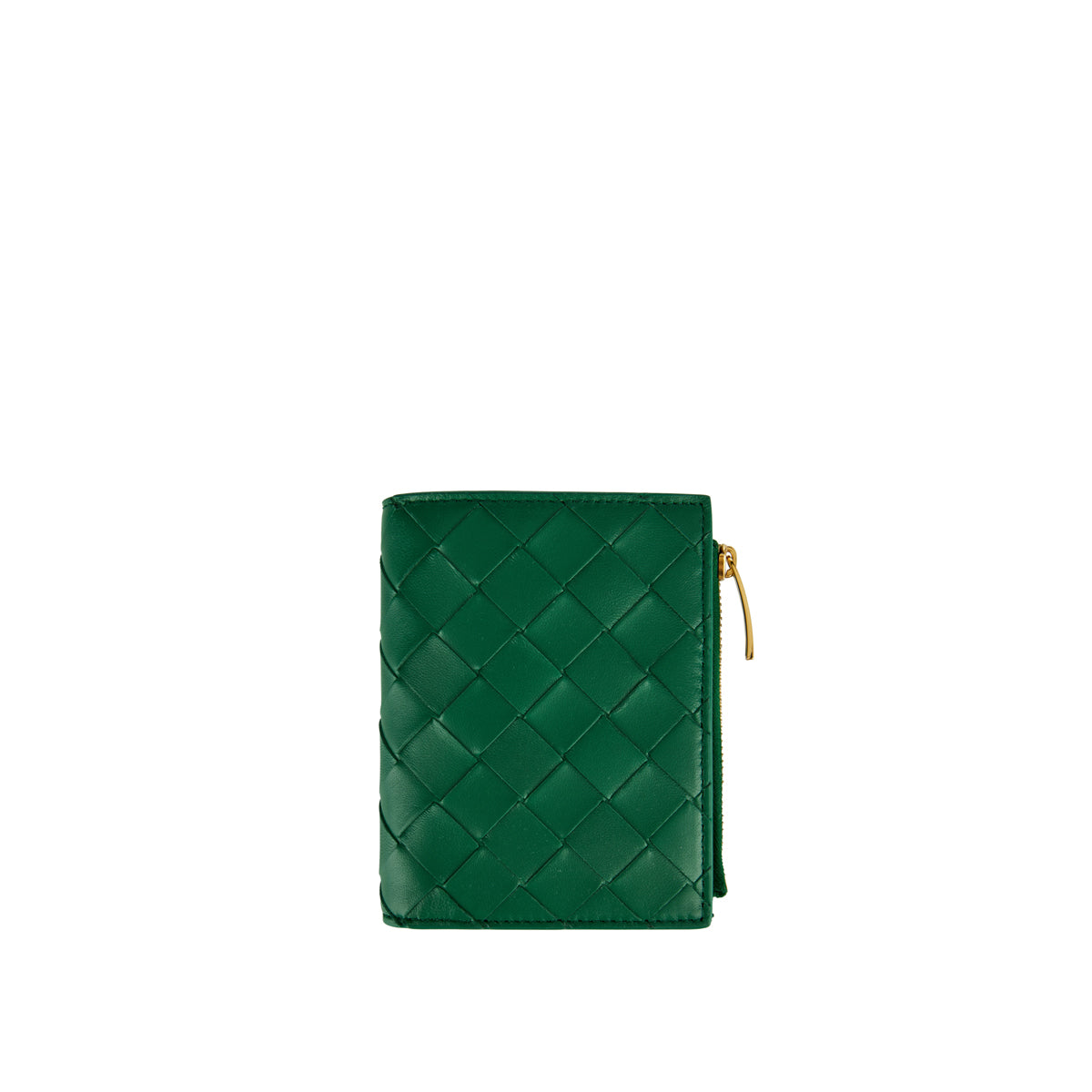 This compact bi-fold wallet from Bottega Veneta is crafted in Intrecciato nappa leather in the elegant Jungle shade. Designed for daily refinement, it includes six card slots, a note compartment, and a zipped coin pocket, all secured with a press-stud closure. A polished and functional essential for any luxury accessories collection.