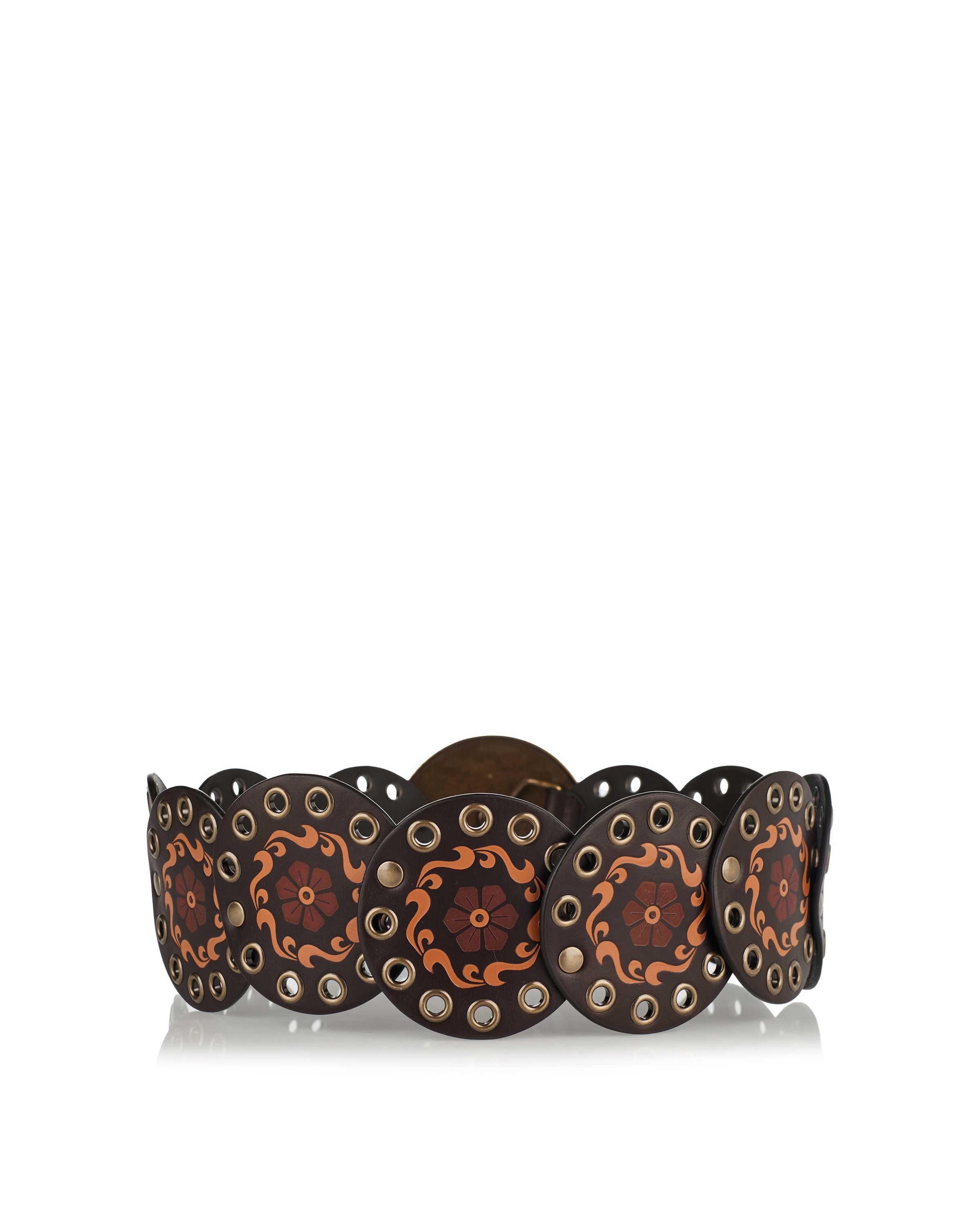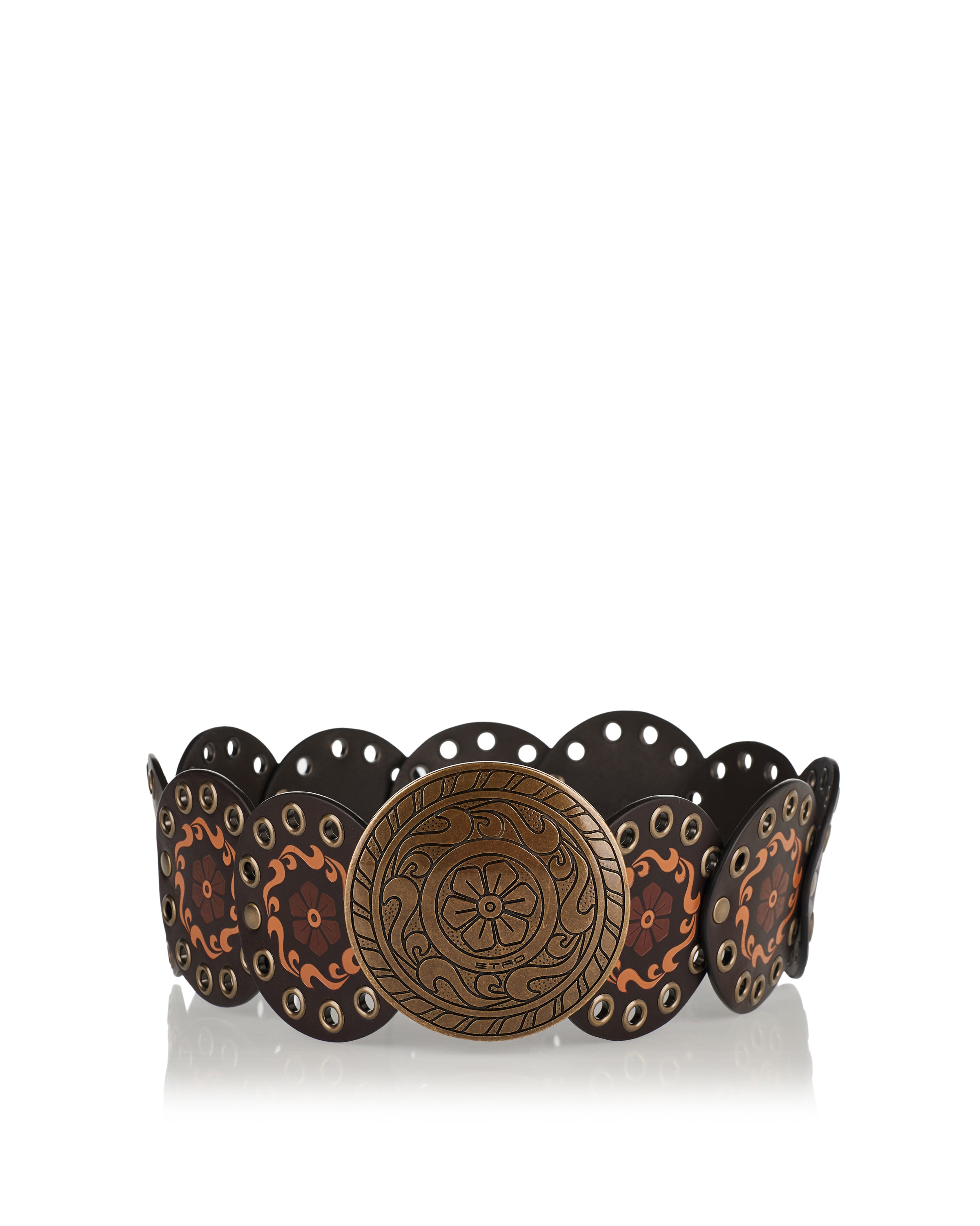 A refined Etro leather belt crafted in rich brown calfskin with a distinctive hook‑fastening closure and tonal finish. The substantial buckle width adds a statement touch while remaining elegant, making this belt ideal for cinching dresses, tailored trousers or outerwear for polished everyday or elevated casual looks. A versatile accessory that embodies Italian refinement and understated luxury.