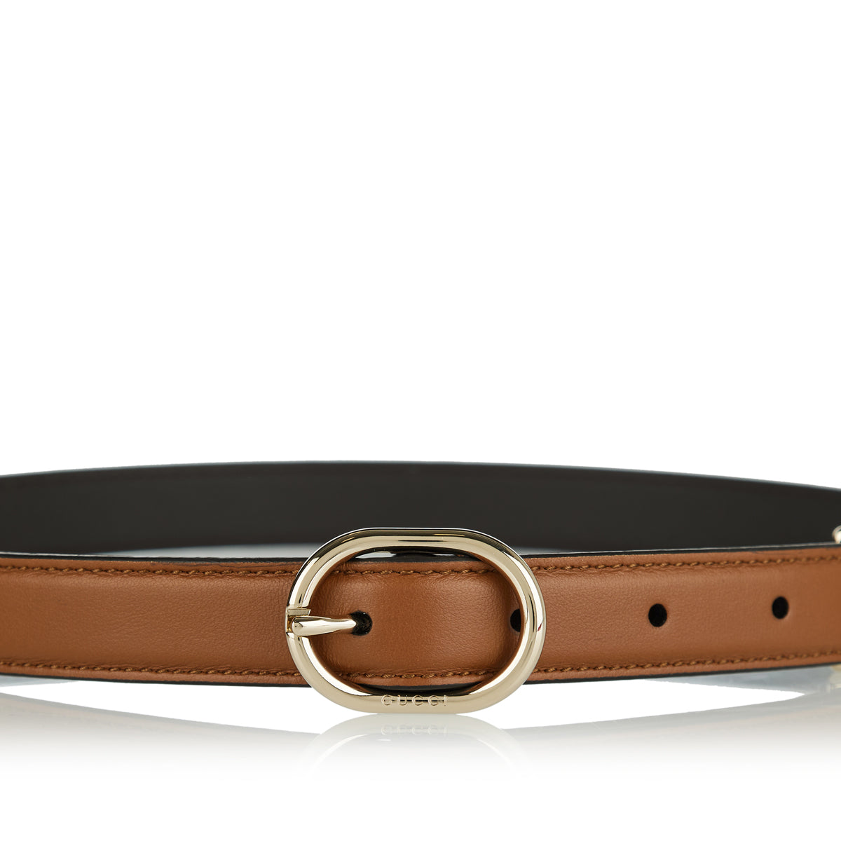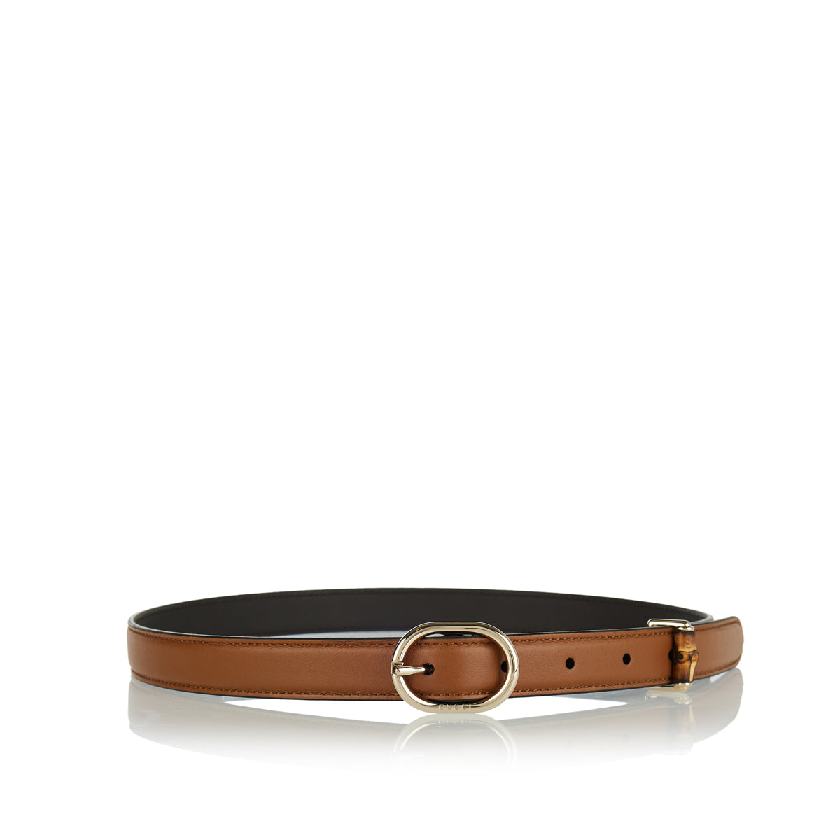A refined, minimalist leather belt that pairs timeless elegance with subtle detail. Crafted from smooth calf leather and finished with a light gold‑toned oval buckle (with a discreet logo engraving and bamboo‑inspired belt‑loop accent), it offers a slim, 2 cm profile that flatters both waist‑ and hip‑worn styling. Perfect for polished everyday wear or refined outfits where understated luxury matters.
