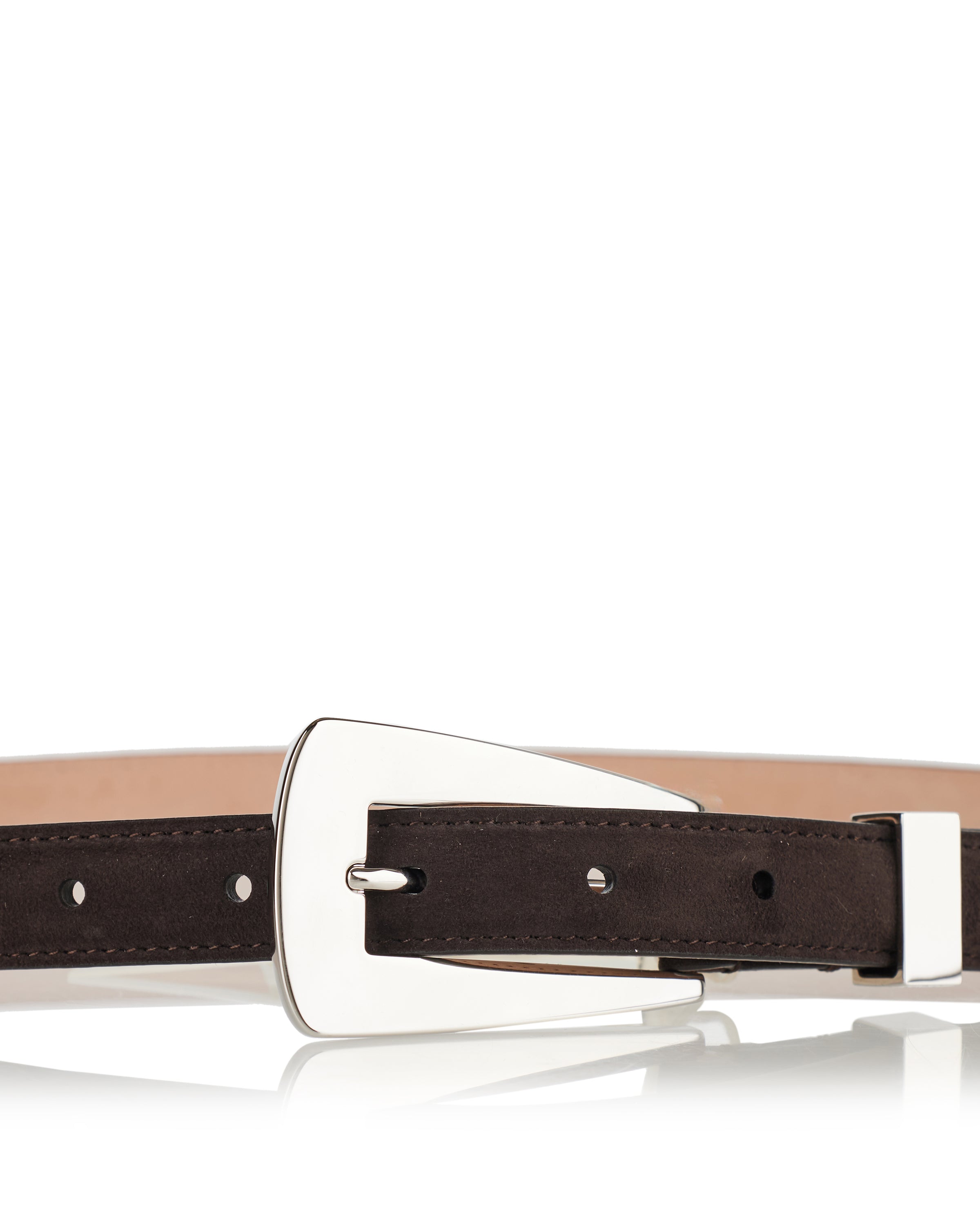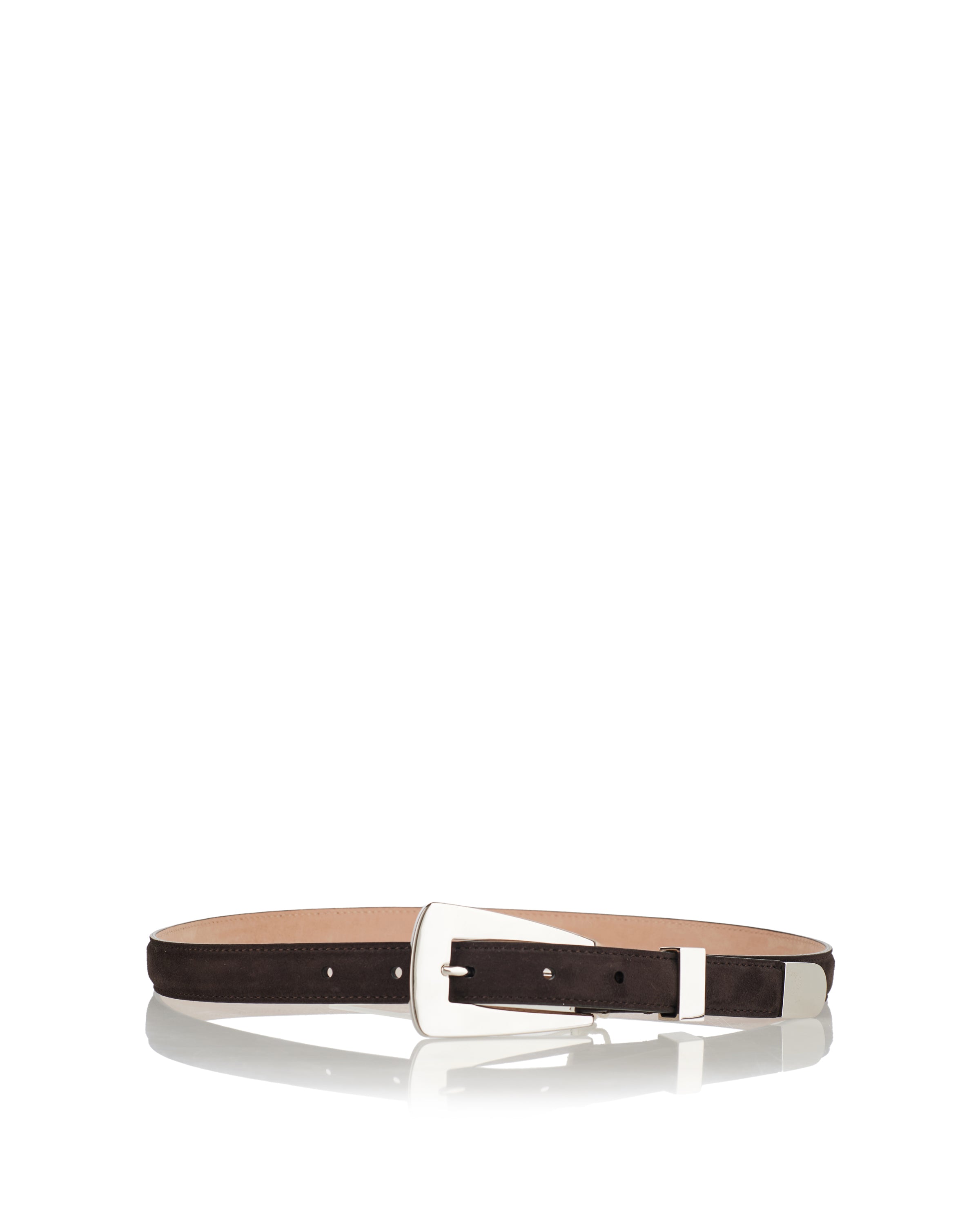 A refined Khaite Lucca suede belt crafted in Italy from rich brown calf-suede with a slender 2 cm width and a polished silver-tone adjustable buckle. Its minimalist silhouette and subtle texture make it an elegant choice to cinch waists or accent tailored trousers, dresses or denim — a versatile accessory for refined everyday or elevated casual outfits.