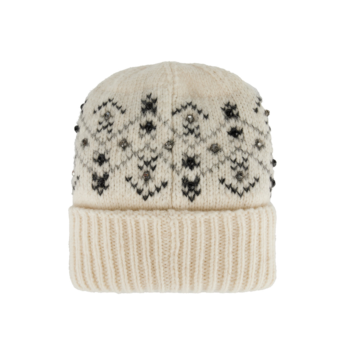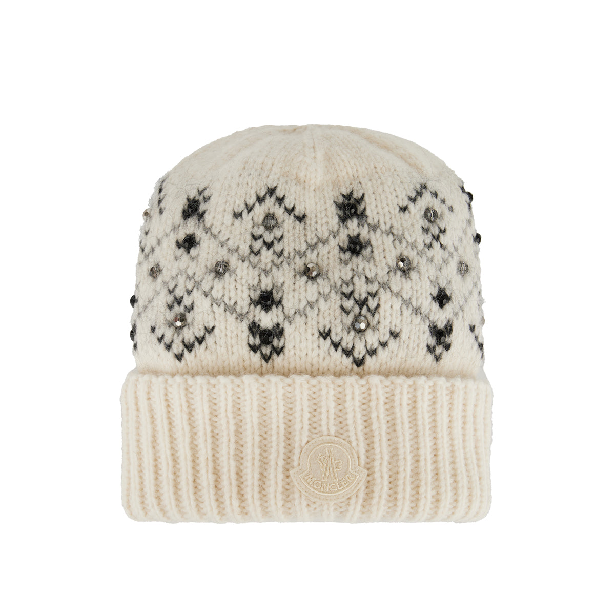 Elevate your winter wardrobe with this luxurious Moncler beanie, crafted from a soft alpaca-wool blend. The white ivory hue is adorned with hand-embroidered crystals, adding a touch of sparkle to the classic ribbed knit design. Finished with a tonal Moncler logo patch, this piece combines warmth with sophisticated style.