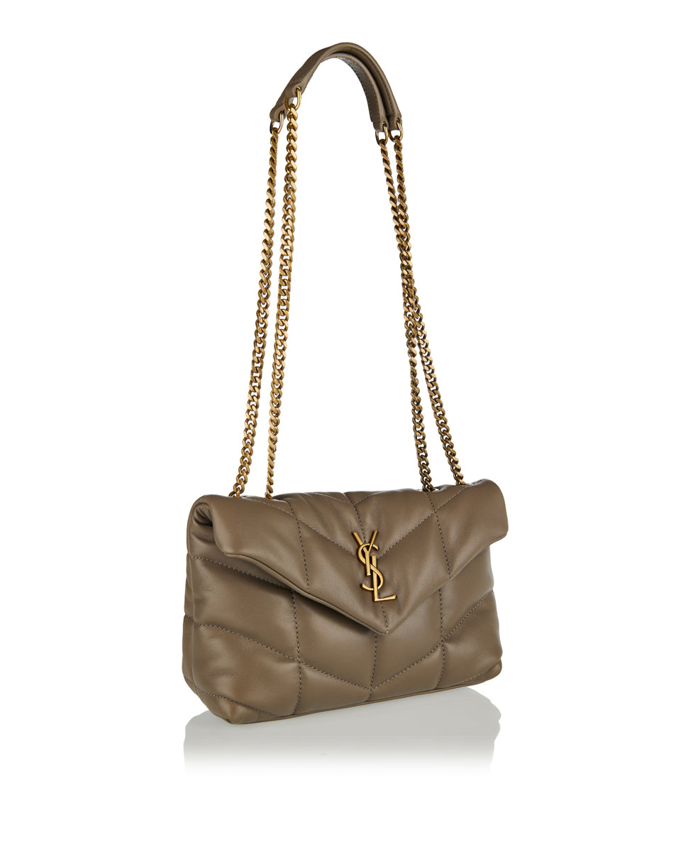 A compact, quilted shoulder bag crafted from soft lambskin leather, featuring a playful puffer design and Saint Laurent’s signature refined detailing.
