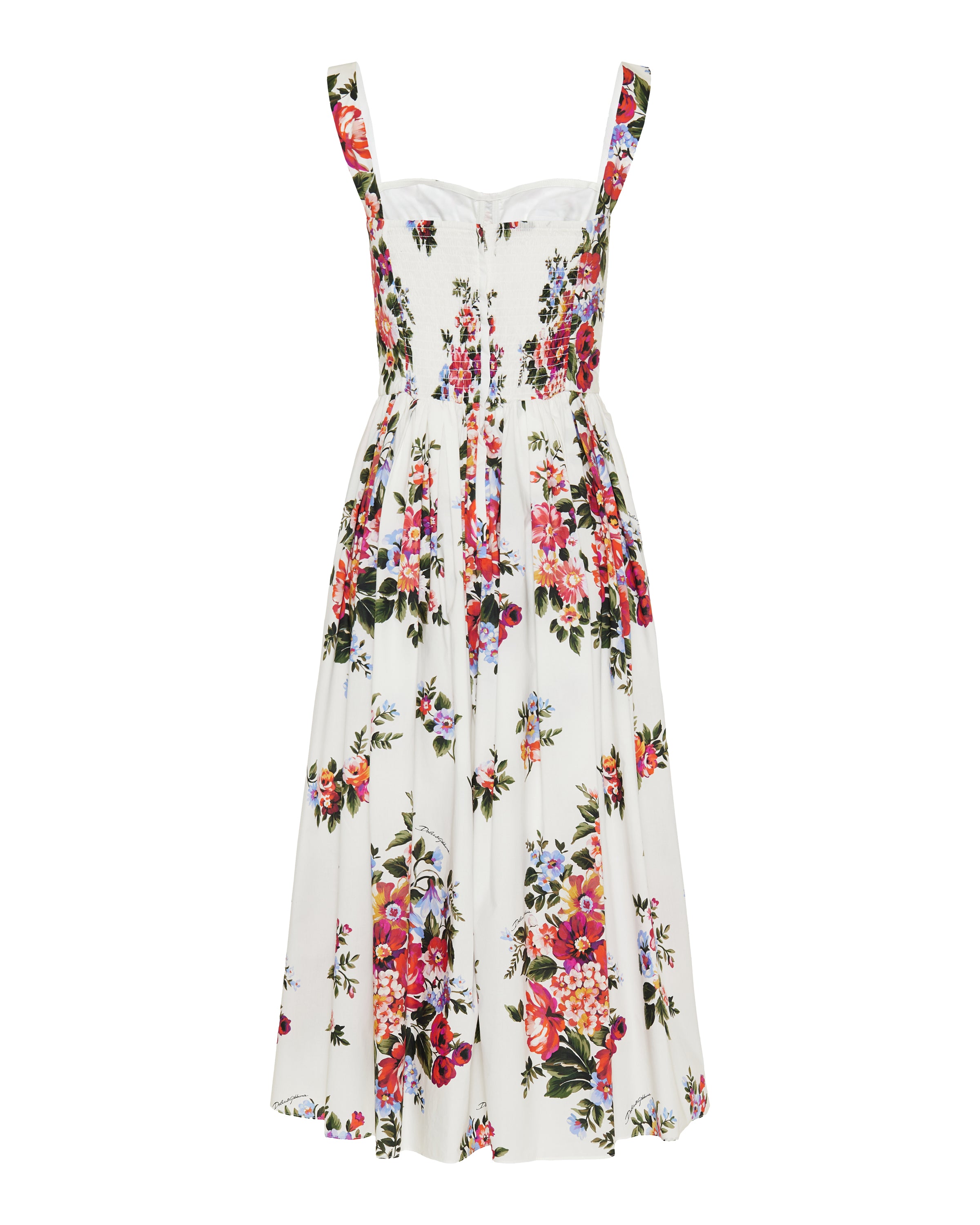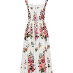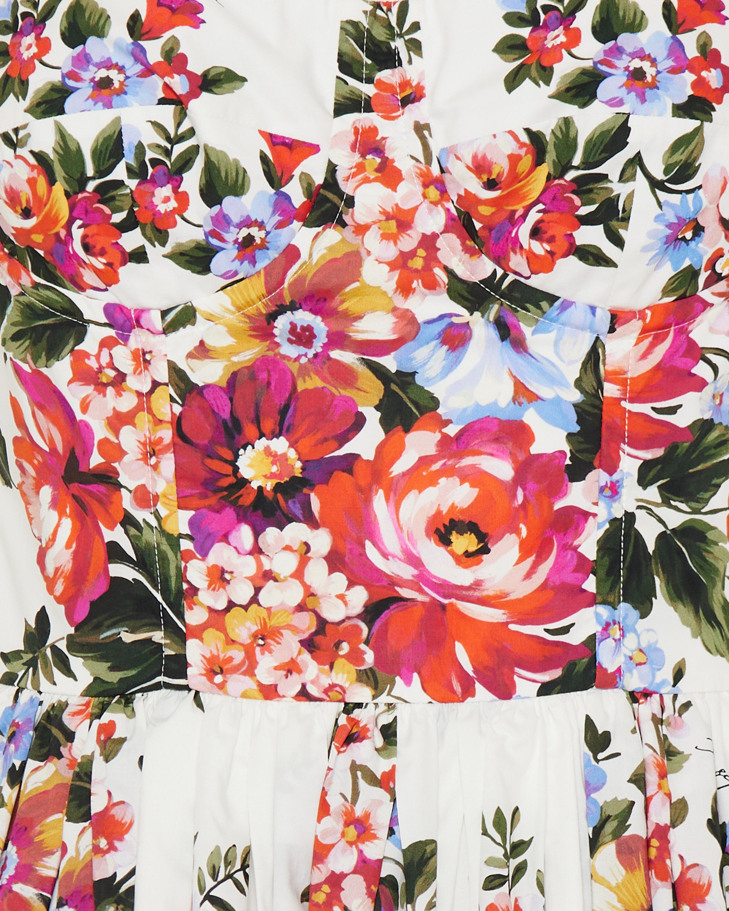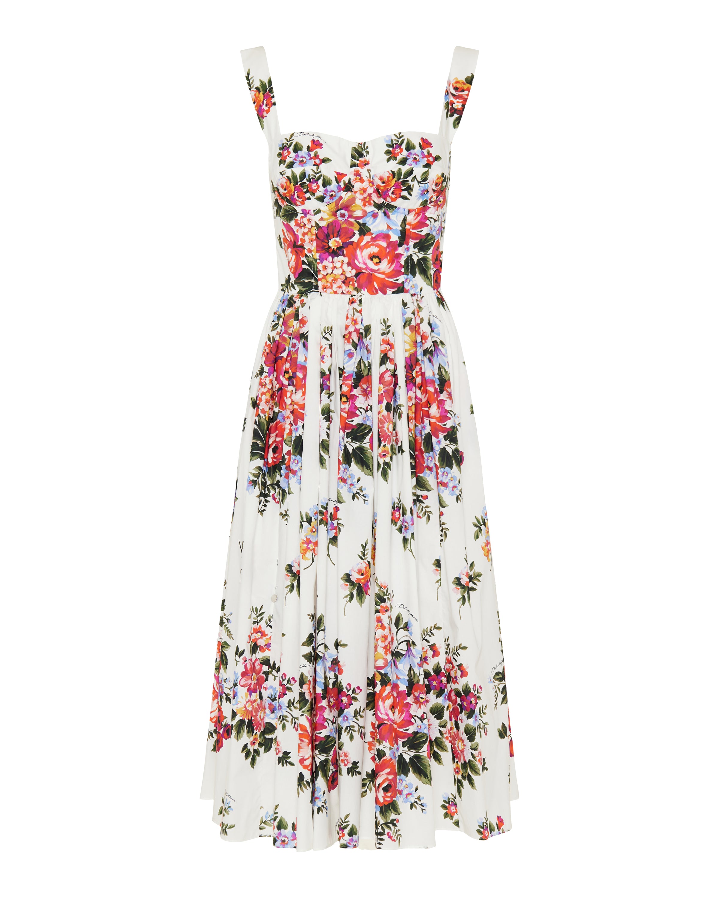 Feminine dress crafted from crisp cotton, adorned with a vibrant flower bouquet print that captures romantic Mediterranean elegance. A structured yet playful silhouette designed to make a statement.- 100% cotton