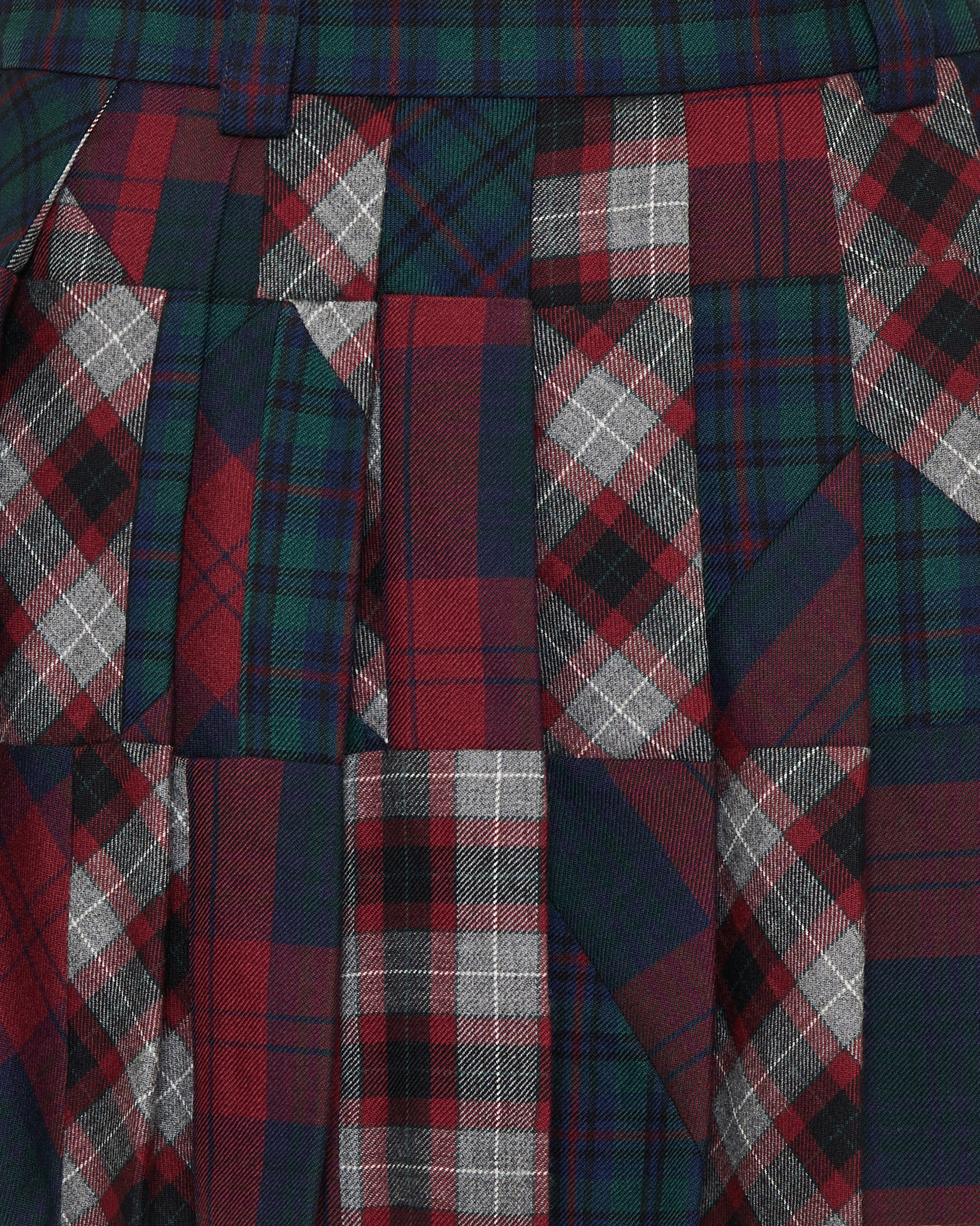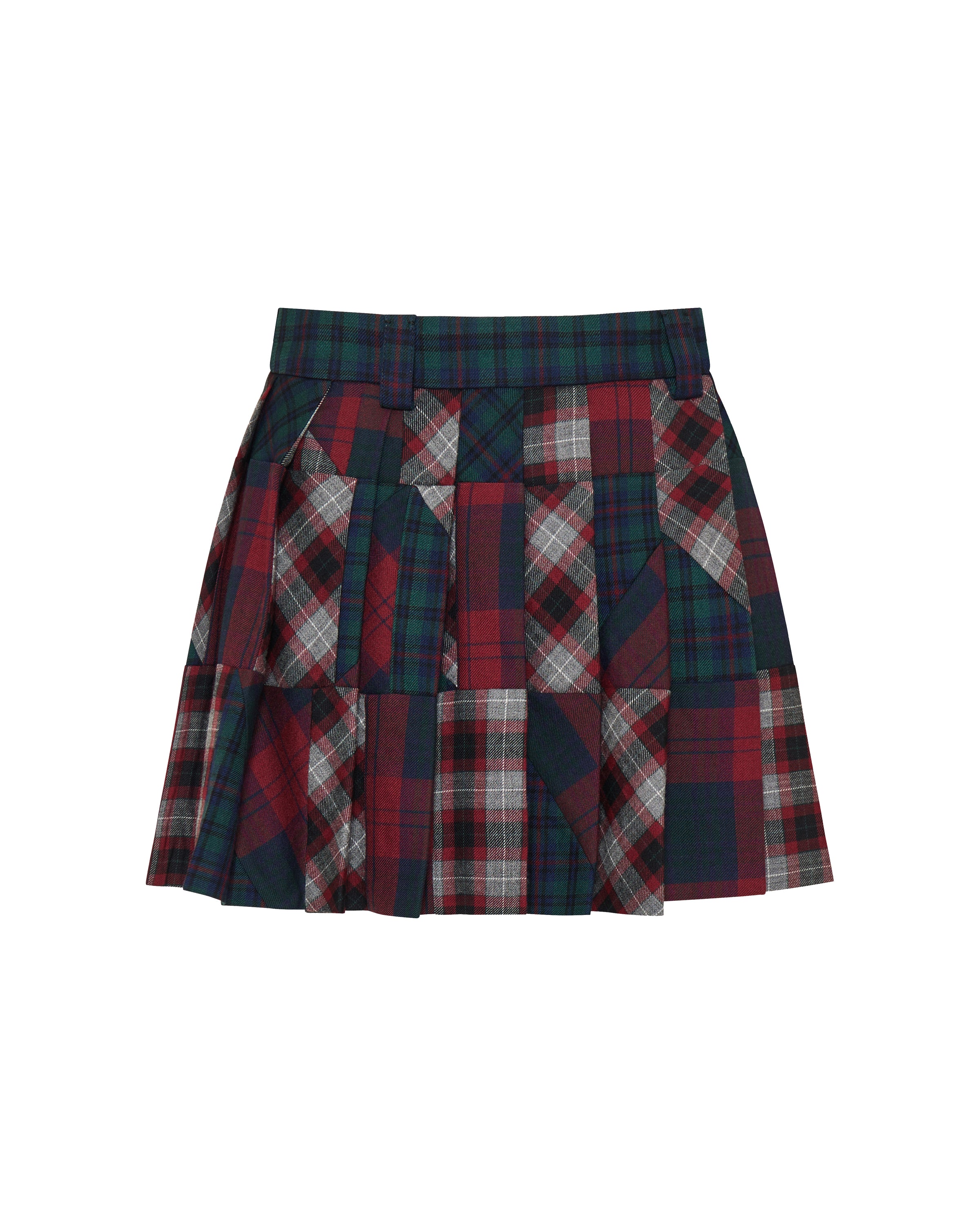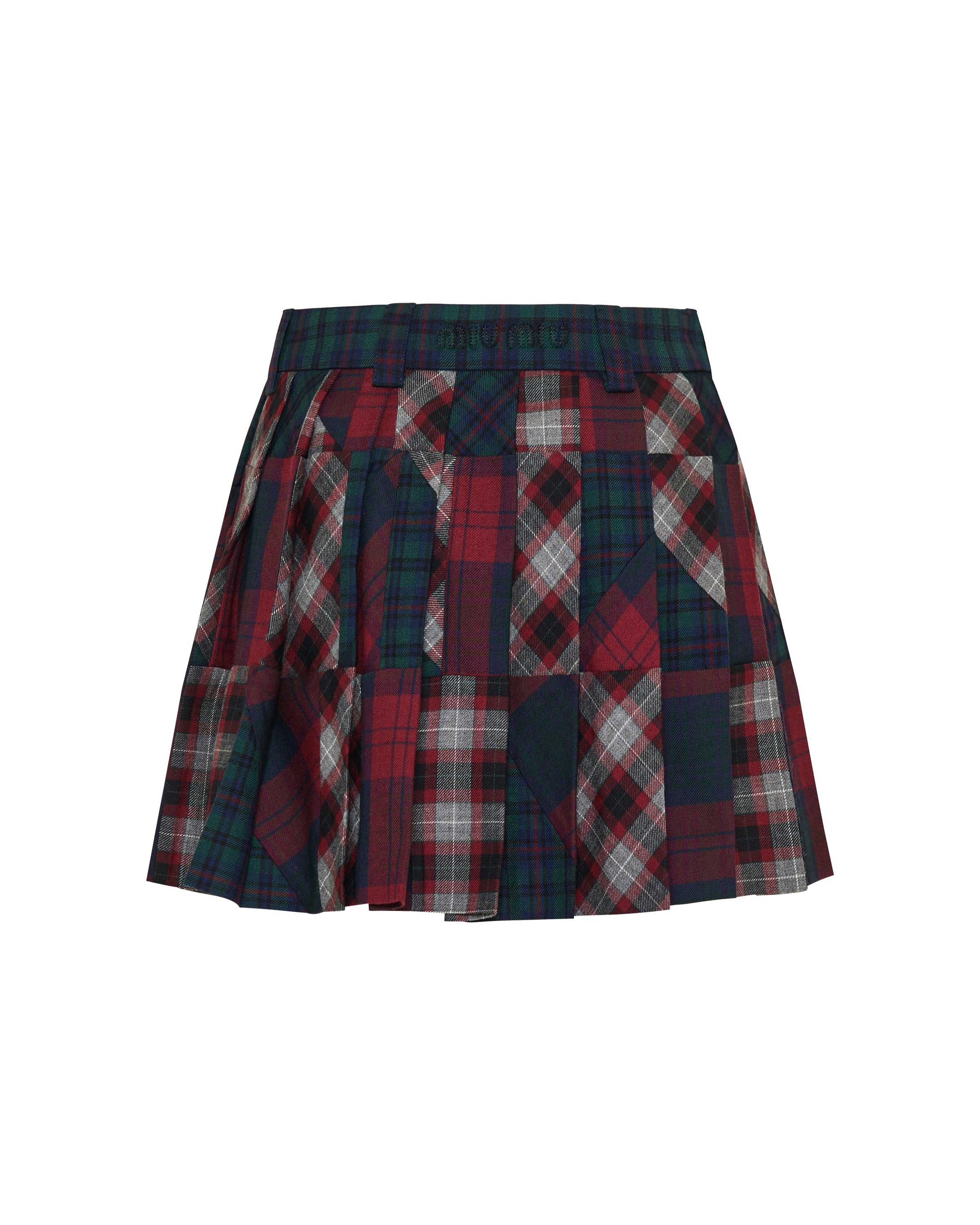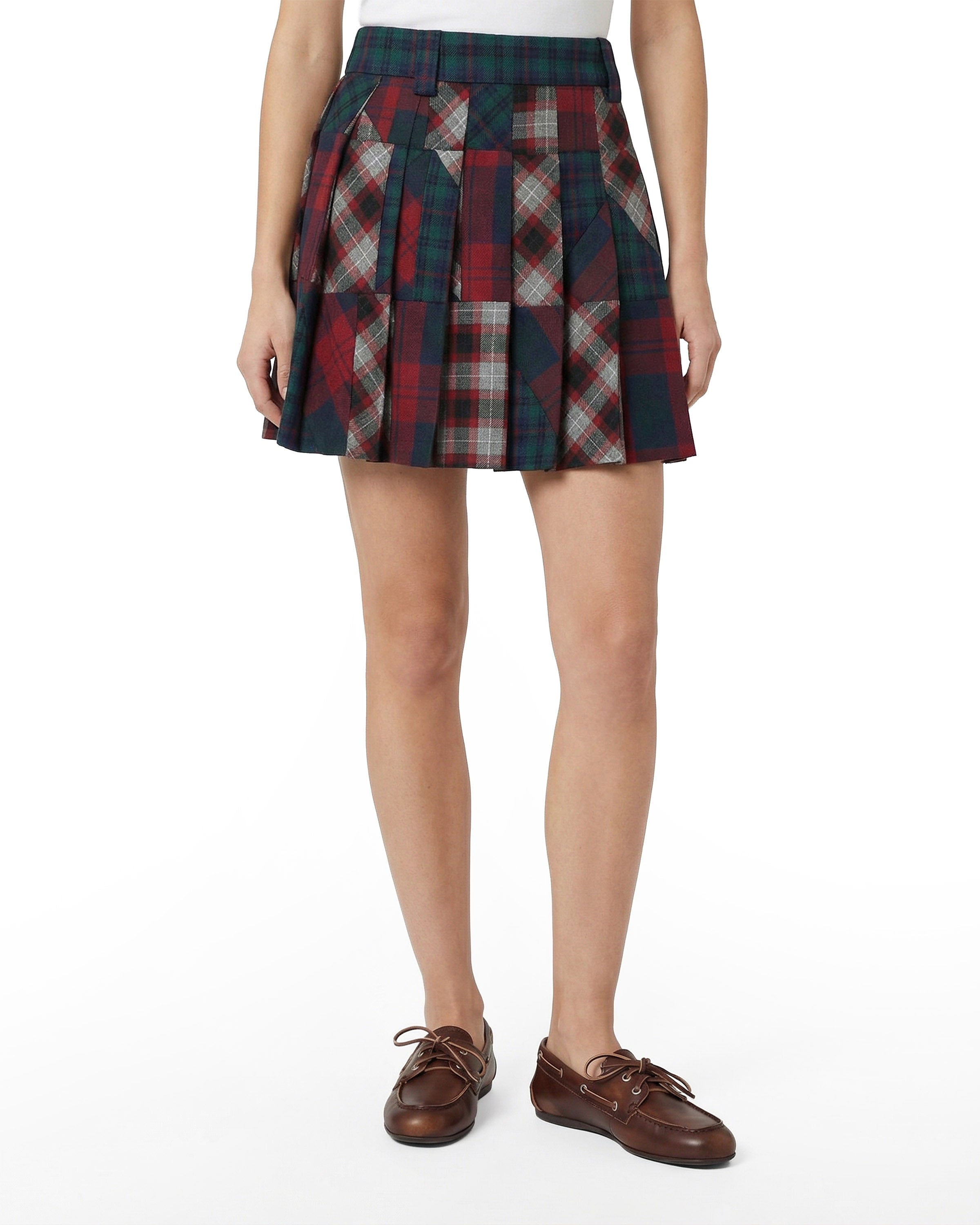 A refined miniskirt crafted in premium virgin wool with a distinctive patchwork plaid design that evokes a vintage aesthetic with modern elegance. The subtly pleated silhouette and multicolored palette offer versatile styling for elevated daytime and smart casual ensembles, combining heritage inspiration with contemporary luxury.