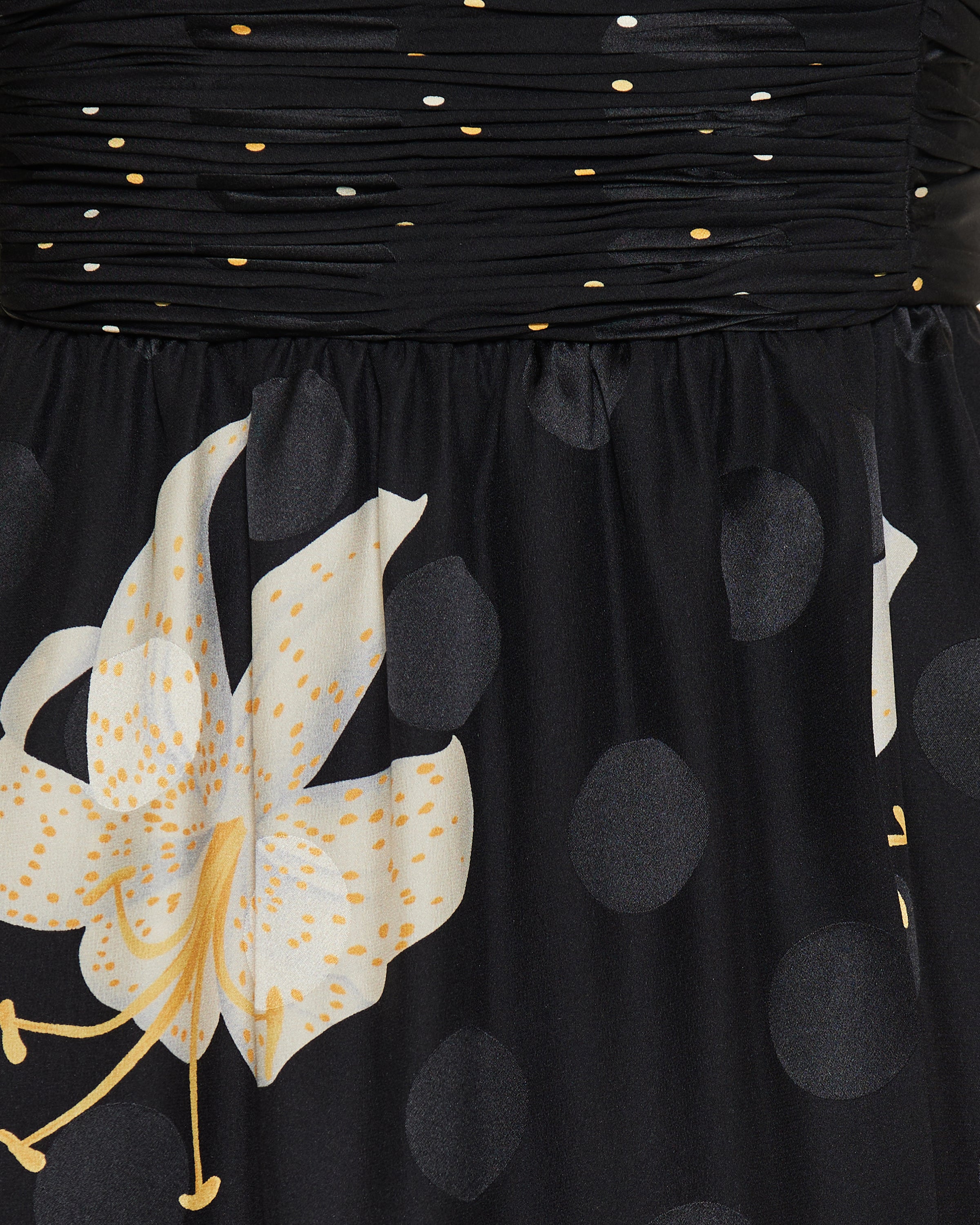 A luxurious long dress in black featuring Valentino’s signature Apres L’Hiver Lilium jacquard pattern in fine crepe de chine silk. Designed with handcrafted draping at the bodice and a front slit, this Italian‑made silhouette combines couture elegance with fluid movement. Ideal for elevated formal and refined evening occasions.