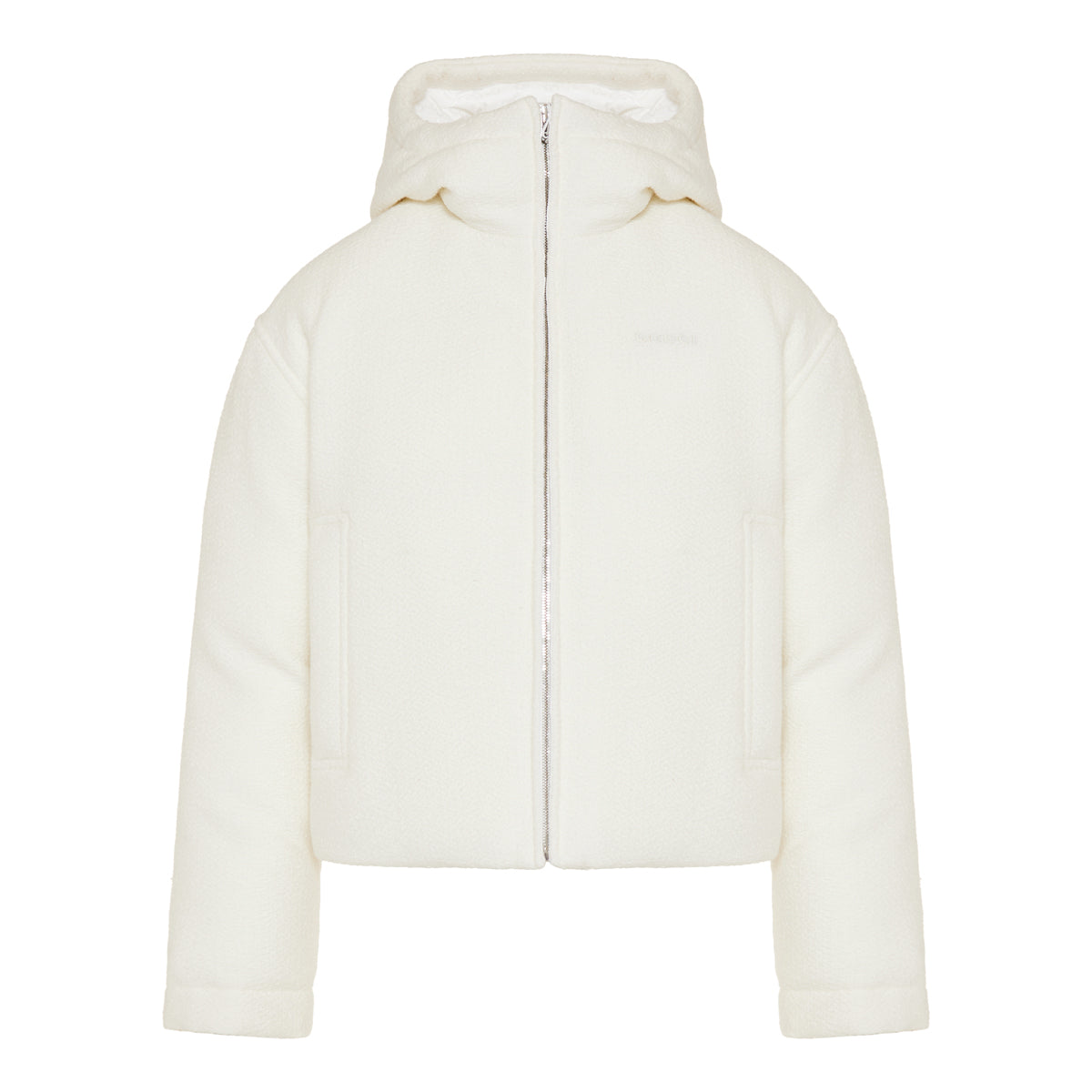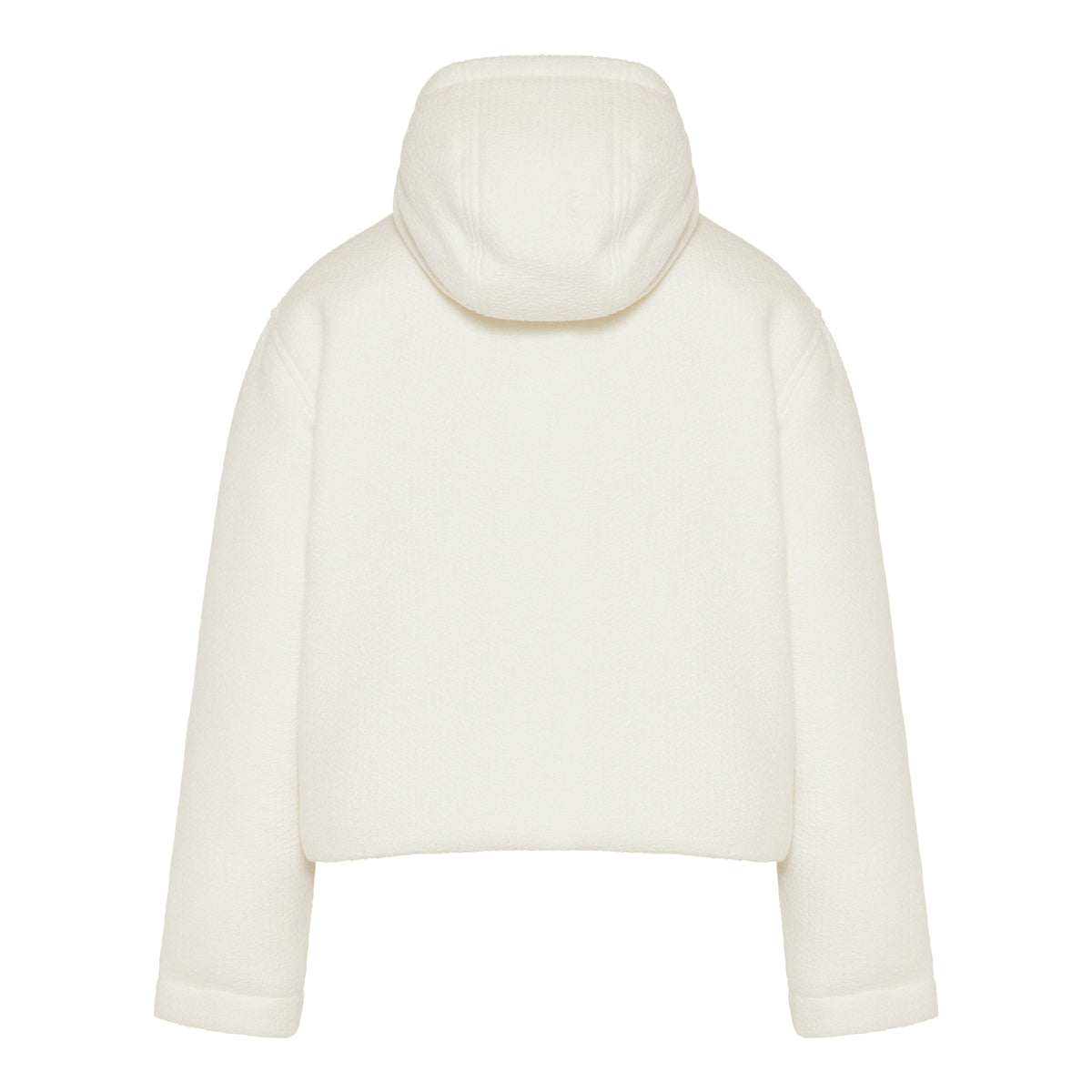 A refined outerwear piece combining classic tweed texture and modern function, this hooded, padded wool-blend jacket is ideal for transitional weather or elevated casual layering. It features a concealed zip front, full hood, and a relaxed yet structured fit, delivering sophistication with warmth.