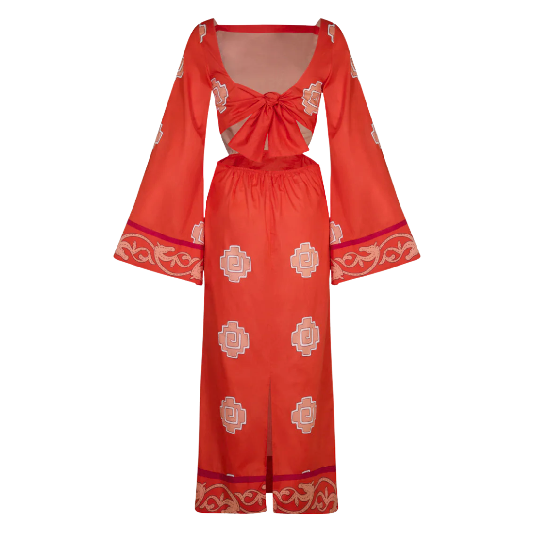Johanna Ortiz’s Underwater Sanctuary maxi dress is crafted in crisp cotton-poplin with a bold red and beige palette. Featuring an open back with tie fastening, a flowing silhouette, and feminine detailing, it embodies the designer’s signature balance of elegance and ease. Perfect for warm-weather occasions and resort escapes.