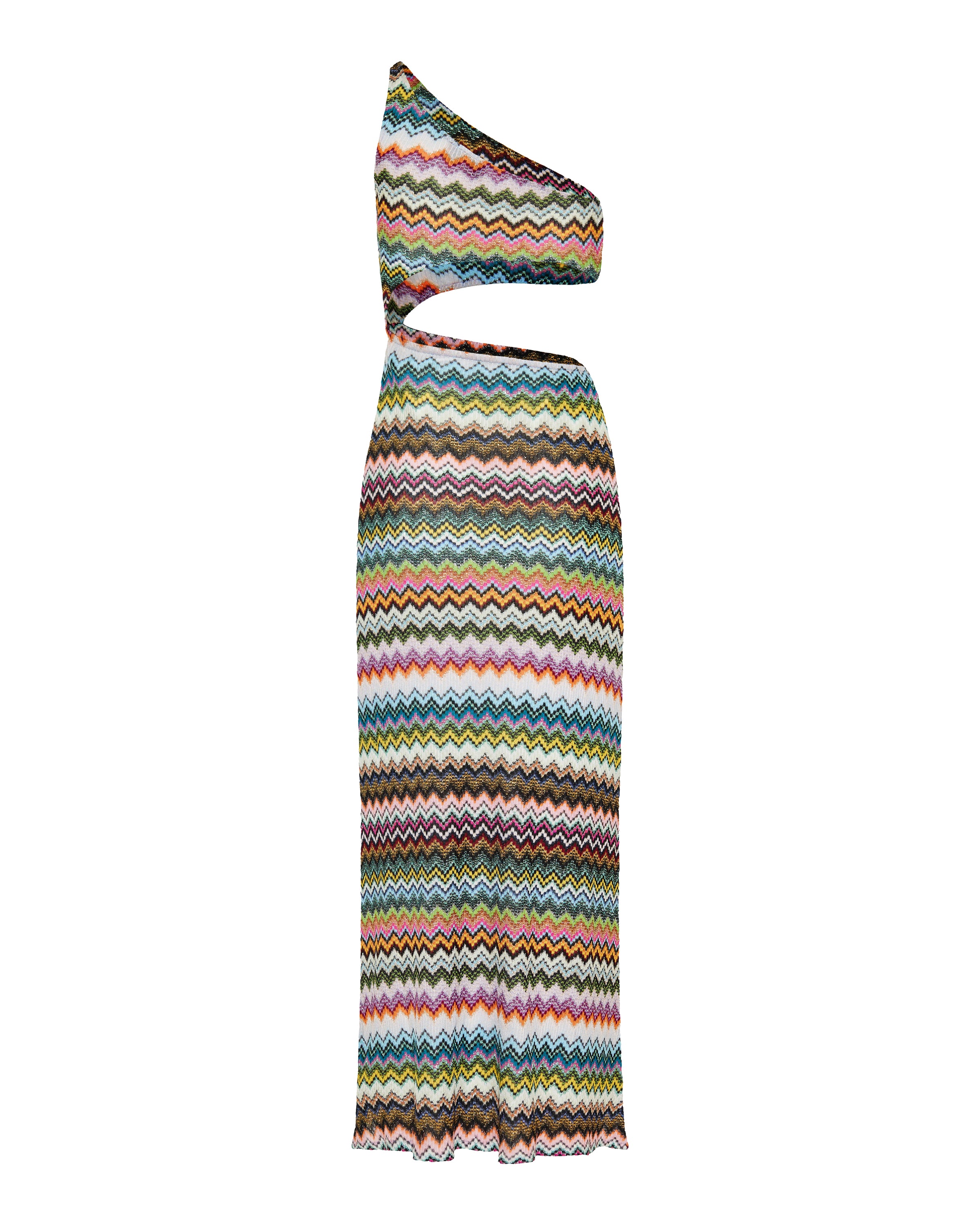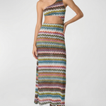 A bold beachwear statement defined by its asymmetrical silhouette and iconic pixel-effect zigzag motif, designed to flow effortlessly over swimwear.