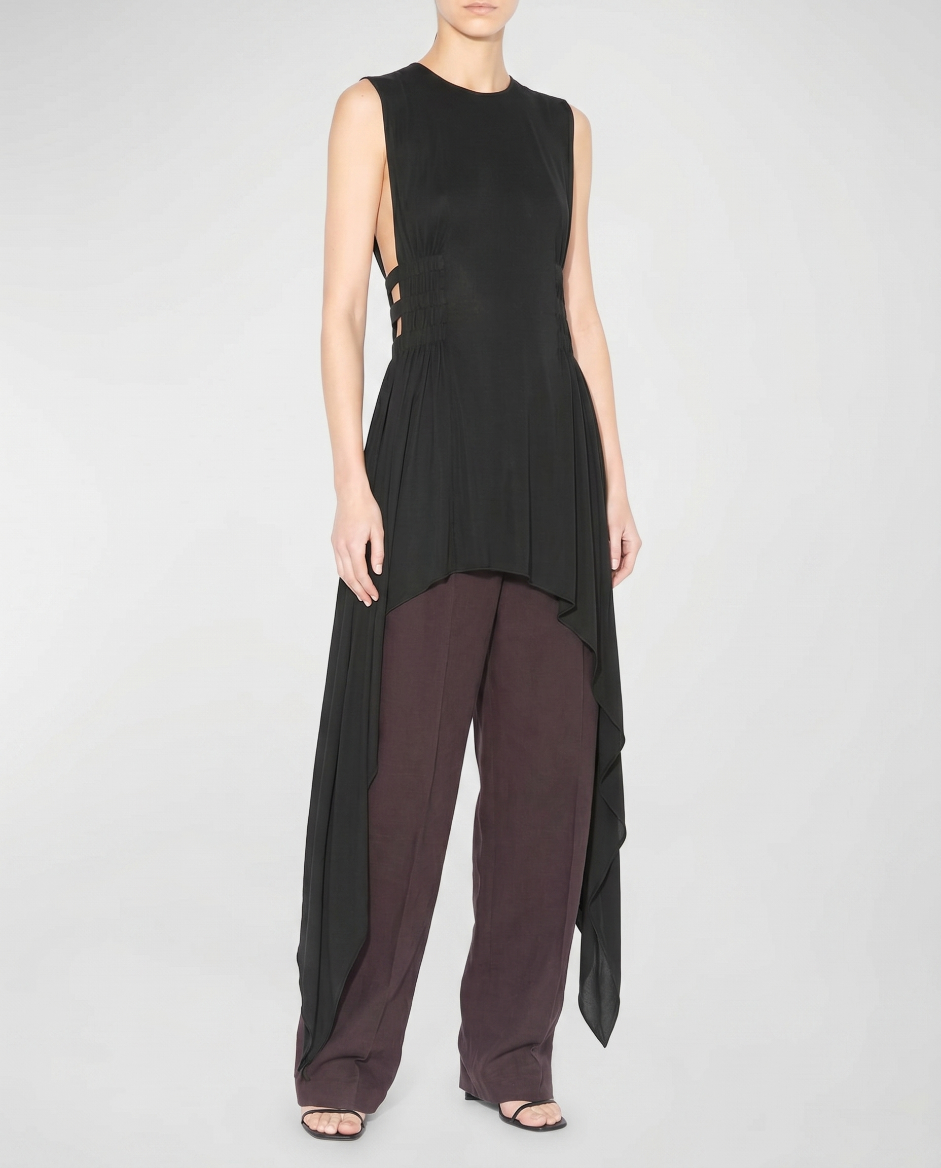 A sculptural midi silhouette defined by precise construction and a fluid, body-contouring fit that enhances natural movement.