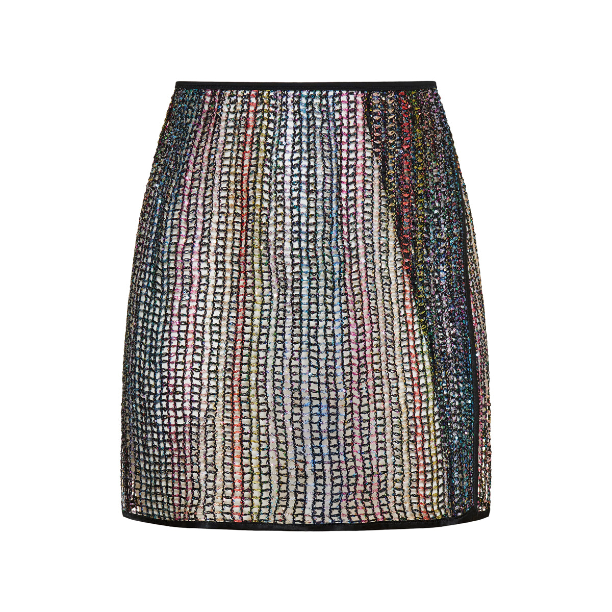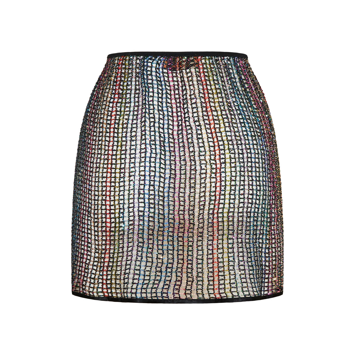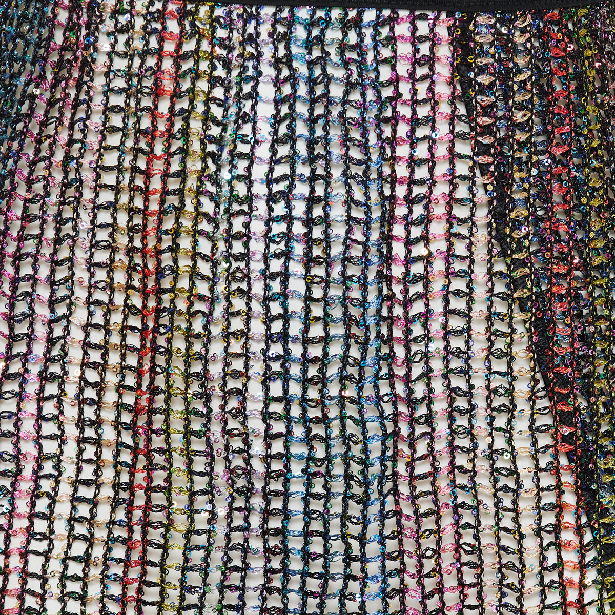 Missoni presents a multicolor mini skirt crafted from a luxurious viscose and metallic fiber blend. The openwork knit design is richly embellished with rainbow-toned thread, creating a shimmering, fluid effect. Its sleek silhouette and semi-sheer texture make it ideal for elevated evening looks or artistic resort wear.