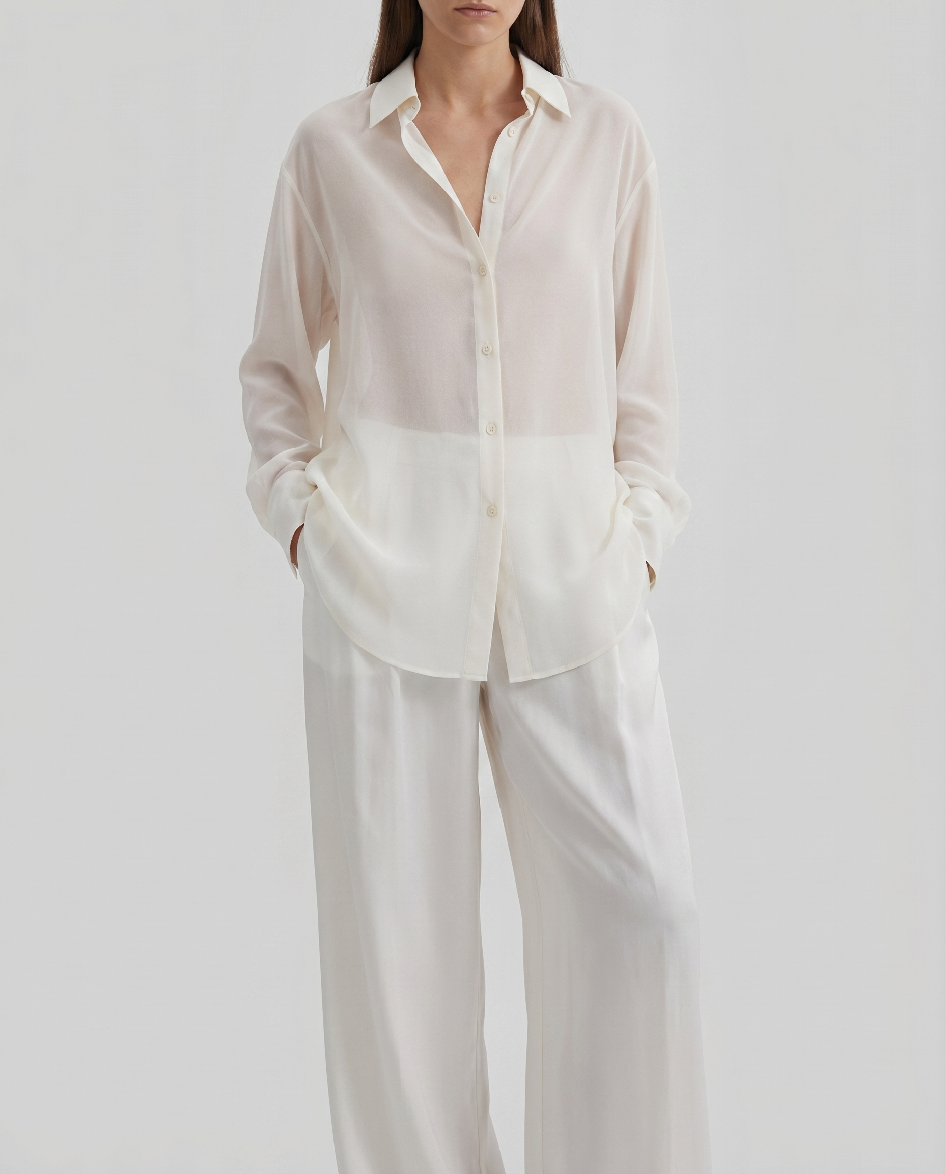 A fluid, lightweight piece crafted in georgette, defined by its soft drape and refined, minimal silhouette.