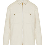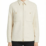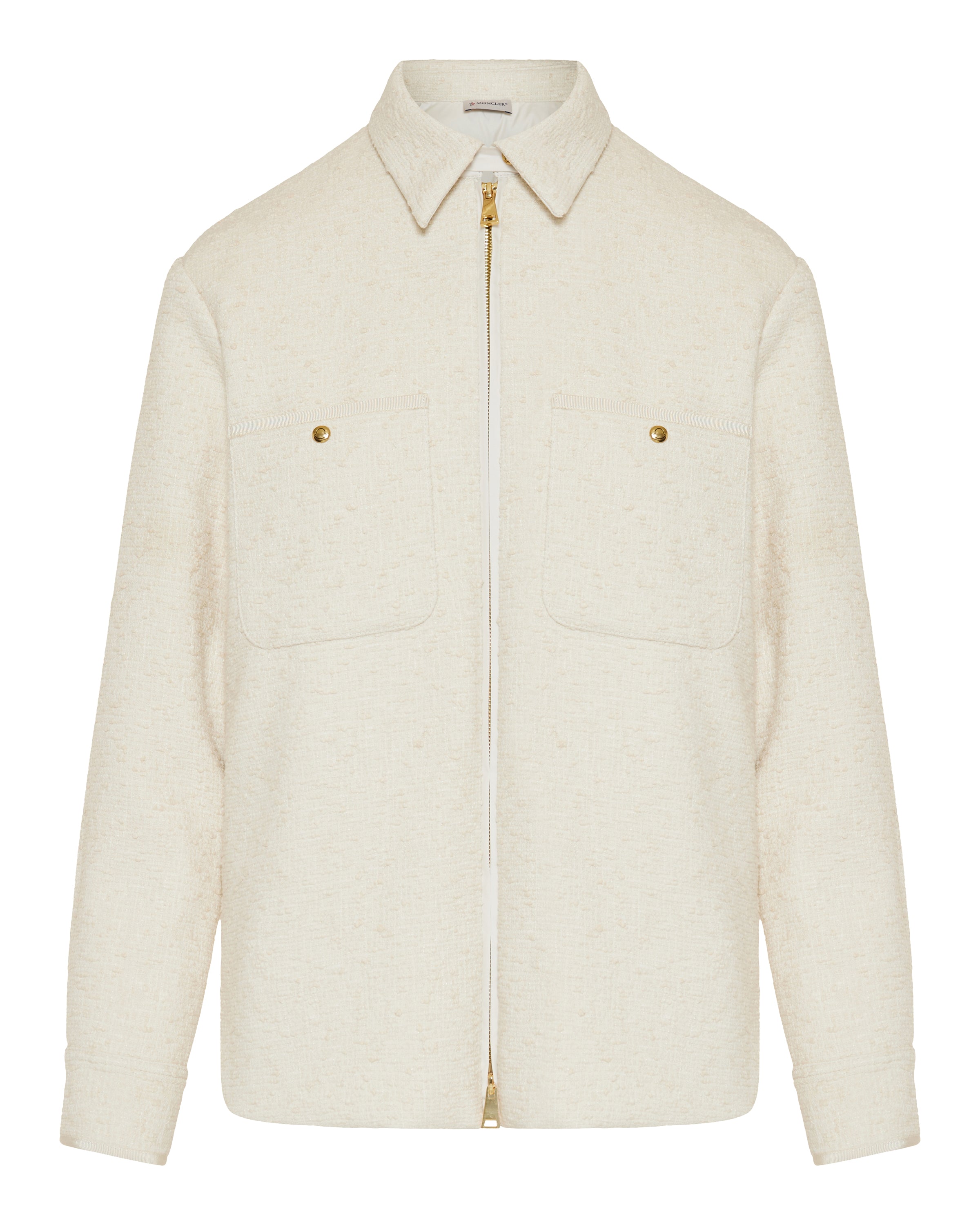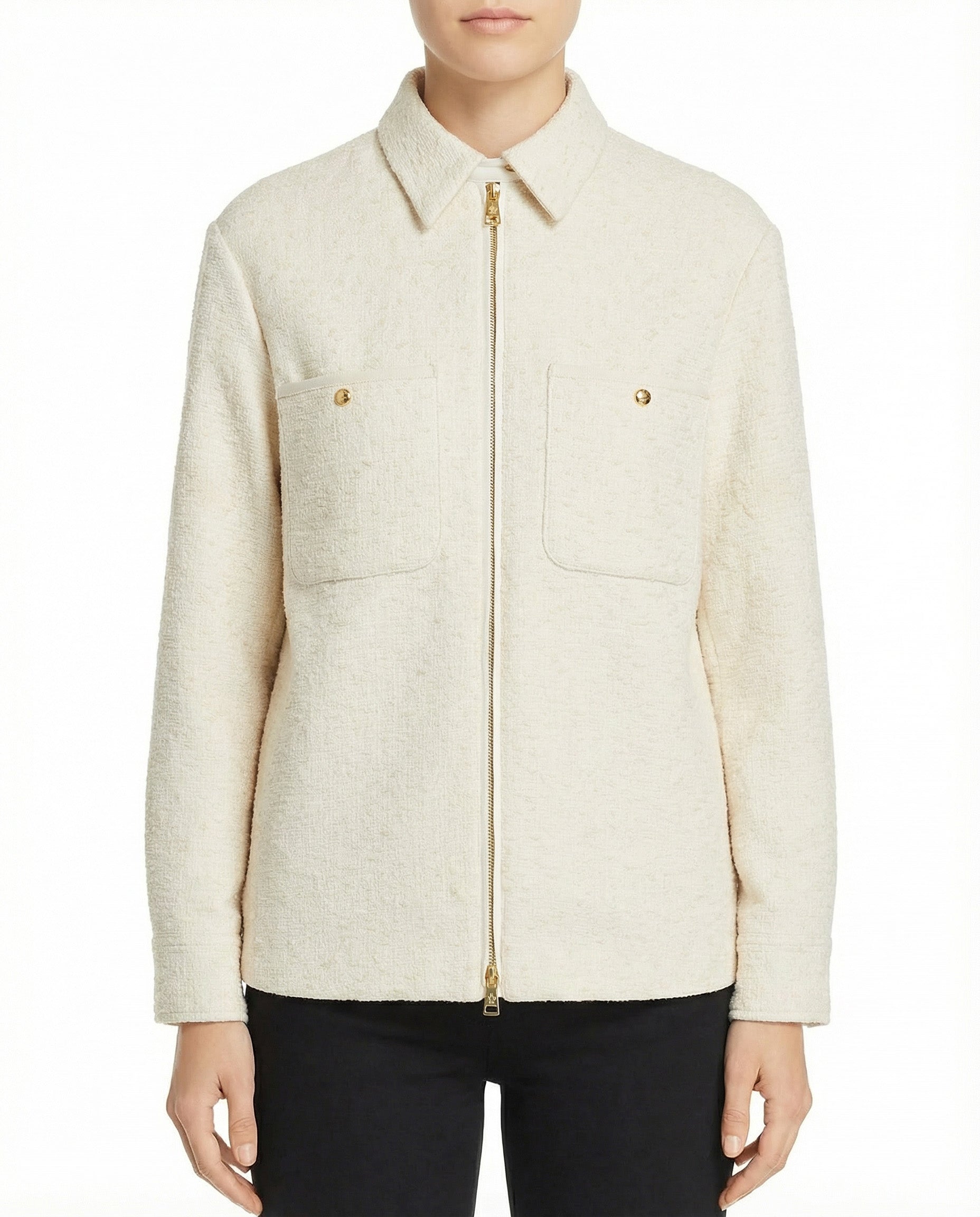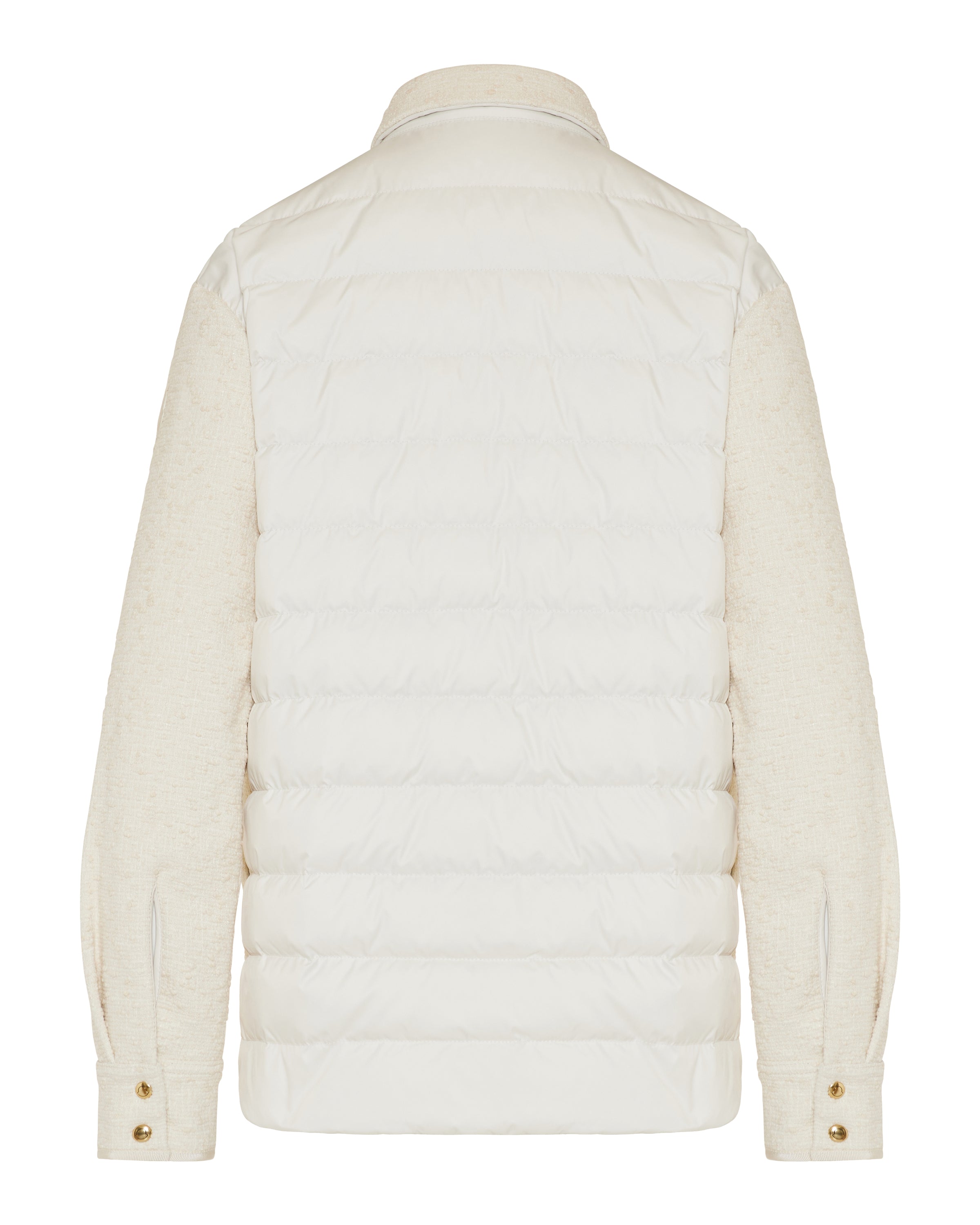 A hybrid shirt jacket that combines soft bouclé texture with lightweight down insulation for structured layering.