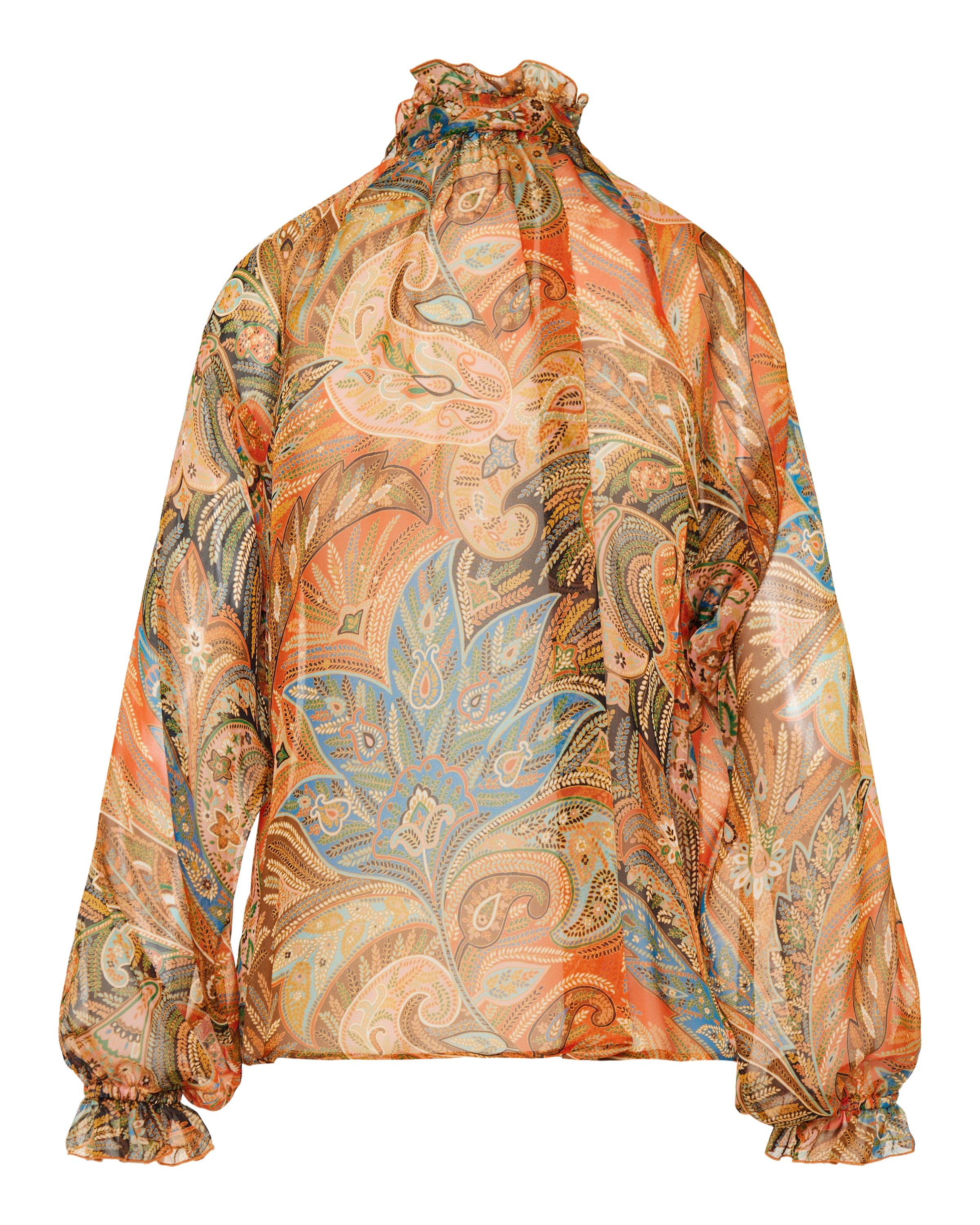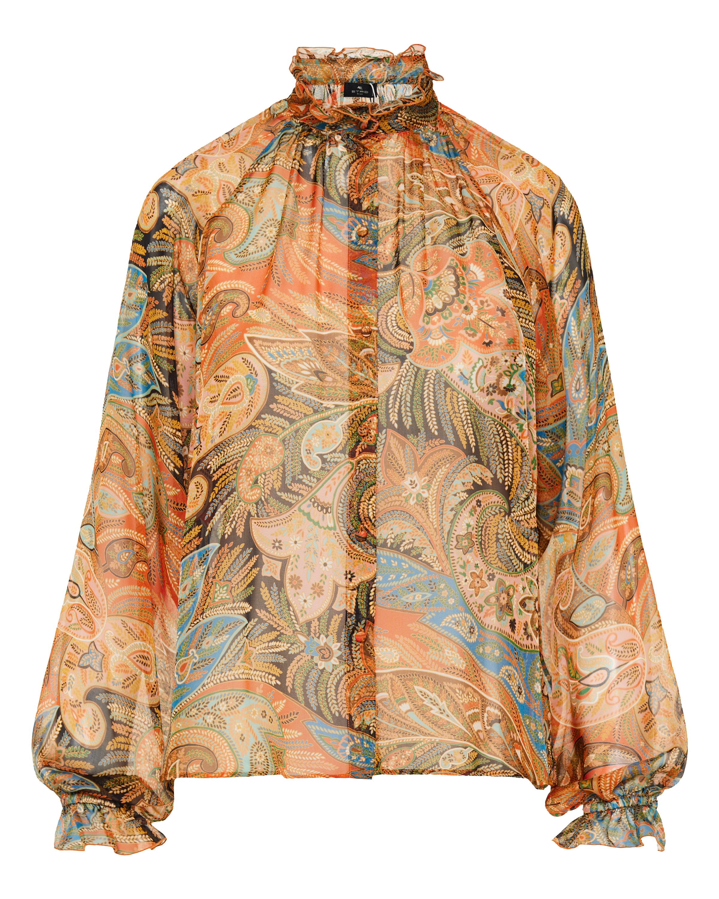 Fluid silk shirt enriched with cascading ruffles and the signature paisley motif, blending romantic movement with refined bohemian character. A statement piece designed to elevate both tailoring and denim.- 100% silk