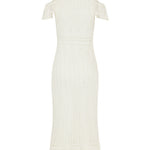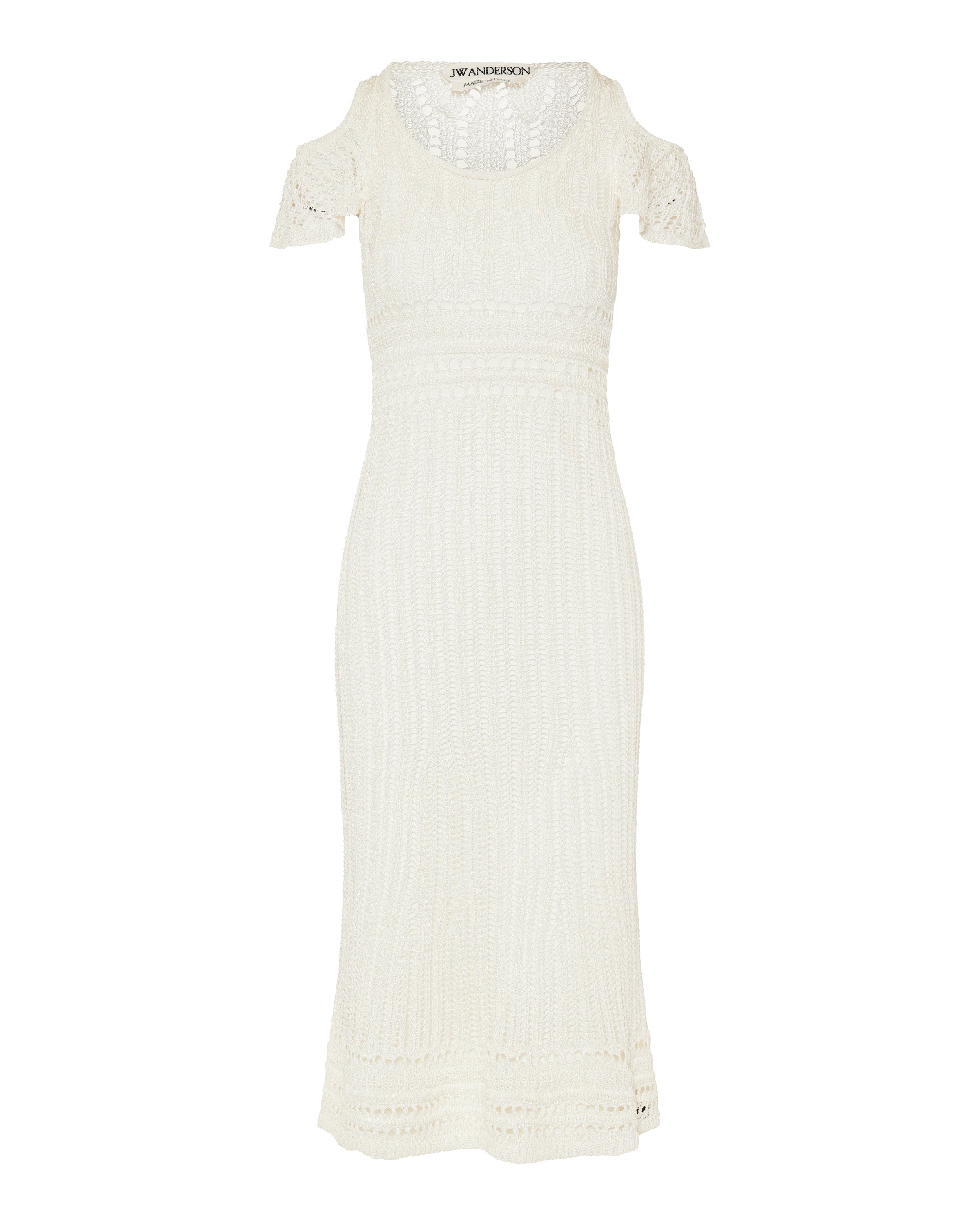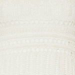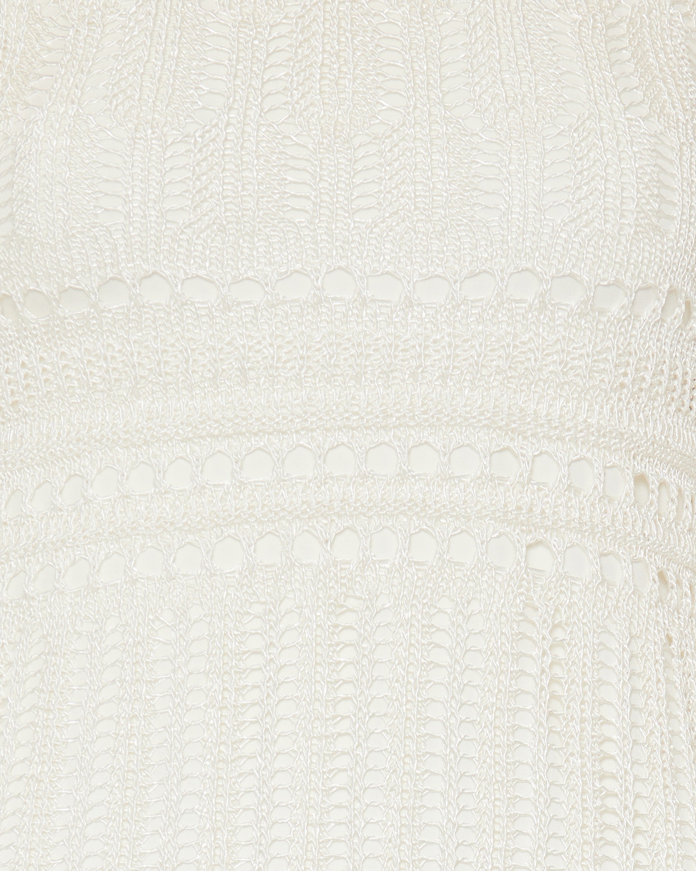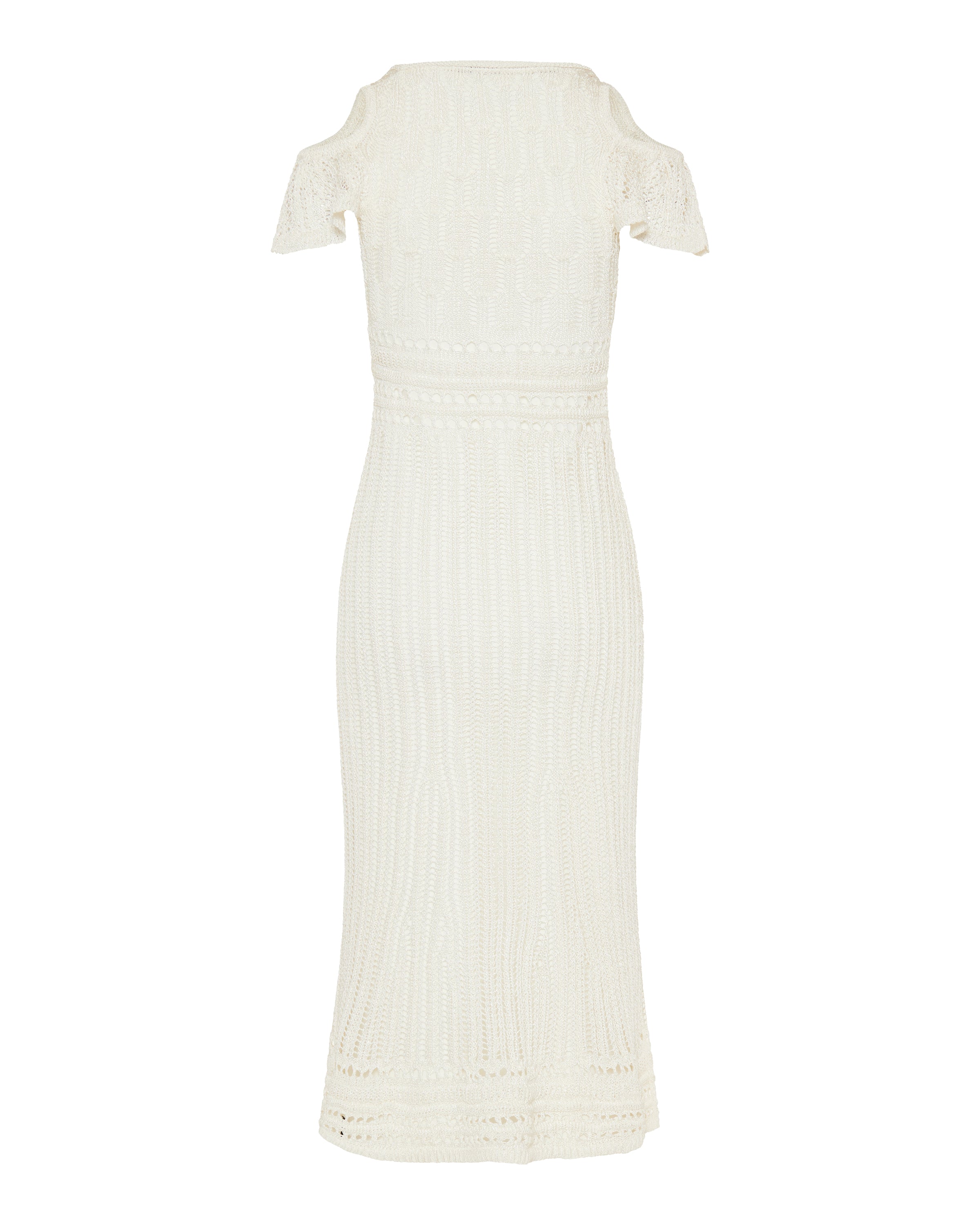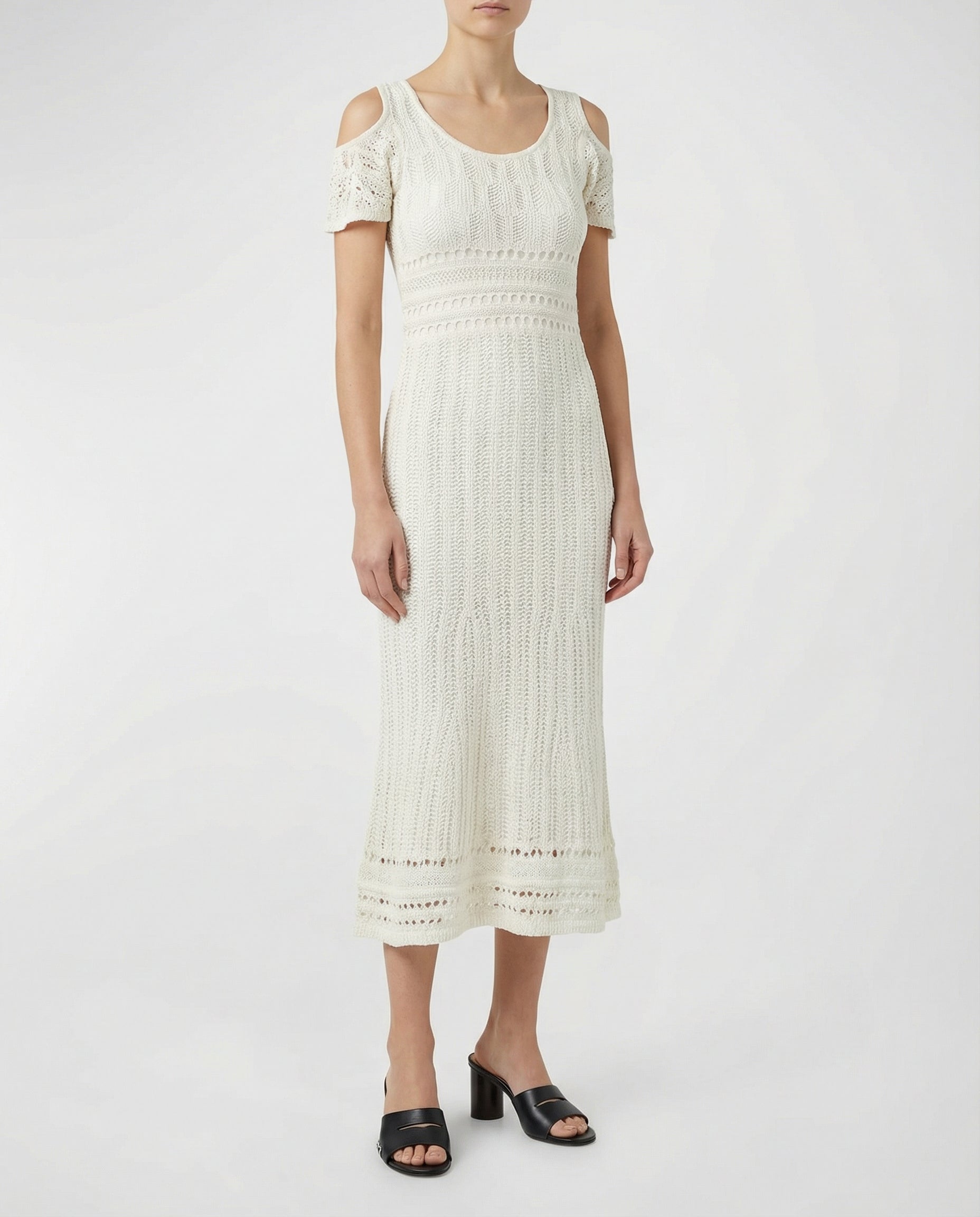 Crochet dress designed with sculptural shoulder ruffles, blending artisanal texture with a statement silhouette for elevated summer occasions.- Crochet construction