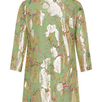 An elegant statement piece defined by fluid draping and luminous floral jacquard, bringing texture and light to a refined silhouette.