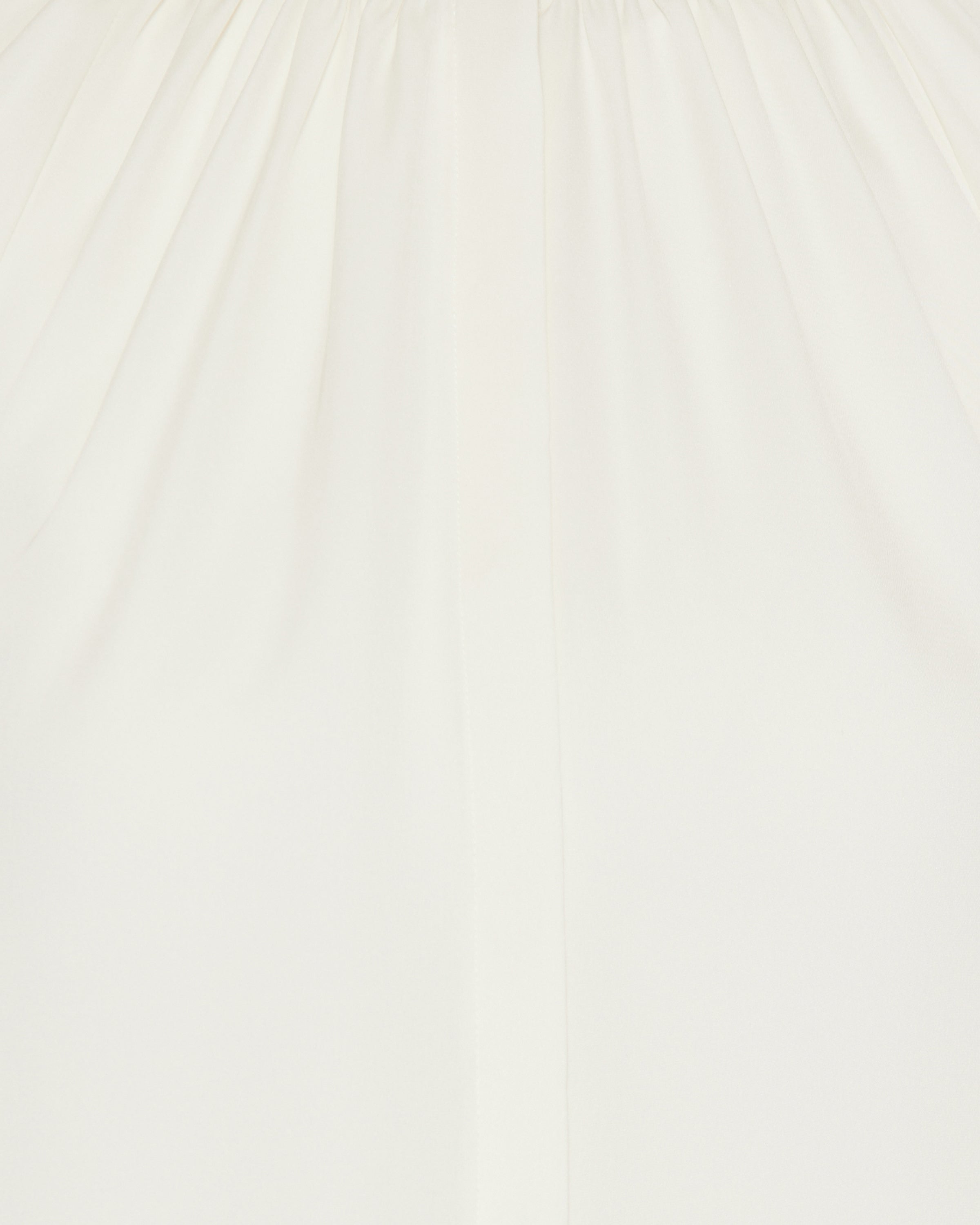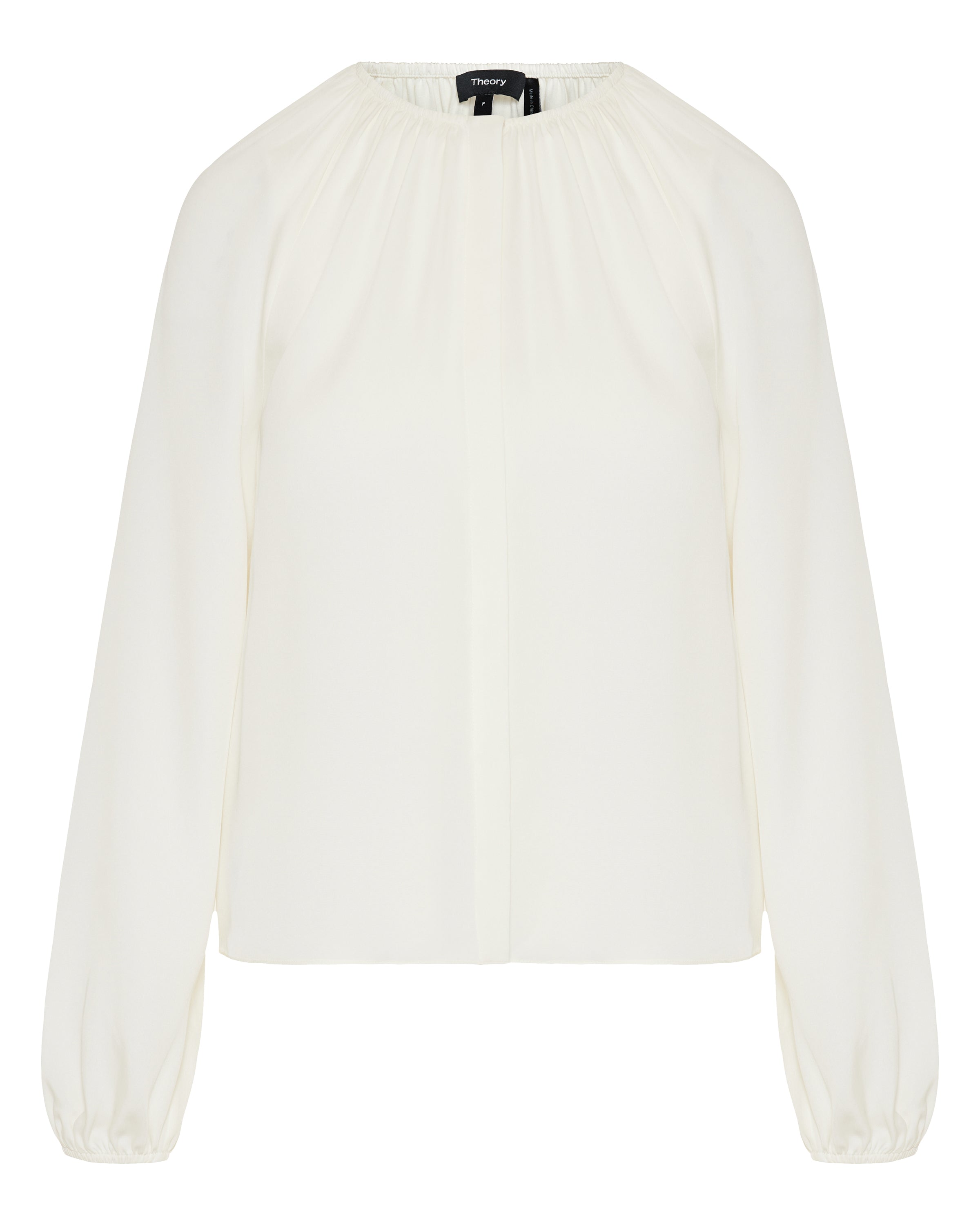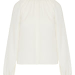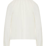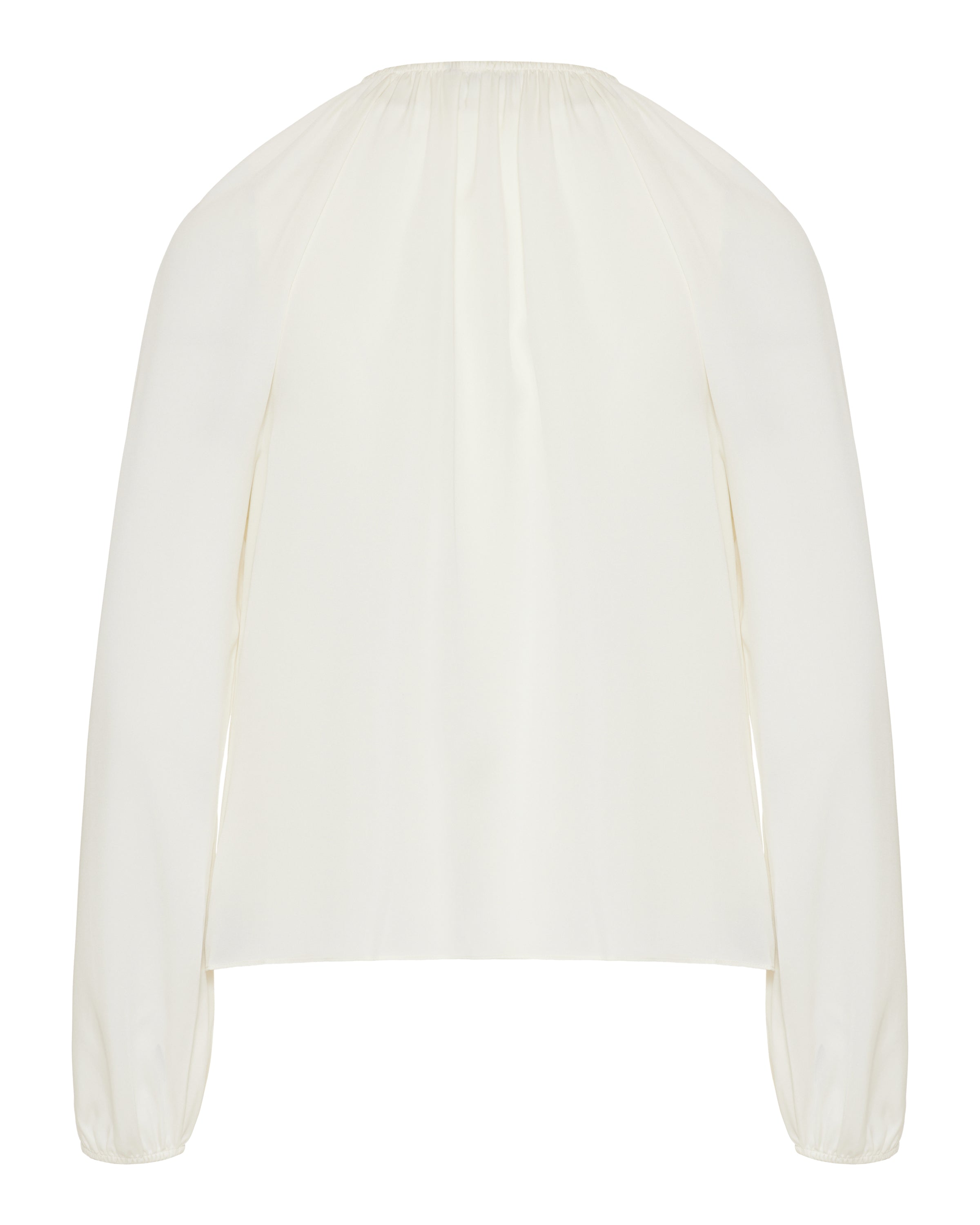 Fluid silk blouse designed with a softly gathered round neckline and voluminous long sleeves, offering an effortless, elevated silhouette in a refined ivory tone.- 100% silk