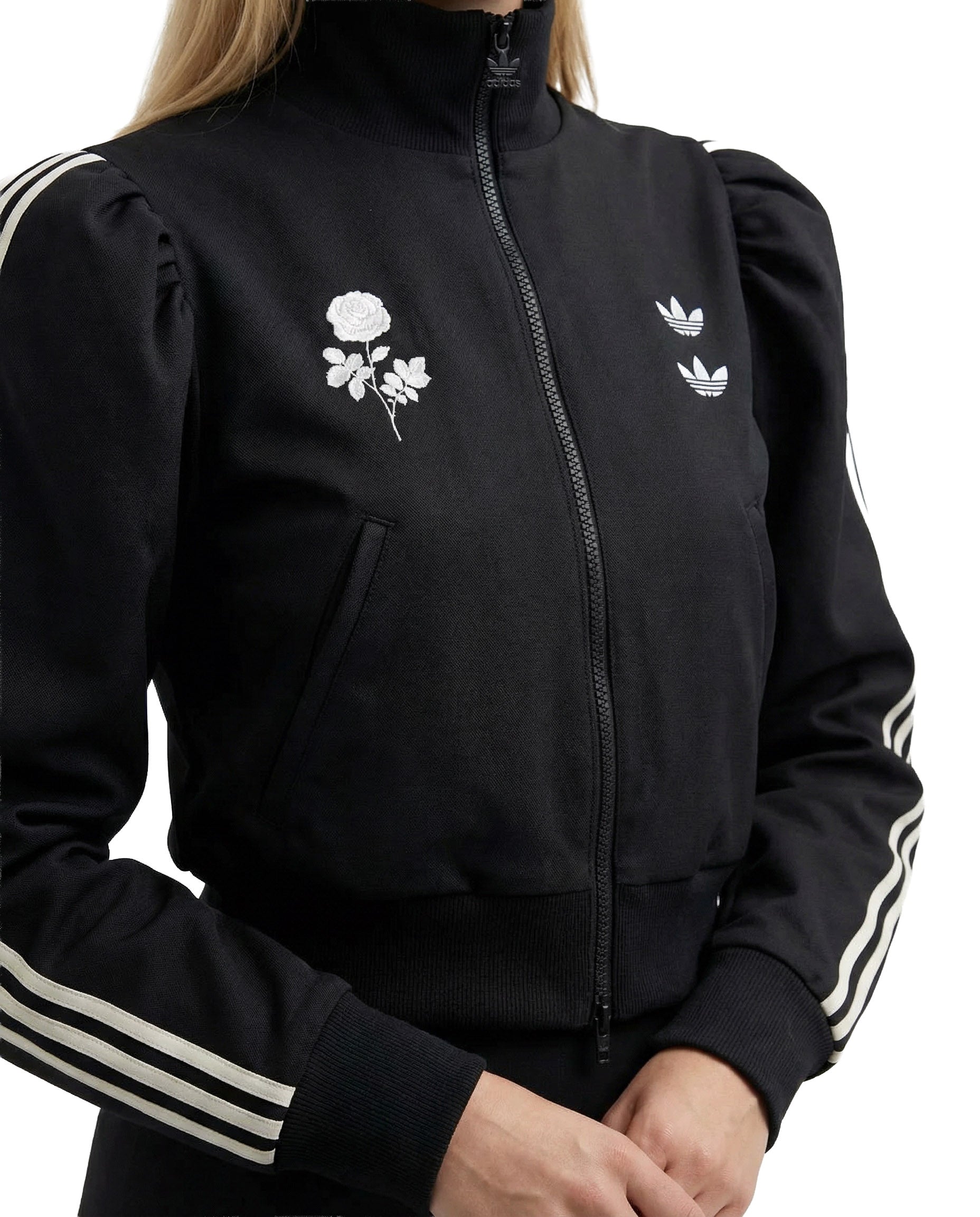 A fashion-forward adidas x Willy Chavarria blouse track jacket in deep black, combining classic sporty heritage with contemporary design. Crafted from structured woven fabric with puffed shoulders, a high mock-neck and full-zip closure, it features signature three-stripe detailing down the sleeves and embroidered Trefoil and floral motifs for elevated athleisure style. Ideal for refined everyday layered looks or standout casual outfits.