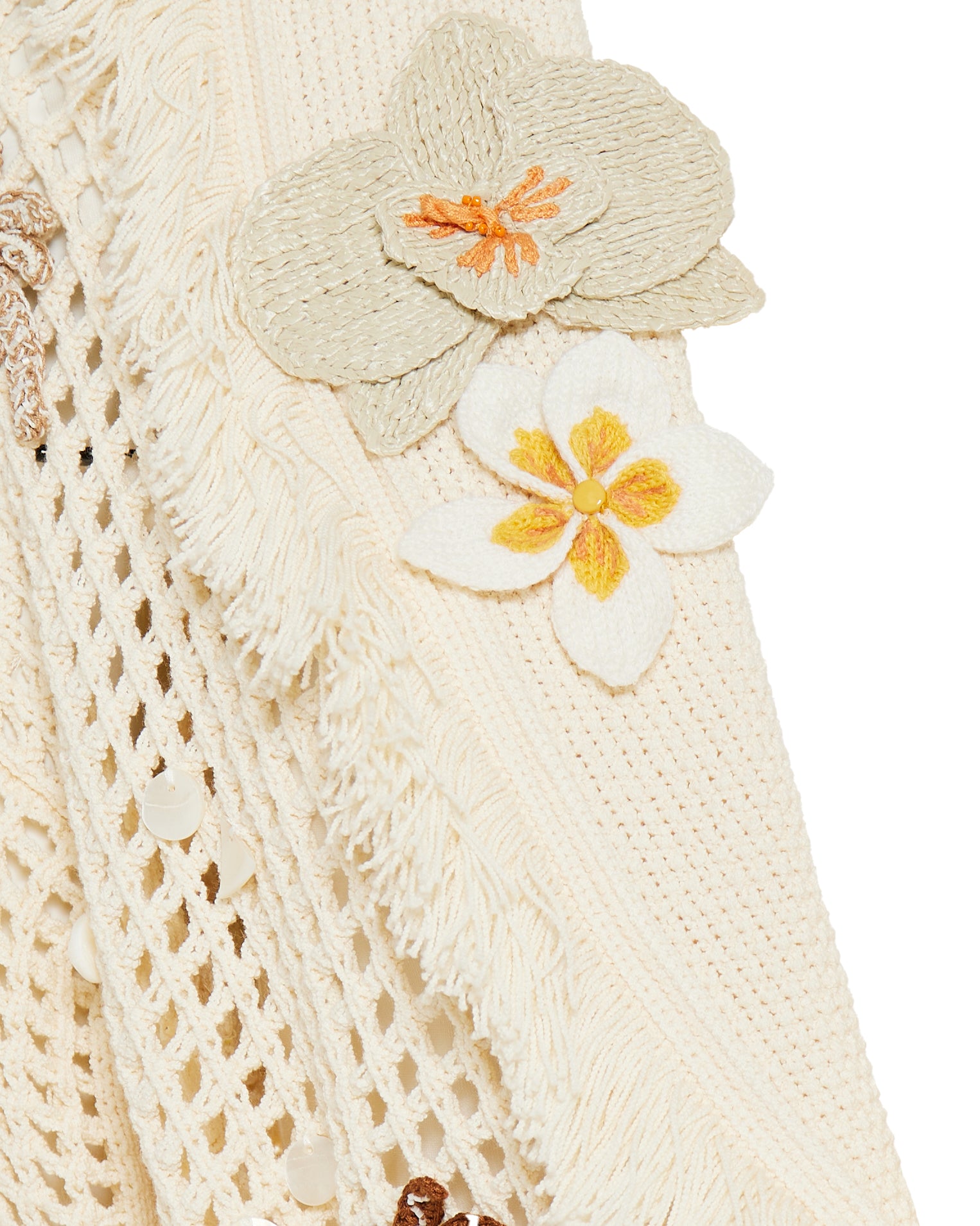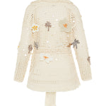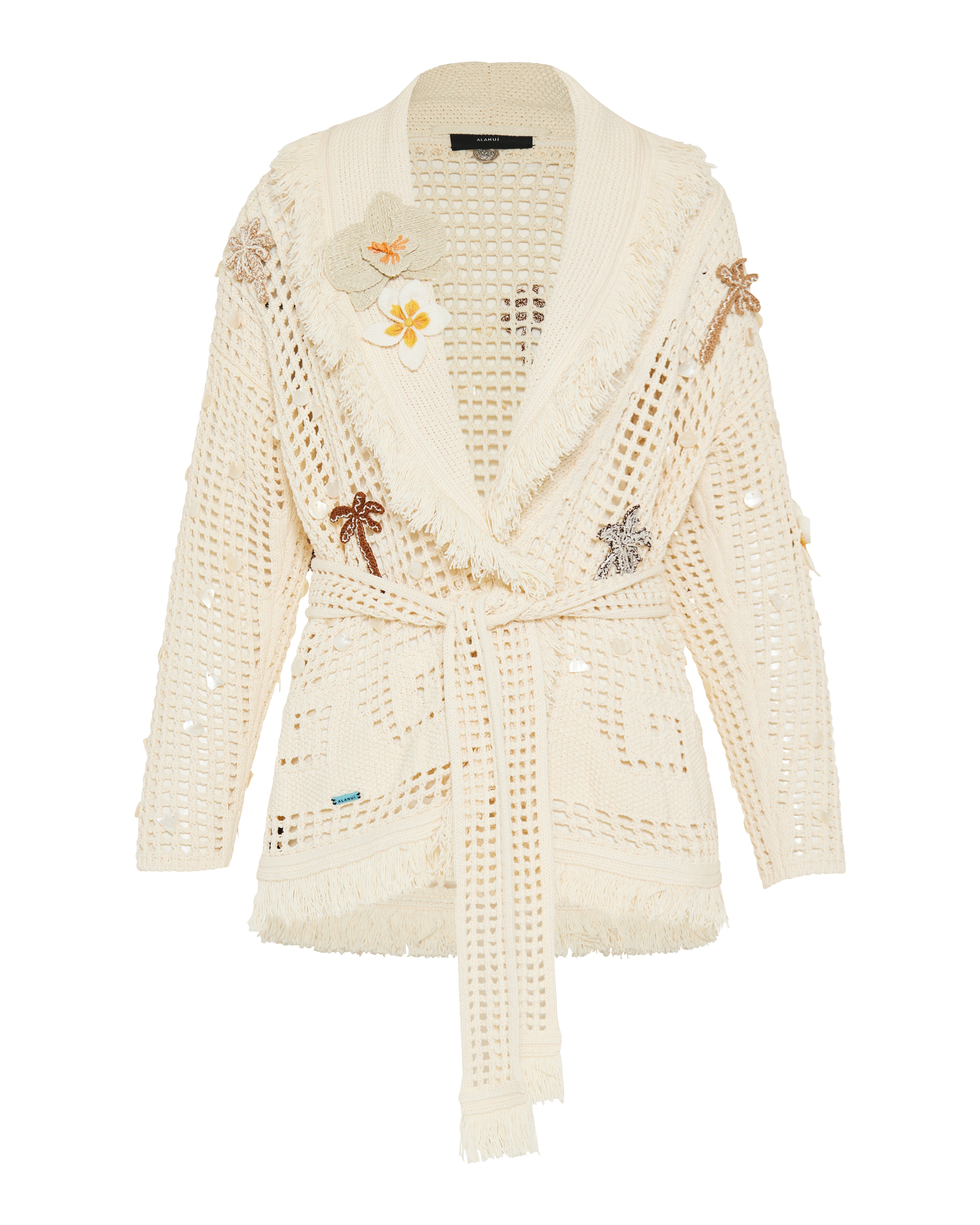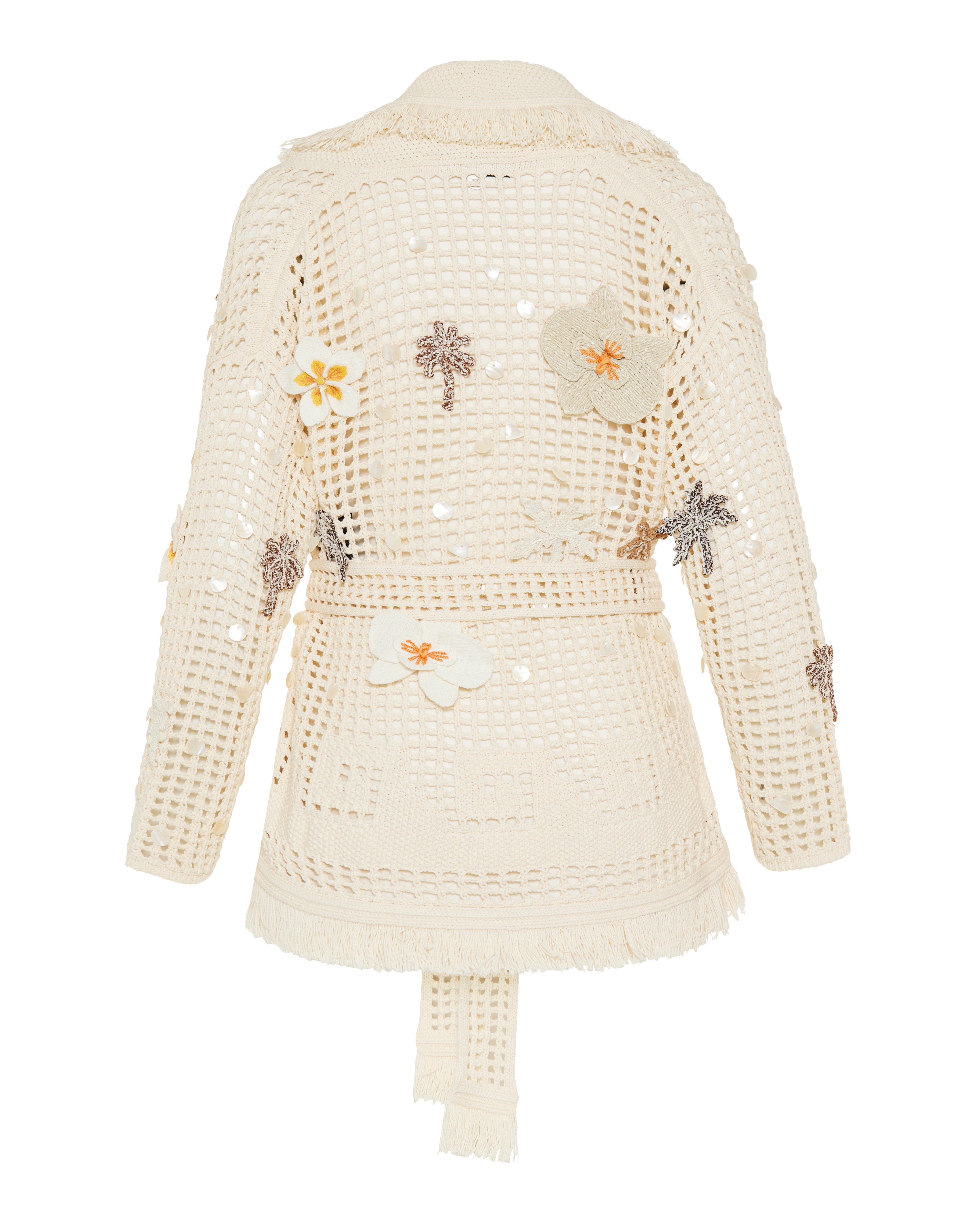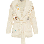 A lightweight crochet cardigan crafted from soft yarn for a relaxed, airy silhouette.