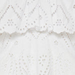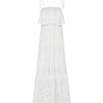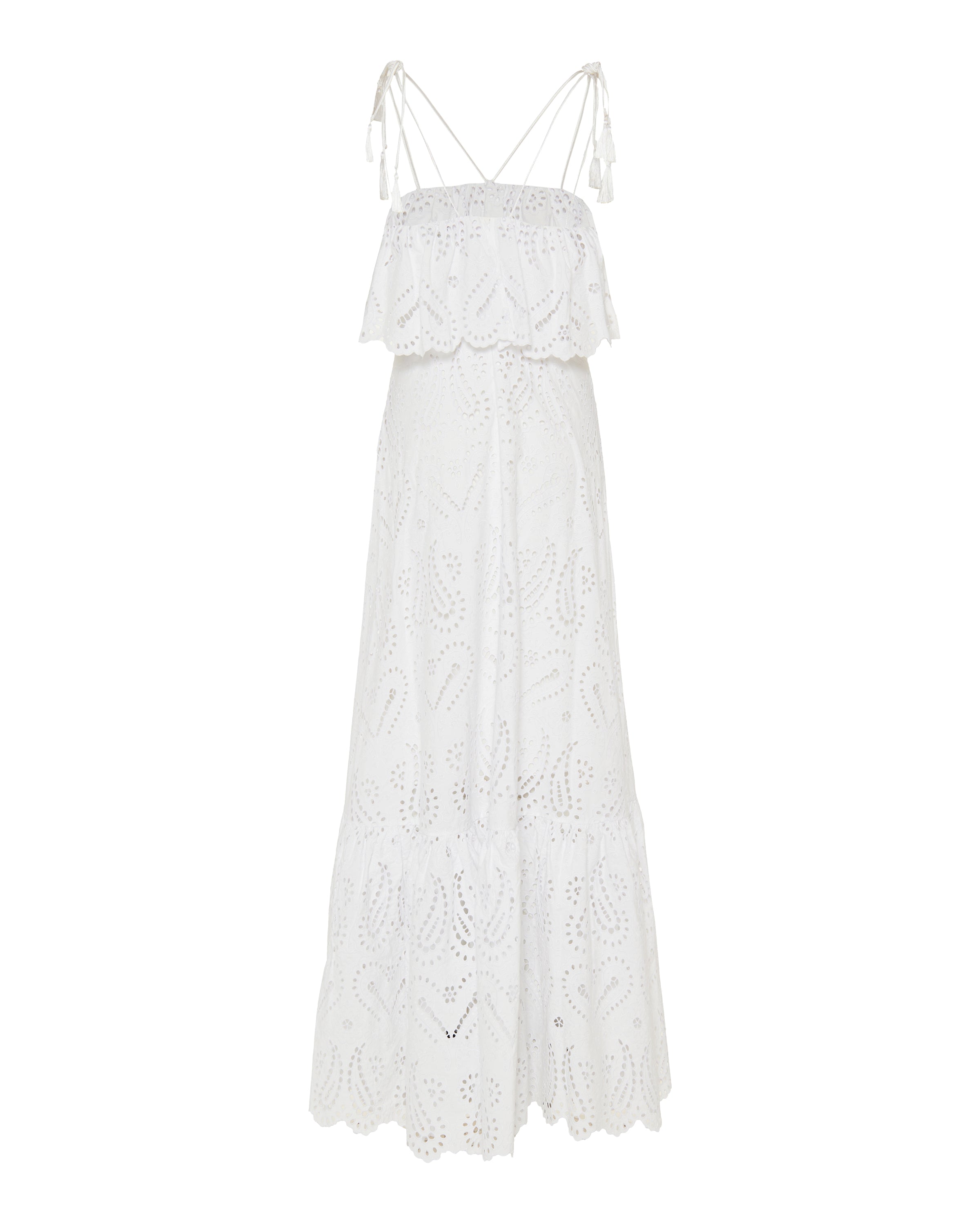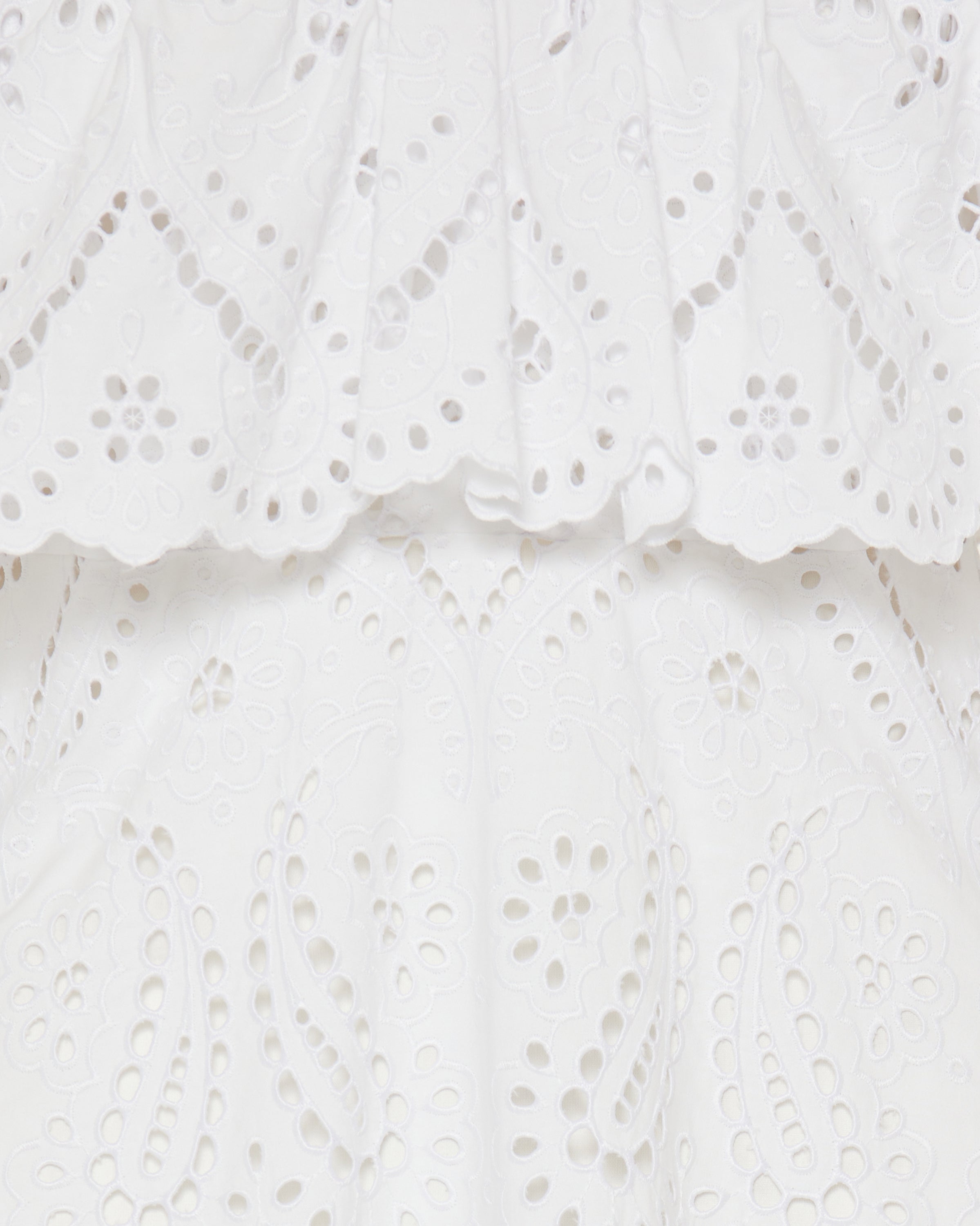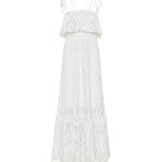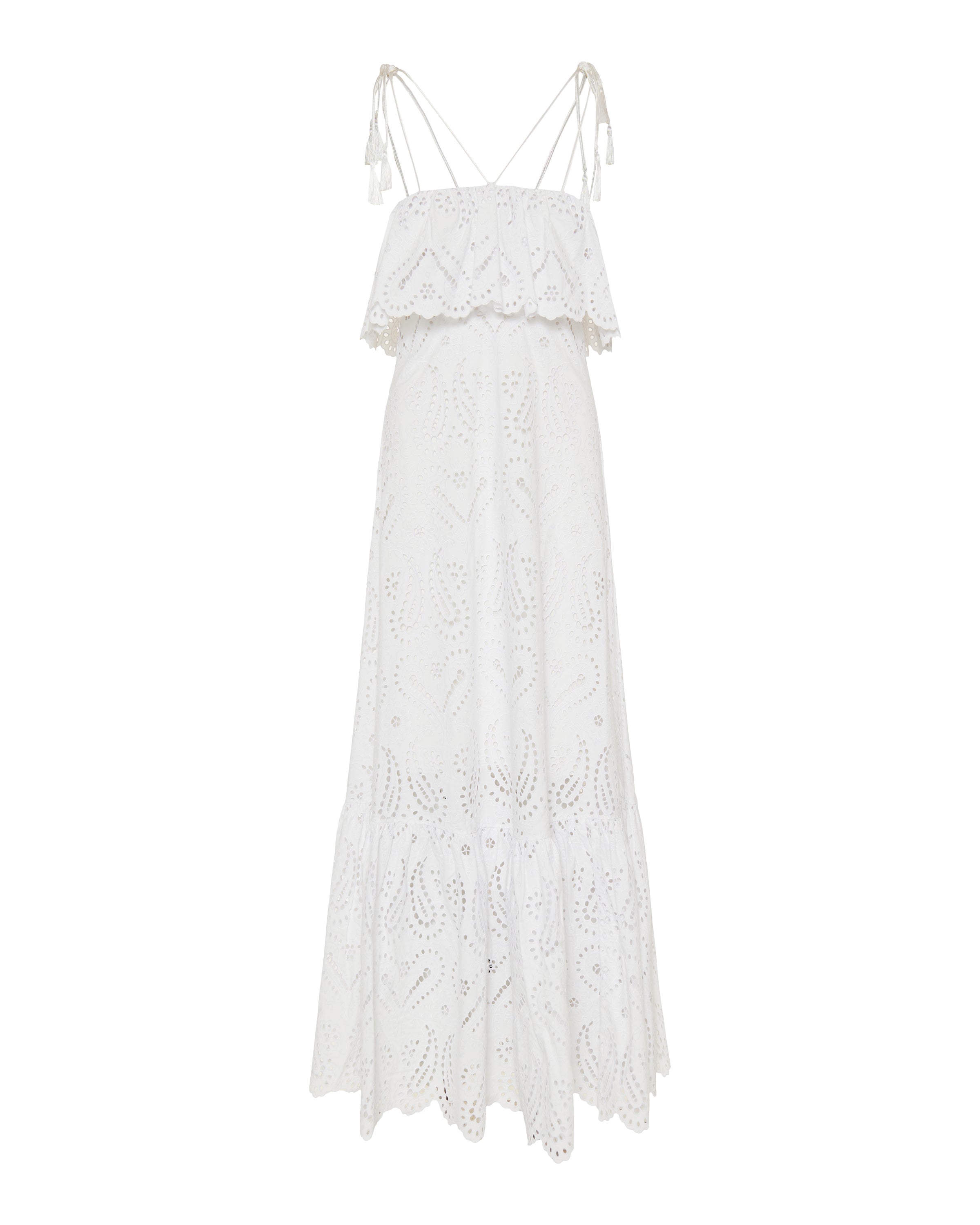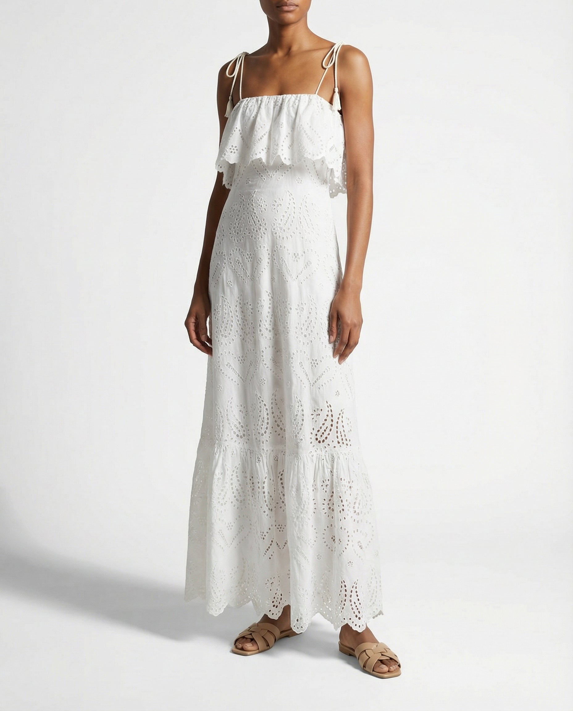 Long broderie anglaise dress enriched with paisley and heart motifs, combining romantic lace detailing with a fluid, feminine silhouette.- Broderie anglaise lace