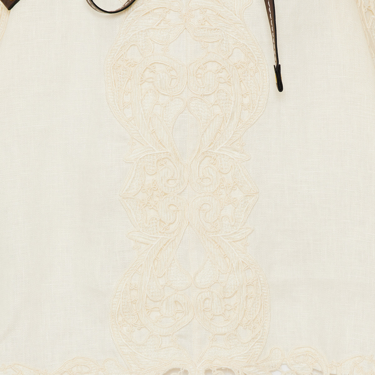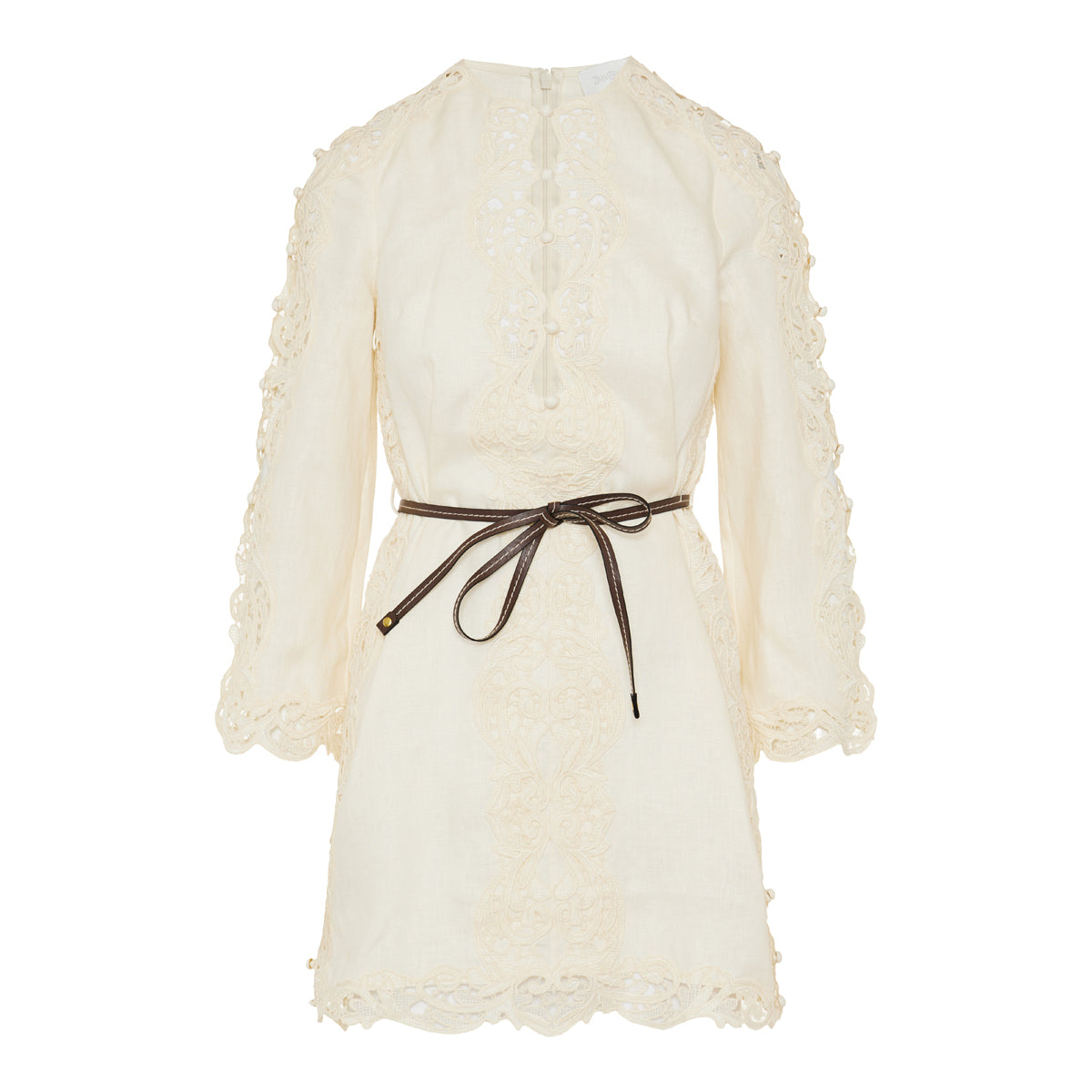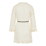 A linen mini‑length tunic richly embroidered throughout, with a button‑front, long sleeves with wide cuffs, and keyhole cut‑outs at the bust. The removable stitched leather waist belt and partial side splits create a flattering, tailored silhouette — ideal for resort wear, elegant beachside evenings or refined summer outings.