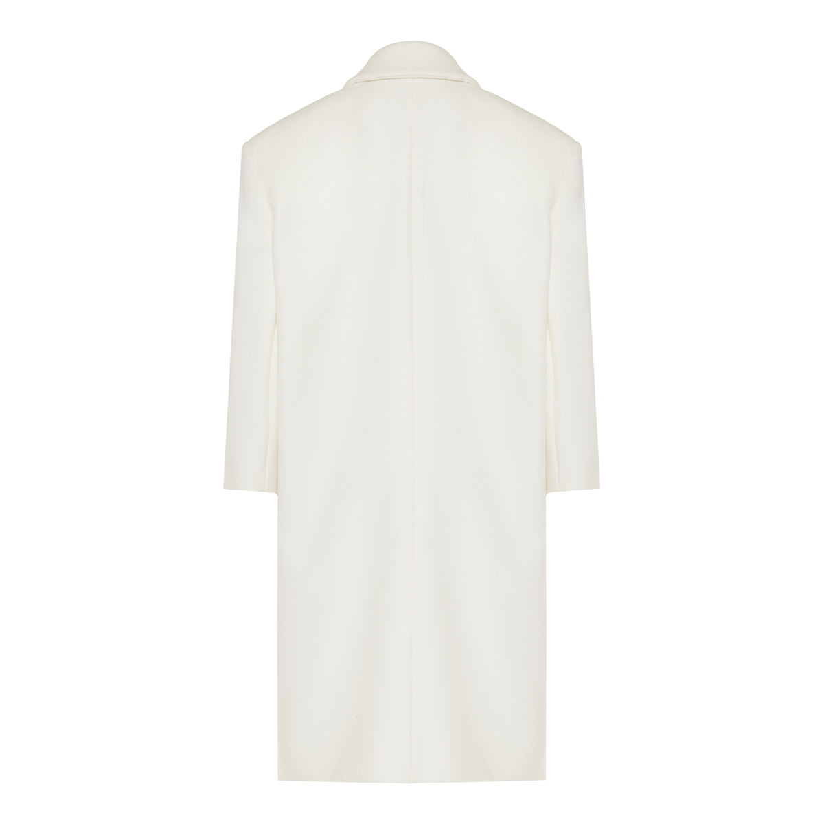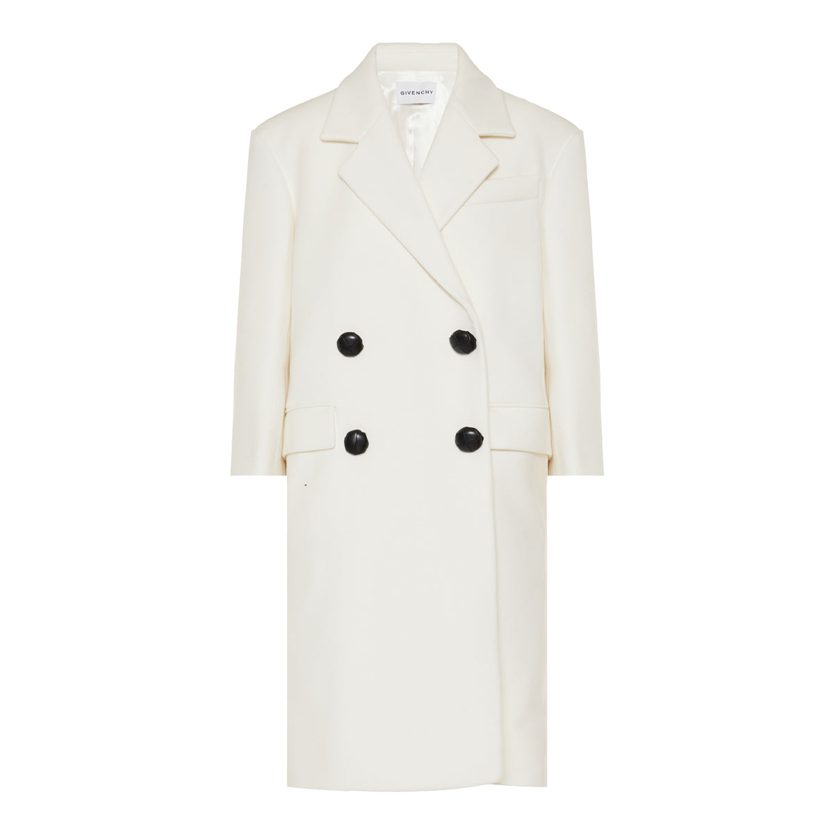 Givenchy’s double-breasted coat in wool exudes timeless sophistication with its structured tailoring and ivory hue. An elevated layer for formal dressing, refined daywear, or cold-weather occasions, offering understated luxury with impeccable lines.