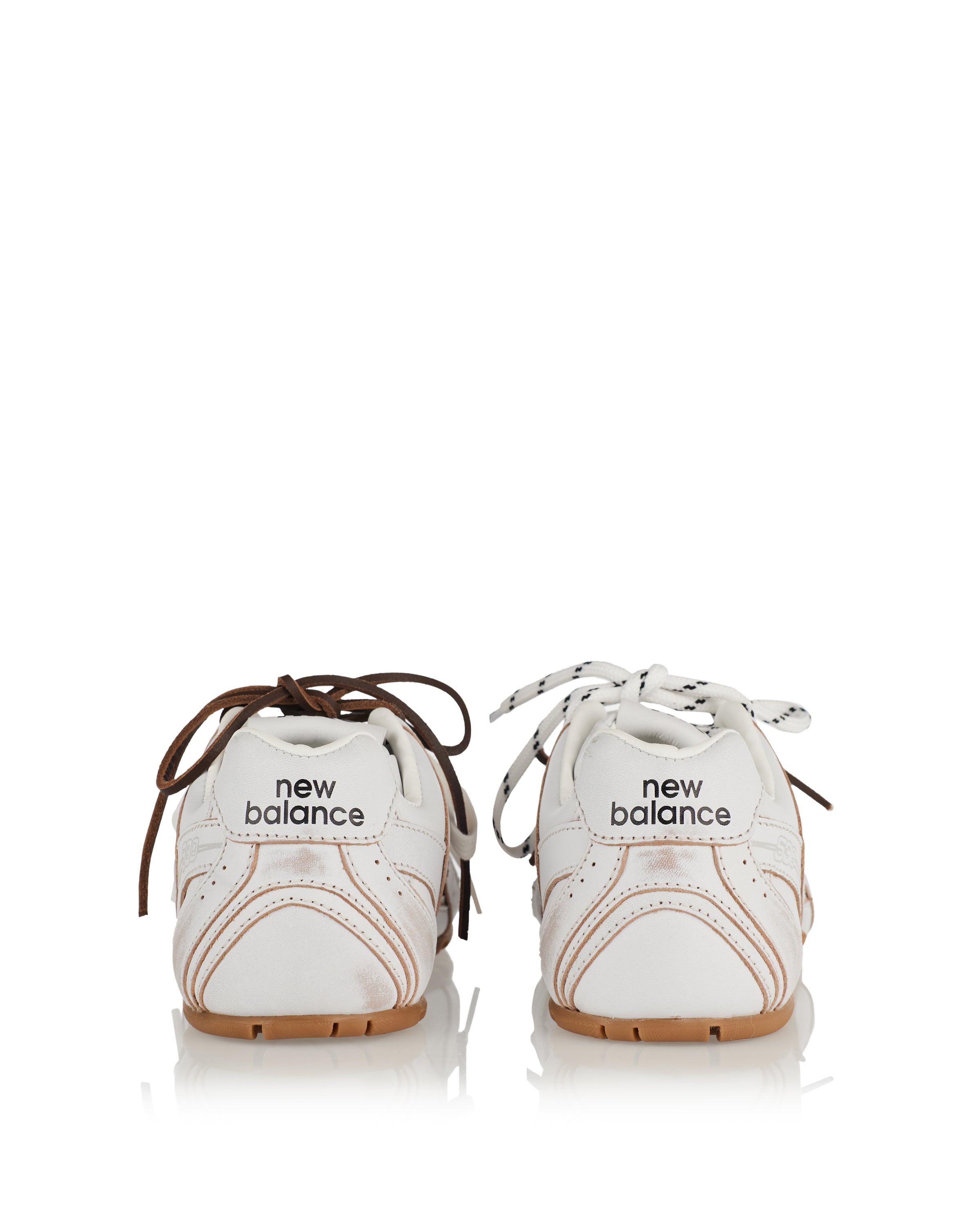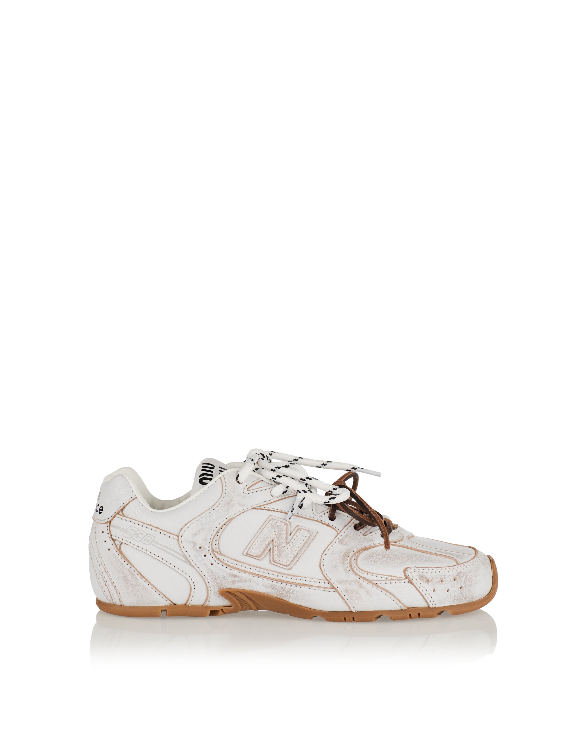 Statement sneakers from Miu Miu’s ongoing collaboration with New Balance, reimagining the heritage 530 silhouette with a super-lightweight profile and premium leather upper. Finished with contrasting laces, co-branded tongue label and a low-profile rubber sole, they merge sporty performance with contemporary luxury. Ideal for refined everyday wear or modern casual outfits that balance comfort with high fashion.