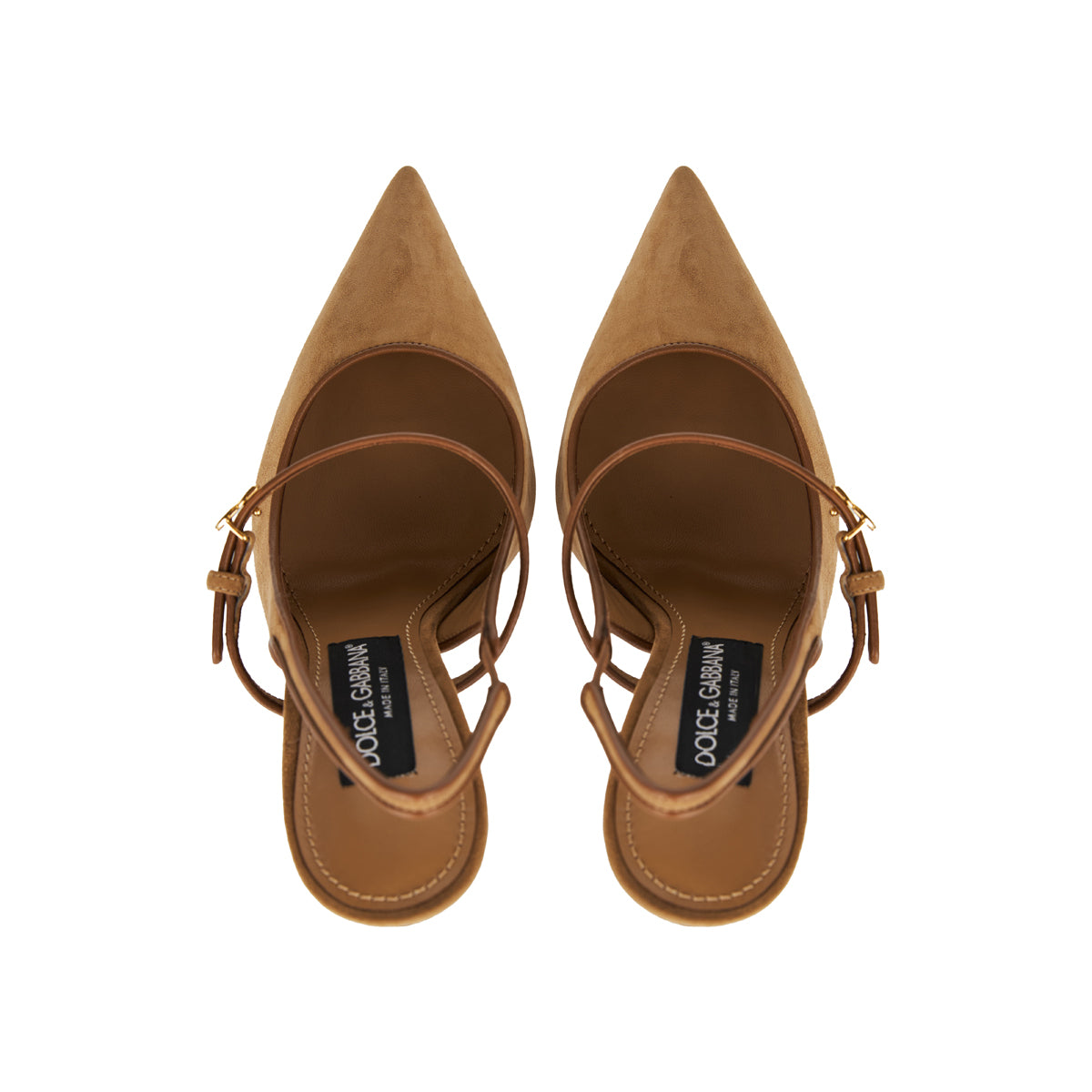 Crafted from supple camel suede, these slingback pumps feature a pointed silhouette with a discreet logo appliqué across the upper and an elasticated back strap for a seamless fit. A refined suede finish and minimalist structure evoke contemporary Italian craftsmanship.