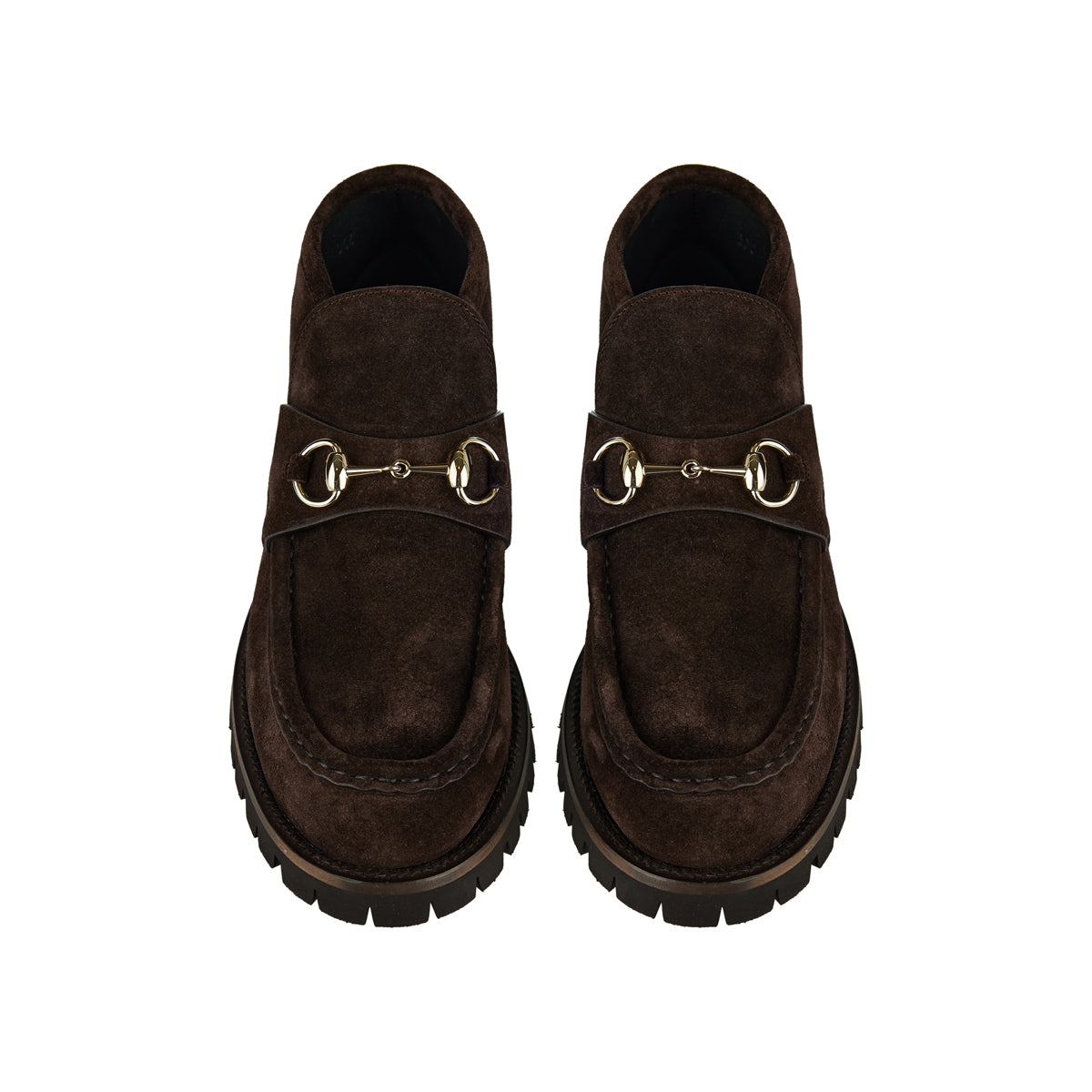 Refined ankle boots that bridge classic heritage and modern sophistication. Crafted in supple suede, they feature the iconic Horsebit hardware — a subtle emblem of luxury. With slim silhouettes and flat rubber soles, they offer understated elegance and comfort for polished urban outfits or elevated casual looks.