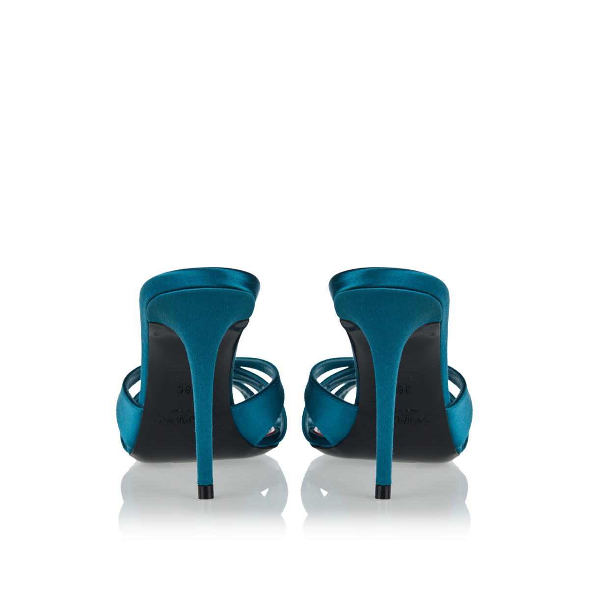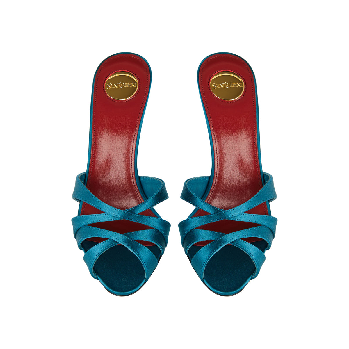 These Saint Laurent mules are crafted from a satin‑crepe blend, featuring a crisscross almond toe and a covered 95 mm stiletto heel. With a slip-on silhouette, leather lining, and sole, they combine elegant evening style with contemporary sophistication, ideal for formal events, cocktail parties, or refined evening wear.