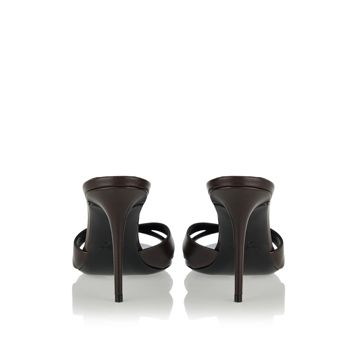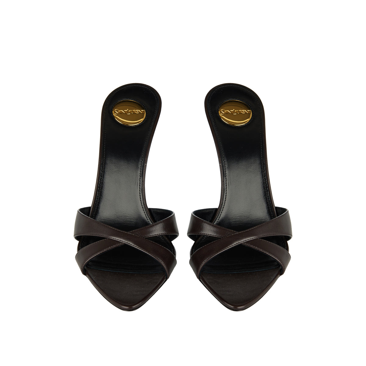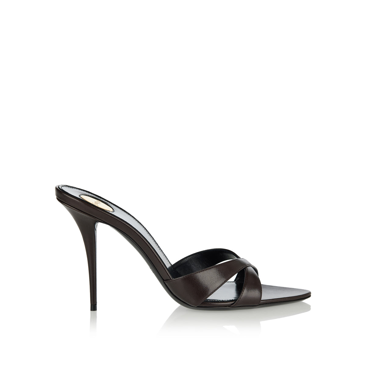Elegant and sculptural, these Saint Laurent sandals are crafted in supple lamb leather. Featuring a pointed open toe, criss‑cross straps, and a 95 mm stiletto heel, they blend modern glamour with refined Parisian style.