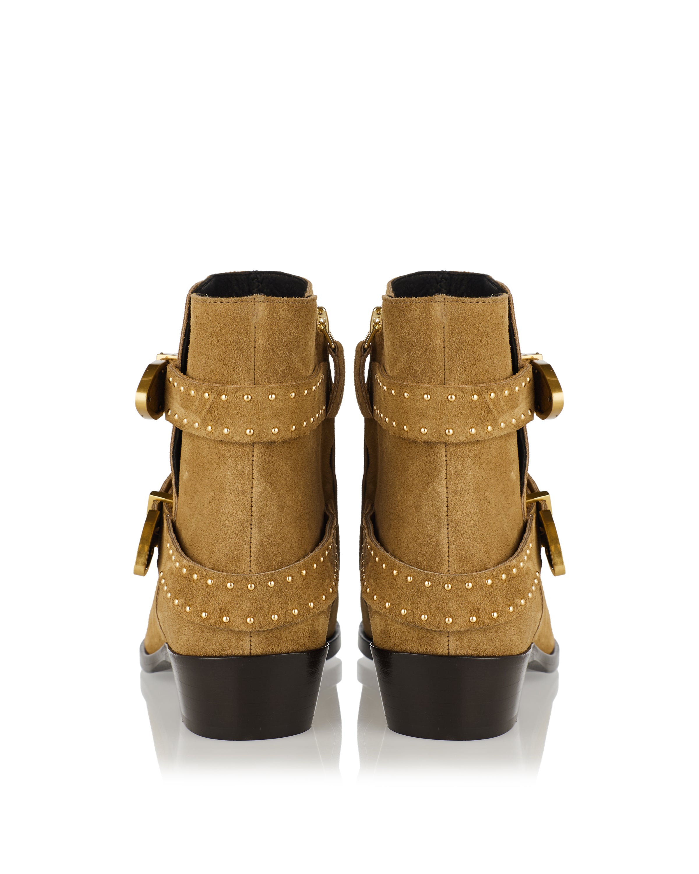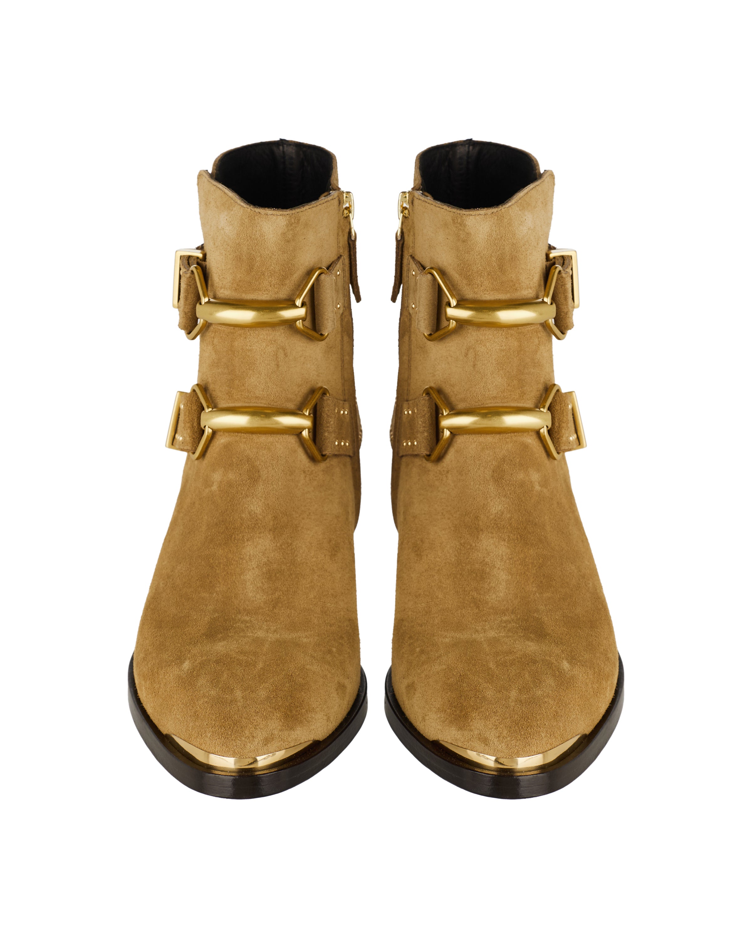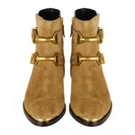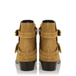 Cowboy‑style suede calf‑leather boots by Isabel Marant with adjustable metal buckle straps and a pointed toe accented with gold‑tone hardware. Featuring side zippers and a low Cuban heel, they offer a relaxed yet refined silhouette — ideal for elevated everyday ensembles or pairing with denim and dresses for effortless Parisian‑cool outfits.