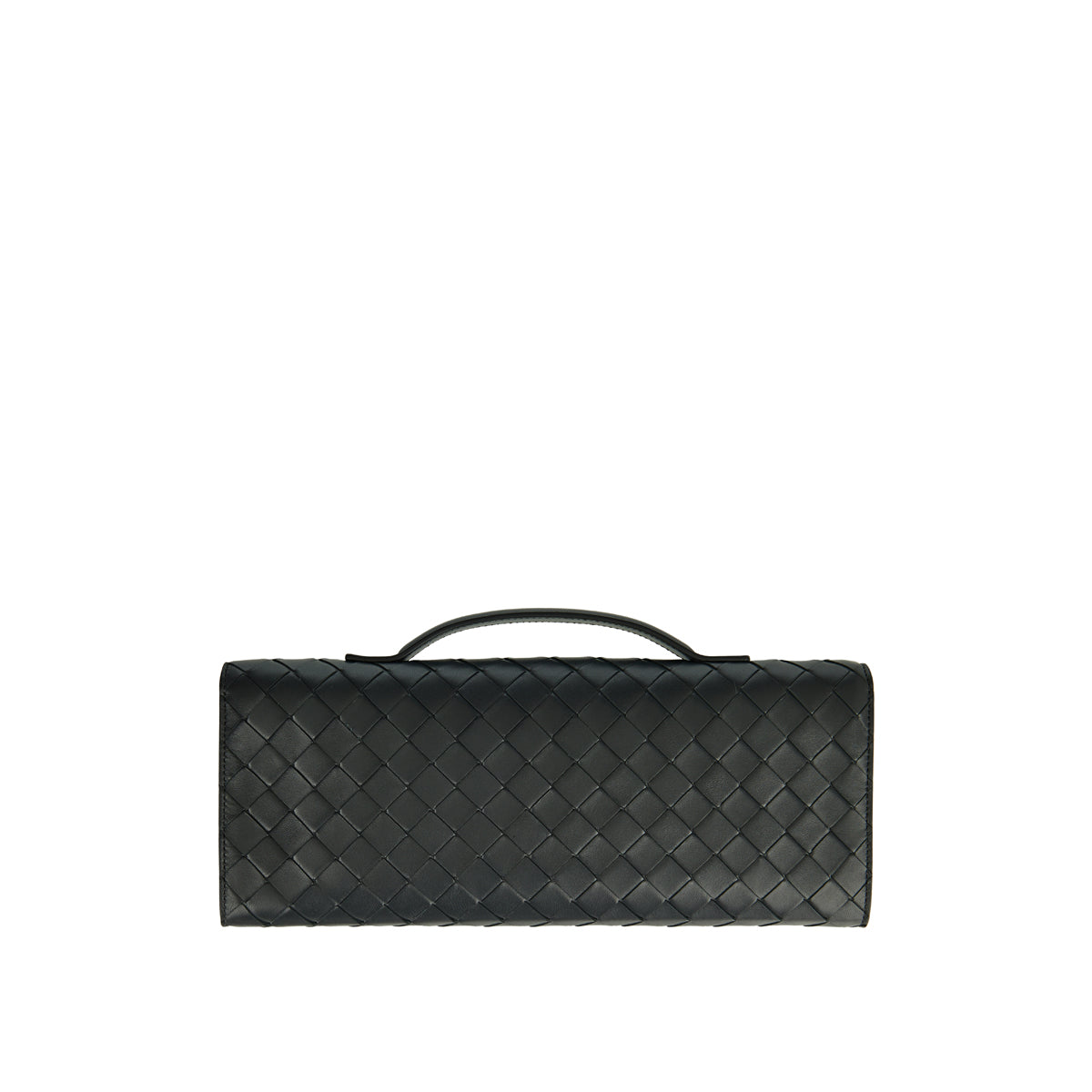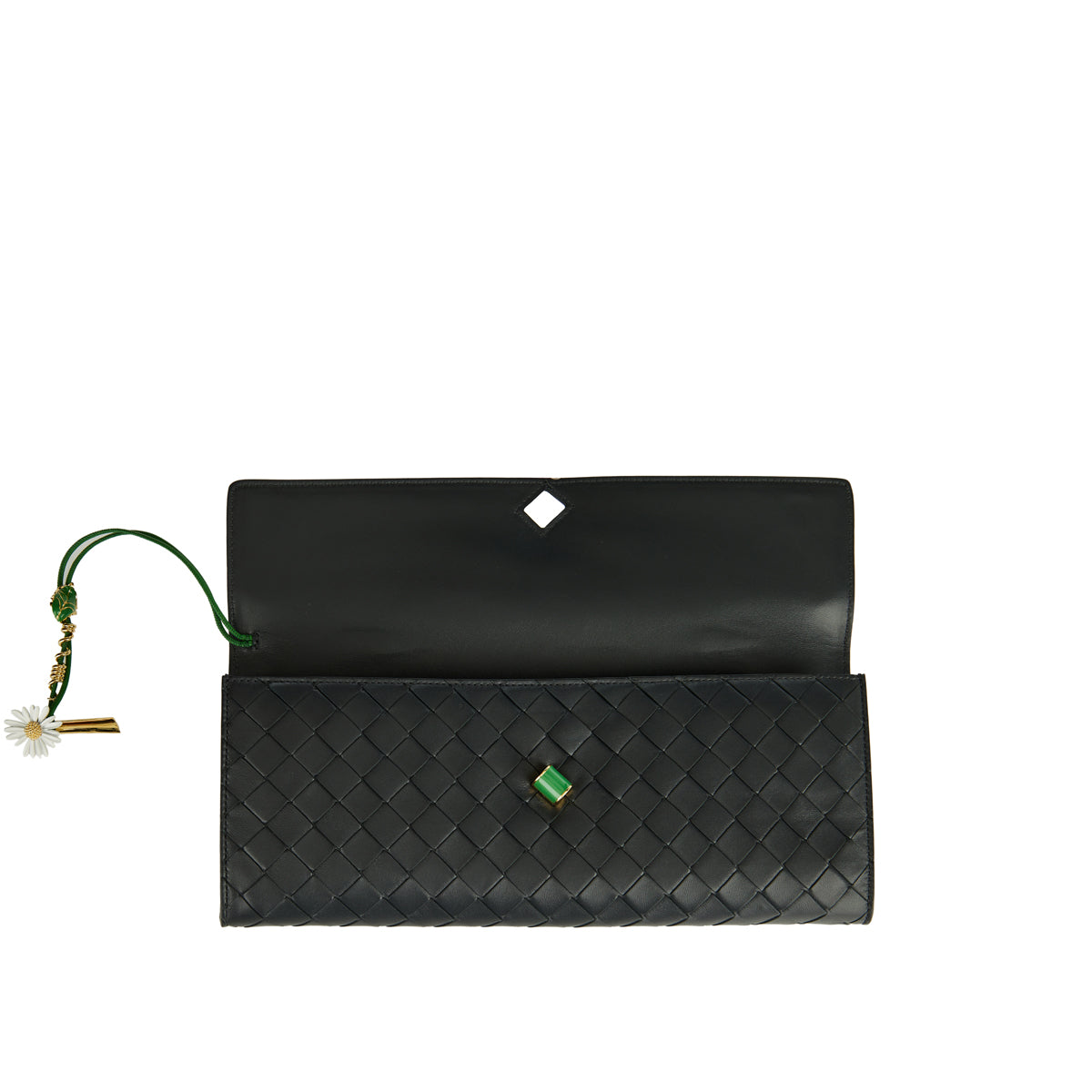 Bottega Veneta's Andiamo Clutch in Ardoise is crafted from lambskin leather and woven in the historic Intrecciato pattern. An enamelled daisy closure, one top handle, six card slots, and one additional pocket complete its elegant design.
