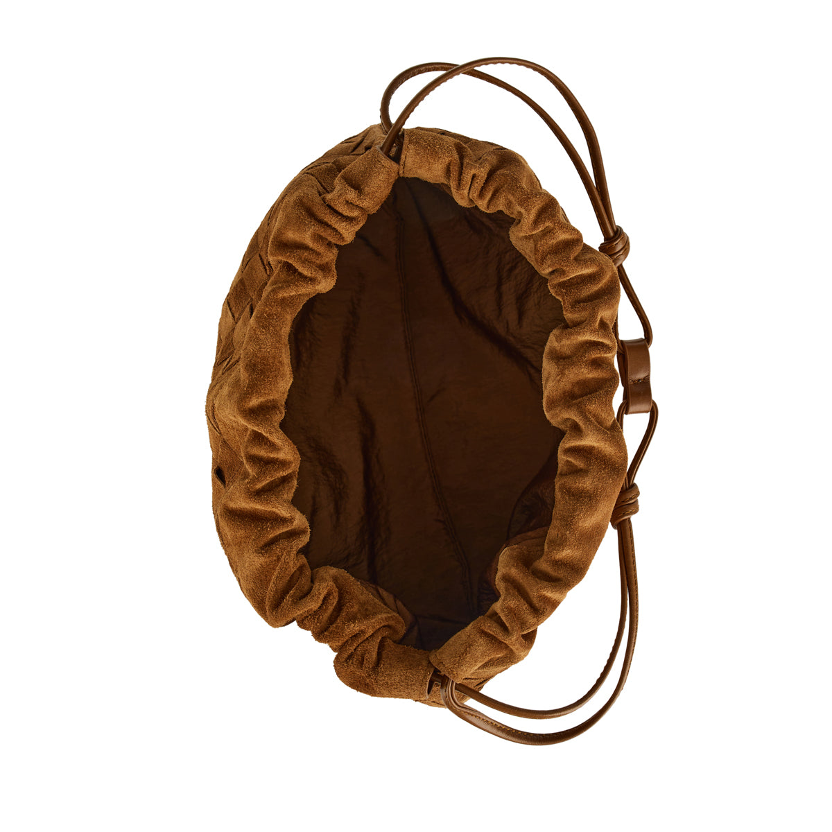A finely crafted clutch from Bottega Veneta in soft suede leather featuring the brand’s iconic Intrecciato weave, a drawstring top closure and a slender strap—perfect for elevated evening wear or refined casual luxury.