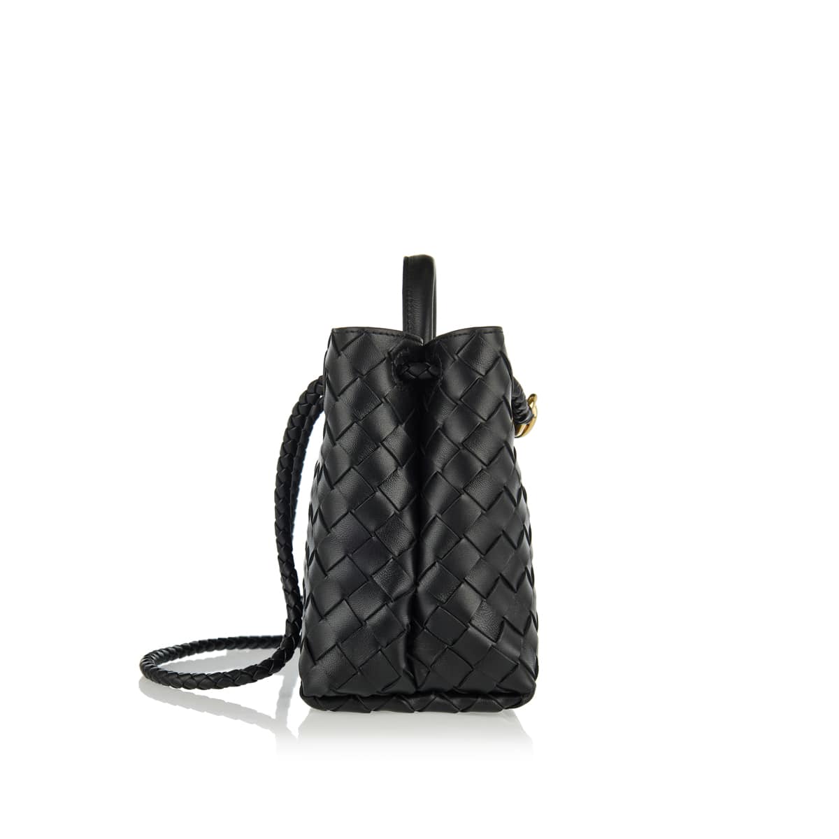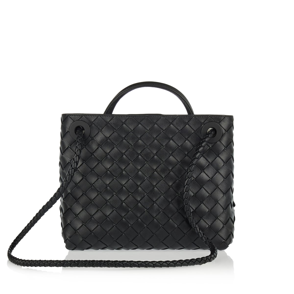 The Andiamo medium top-handle bag is crafted in supple Intrecciato nappa leather with sliding cross-body strap and signature knot detail in gold at the front. It features compartmented interior with one zip pocket, two open pockets and magnet closure.