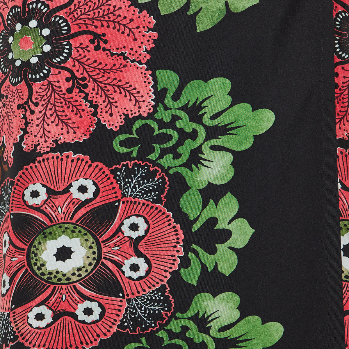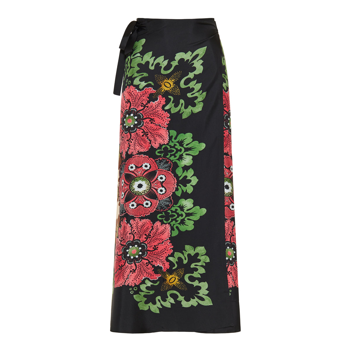 A luxurious silk twill skirt featuring the vibrant Bounty Placée print, characterized by bold floral motifs in rich red, ochre, and green tones. Designed with a wrap-around silhouette, this piece offers both elegance and versatility.