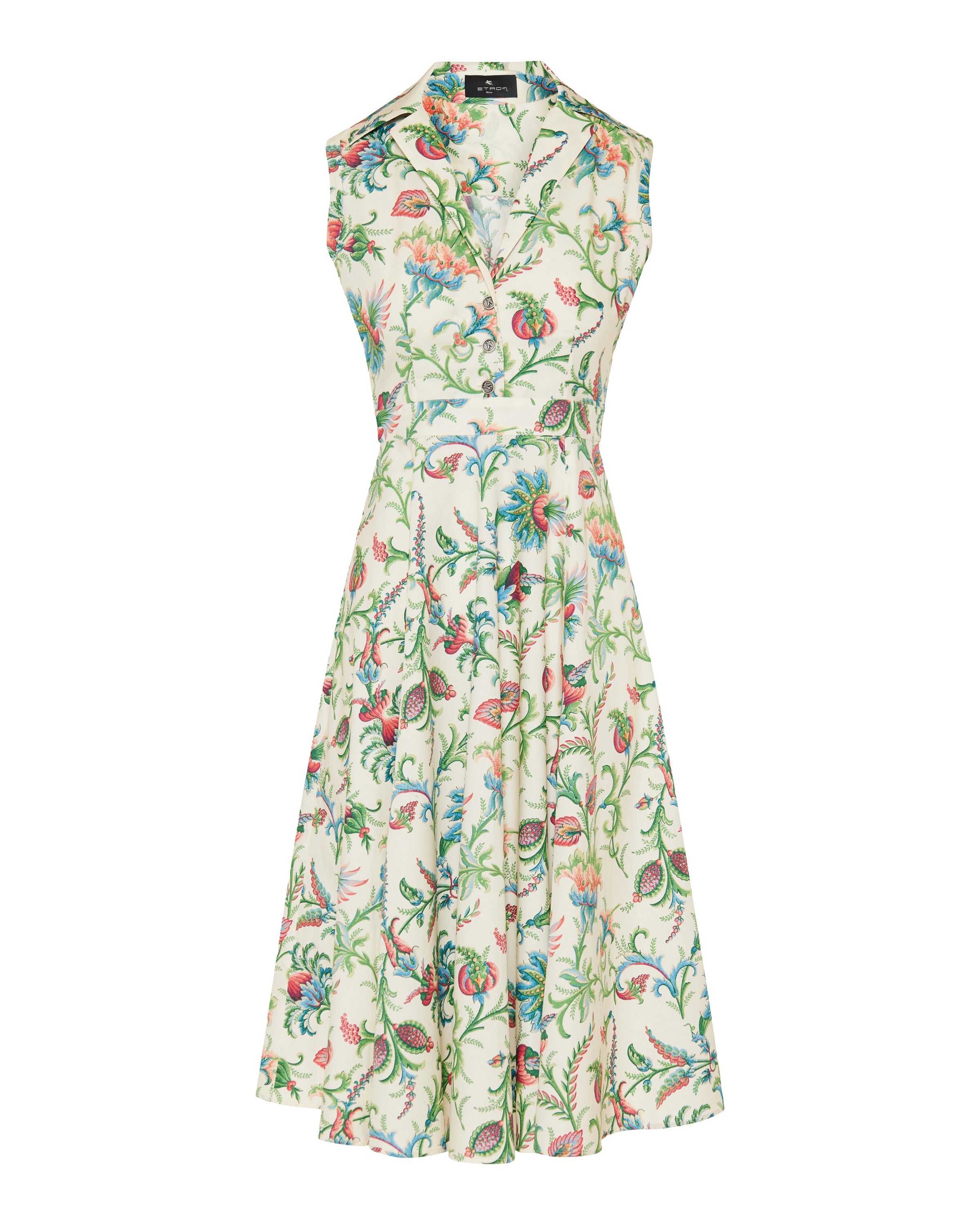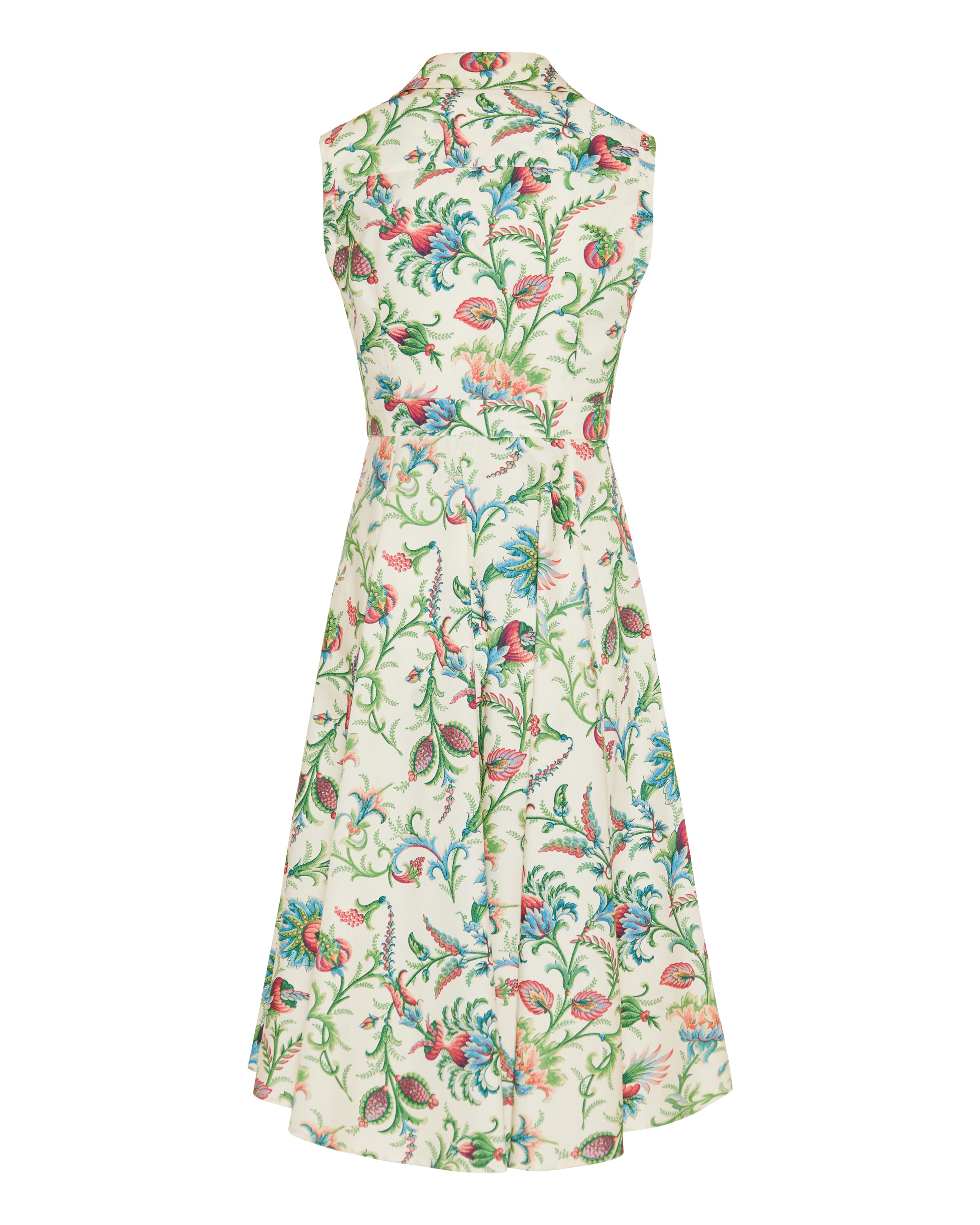 A sleeveless midi dress in a delicate floral print, featuring a tailored waist with a coordinating belt. Designed for elevated casual and refined daytime wear, the dress combines feminine elegance with modern tailoring. Its lightweight fabric and versatile silhouette make it ideal for chic day-to-evening ensembles.