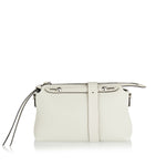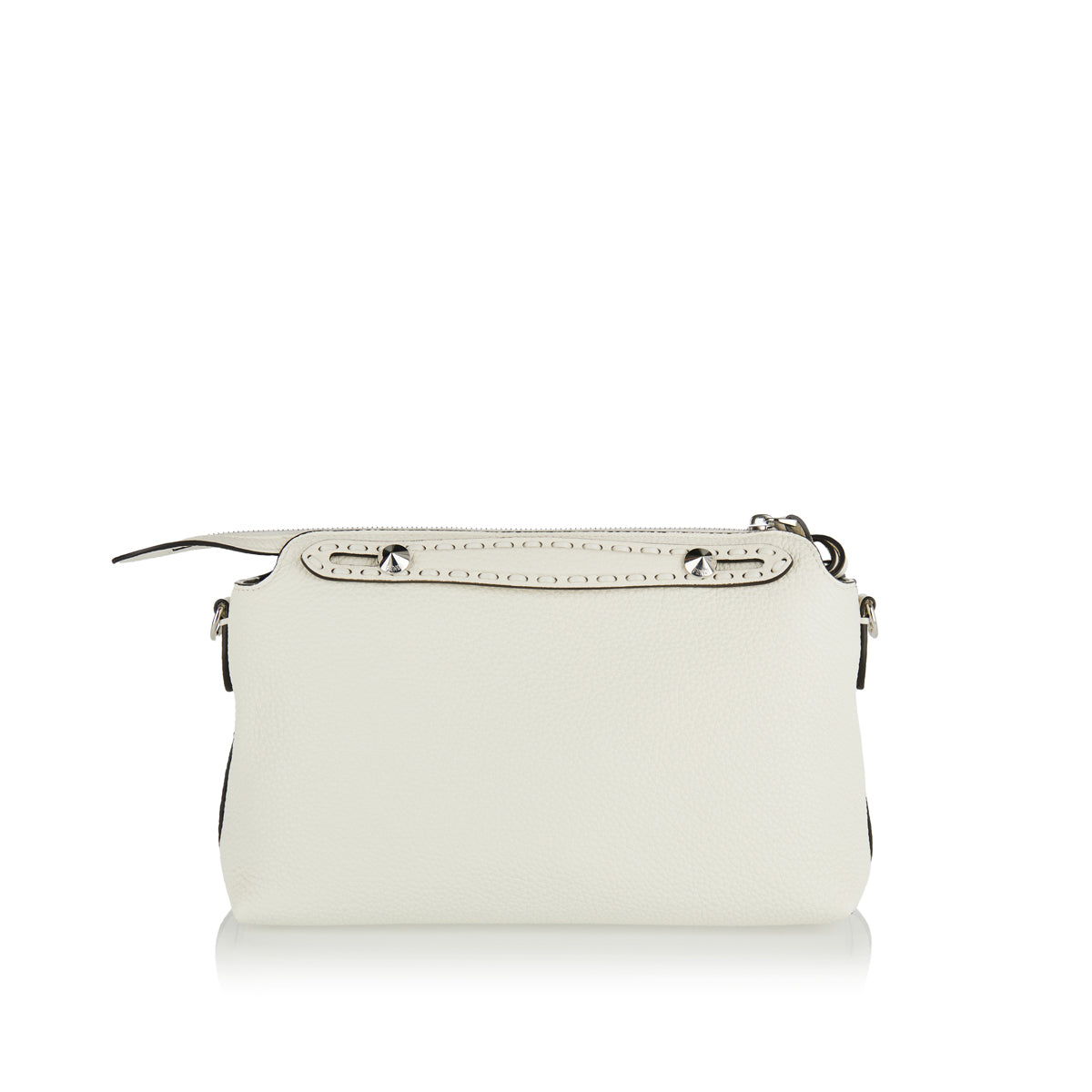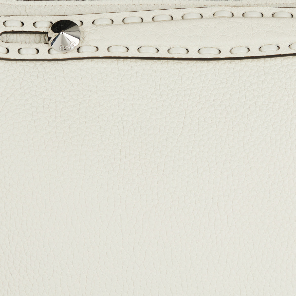 White Cuoio Romano leather medium bag by Fendi featuring 192 hand-sewn topstitches honoring the Maison's heritage. Metal-free tanned calfskin with palladium hardware, dual handles, and adjustable shoulder strap for versatile styling. Leather-lined interior with customizable charm. Made in Italy.