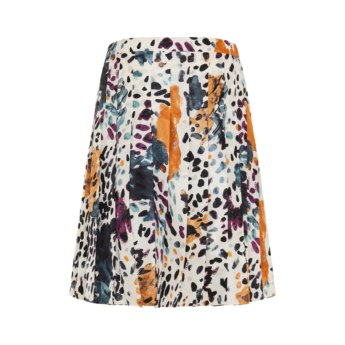 This Fendi silk midi skirt features a dynamic, multicolor print on luminous white silk. Designed with a regular waist and flared silhouette, it offers graceful movement and refined elegance — perfect for elevated daywear or sophisticated evening outfits.